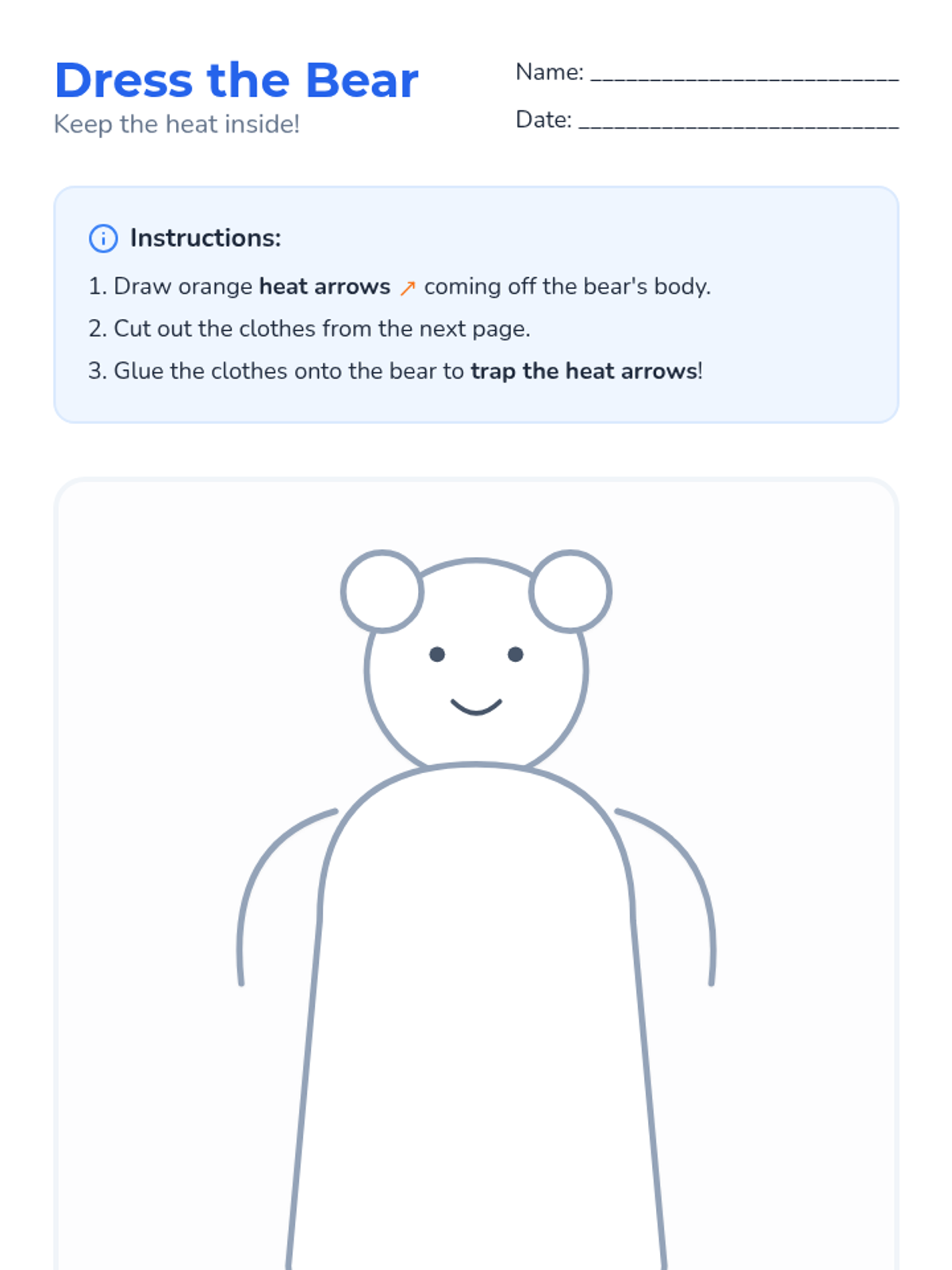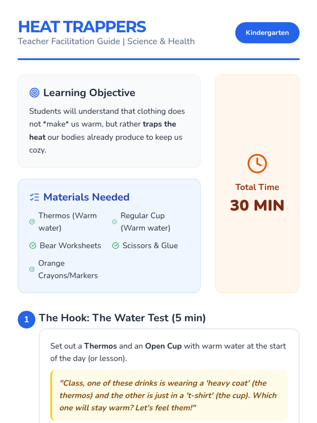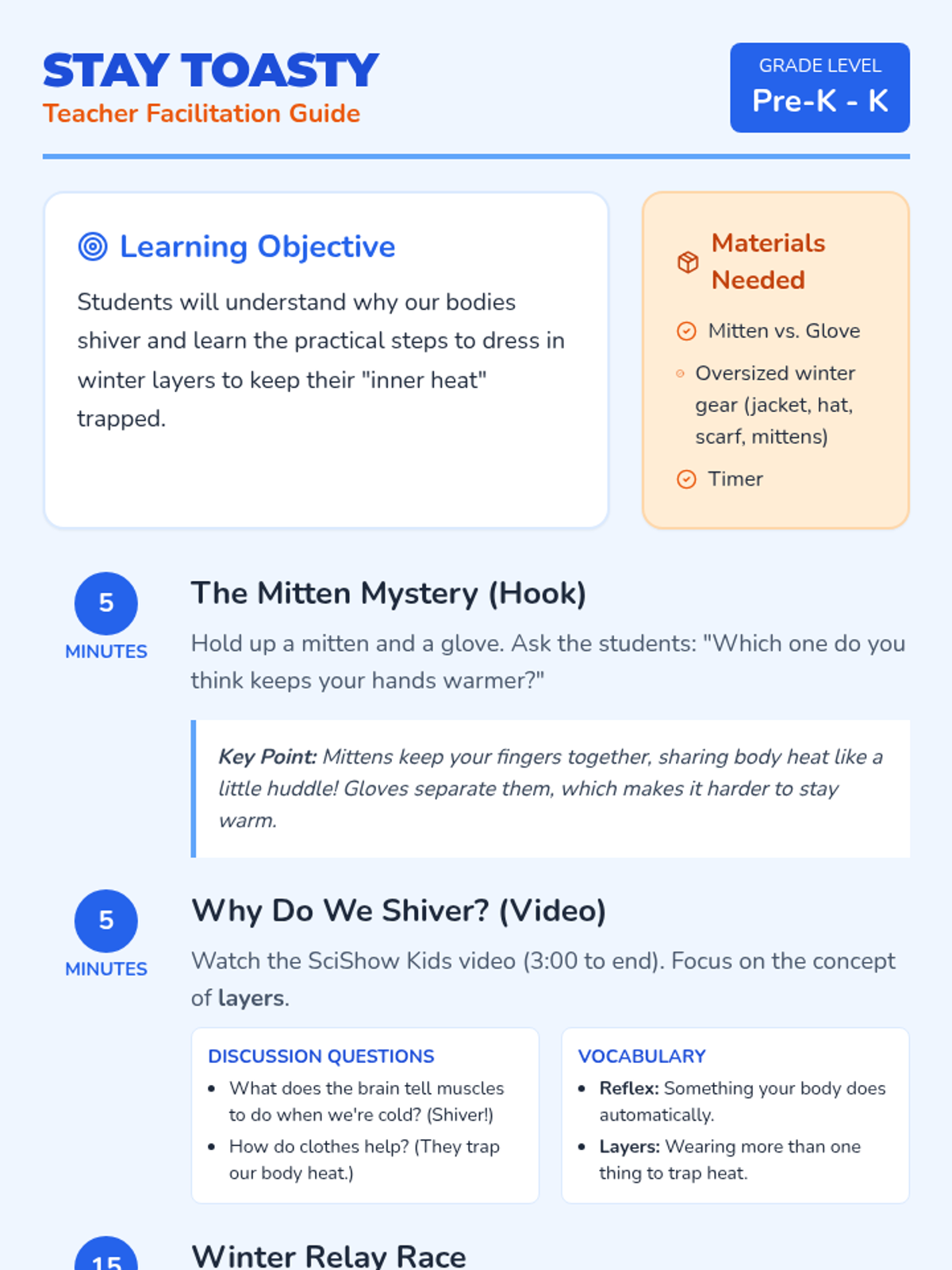 A hands-on lesson for Pre-K and Kindergarten students to learn the science of staying warm and the practical skill of dressing in winter layers. Features a science video, a high-energy relay race, and a mnemonic rhyme for dressing independently.