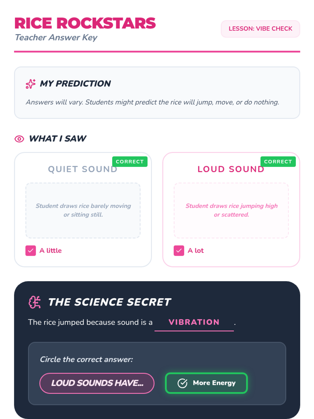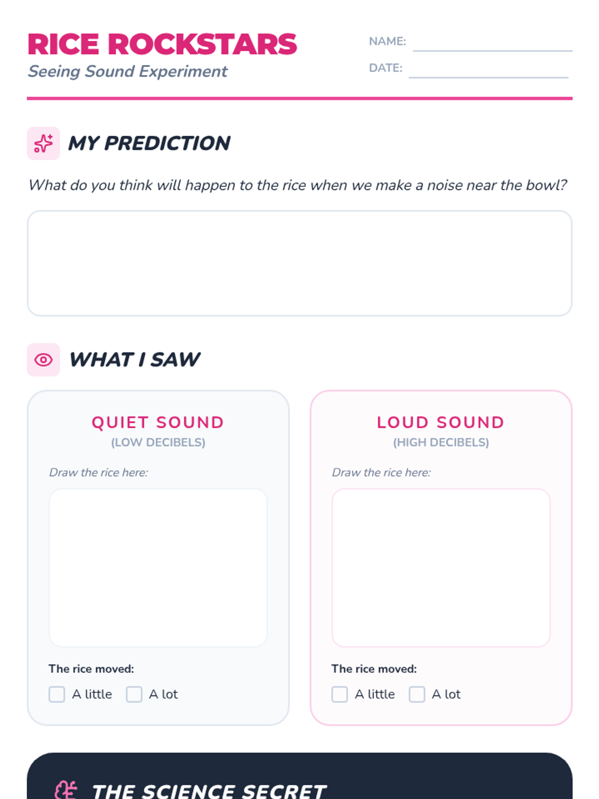 An interactive exploration of sound vibrations and volume where 2nd-grade students visualize sound using rice and investigate the relationship between volume and energy.
