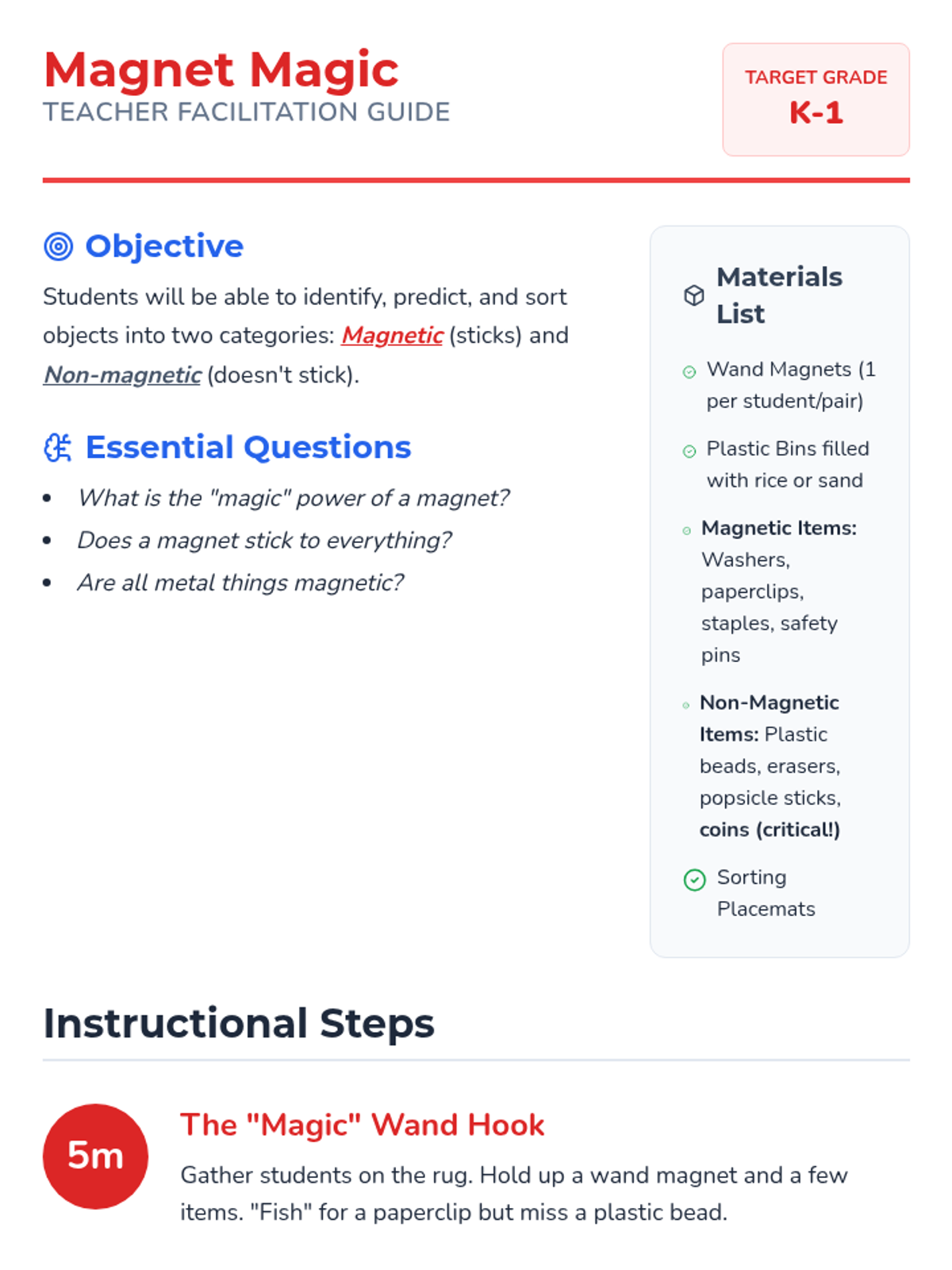 An introductory lesson on magnetism for K-1 students where they use 'magic' wand magnets to discover which materials are attracted to magnets and learn that not all metals are magnetic.
