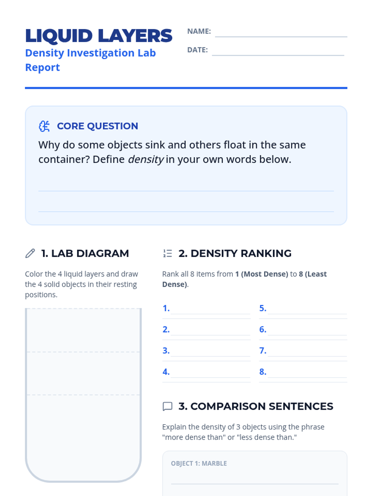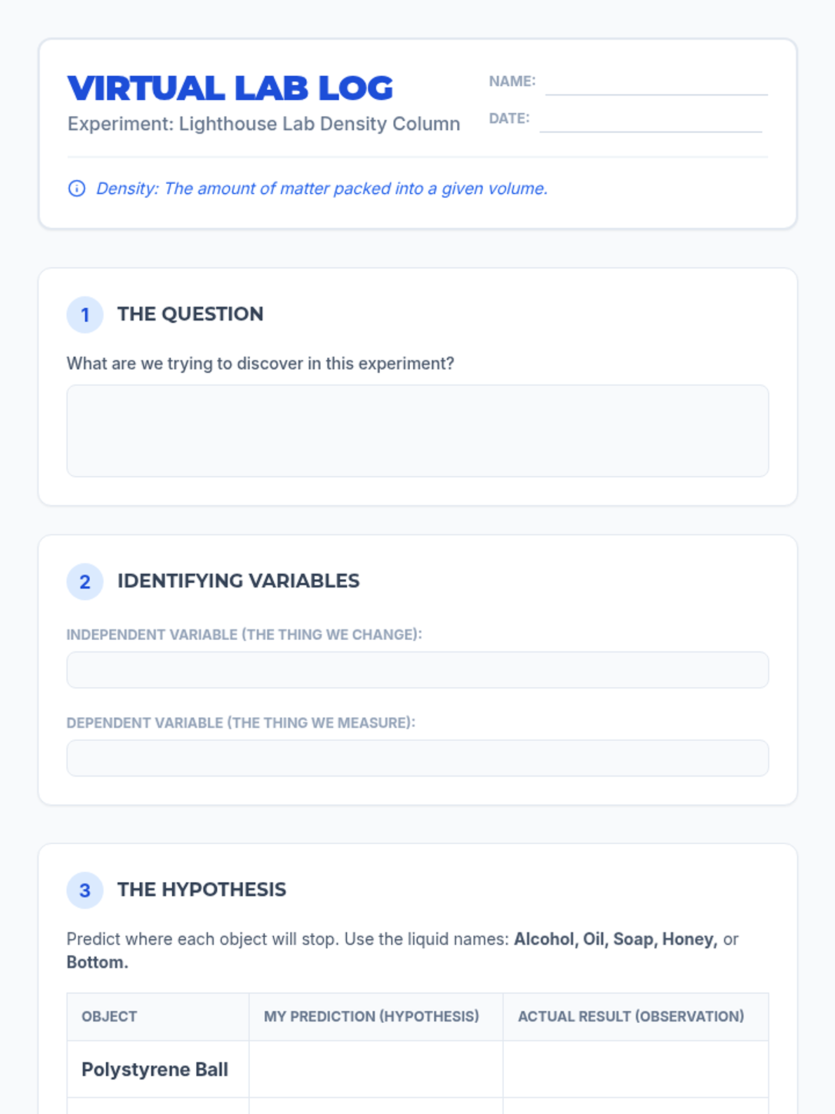 Students explore density through a virtual laboratory experiment, applying the scientific method to observe how different liquids and solids interact in a density column.