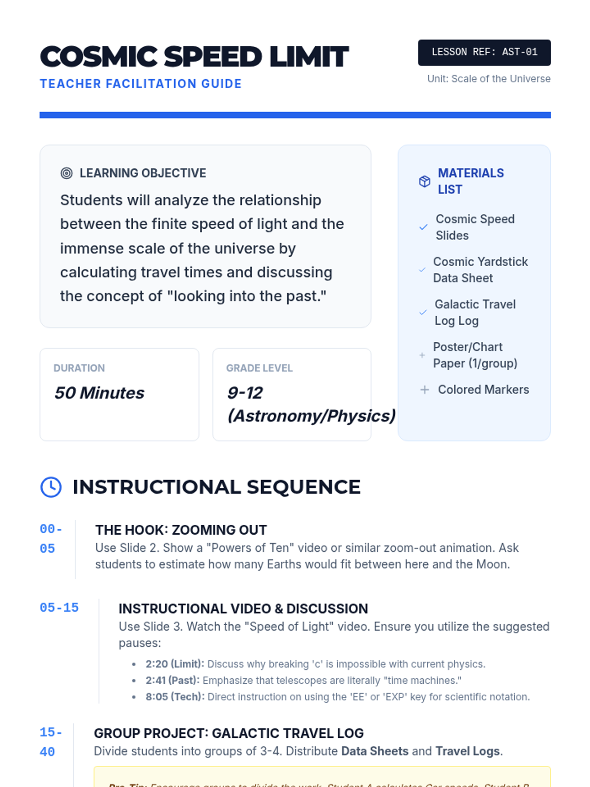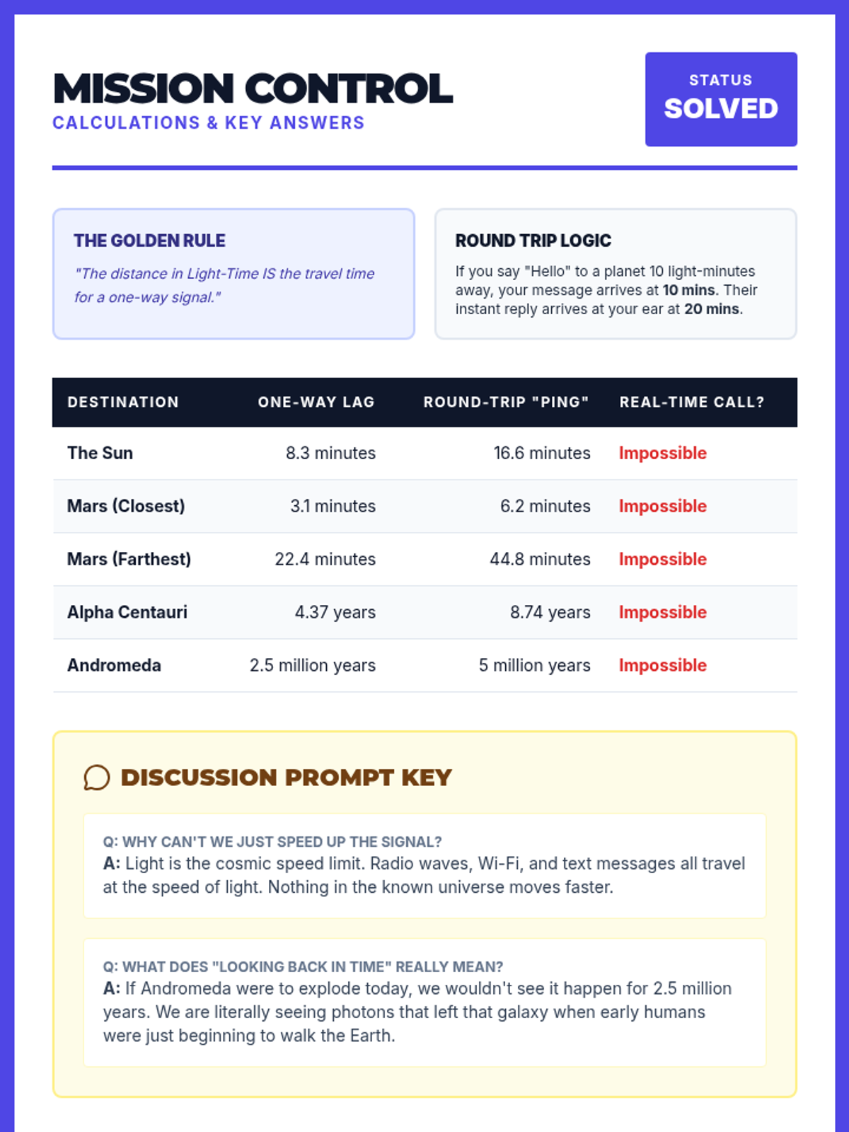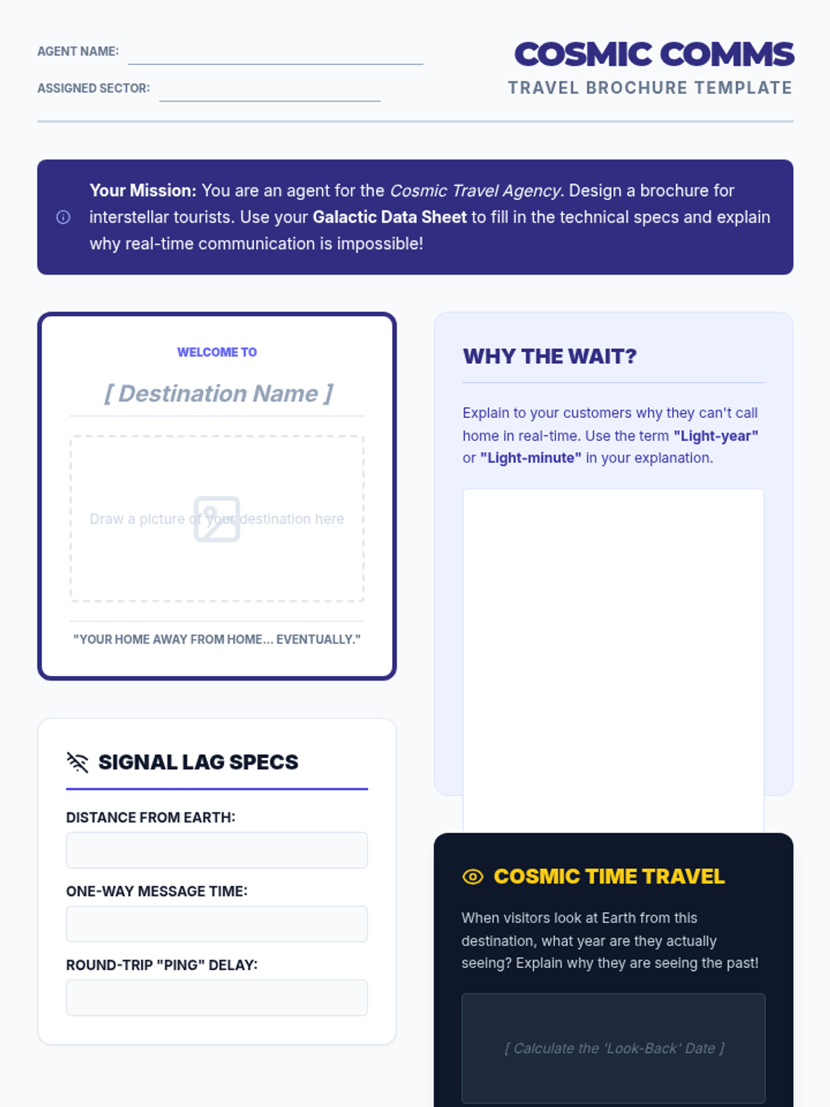 Students investigate the immense scale of the universe by calculating light-travel times. They will use the concept of light-years to understand why looking into space is looking into the past and create a travel brochure highlighting the 'communication delays' of interstellar travel.