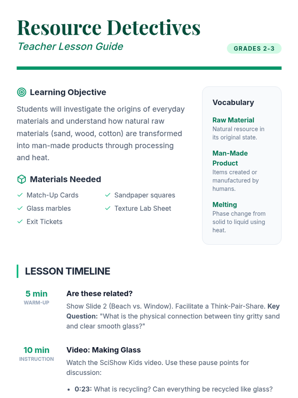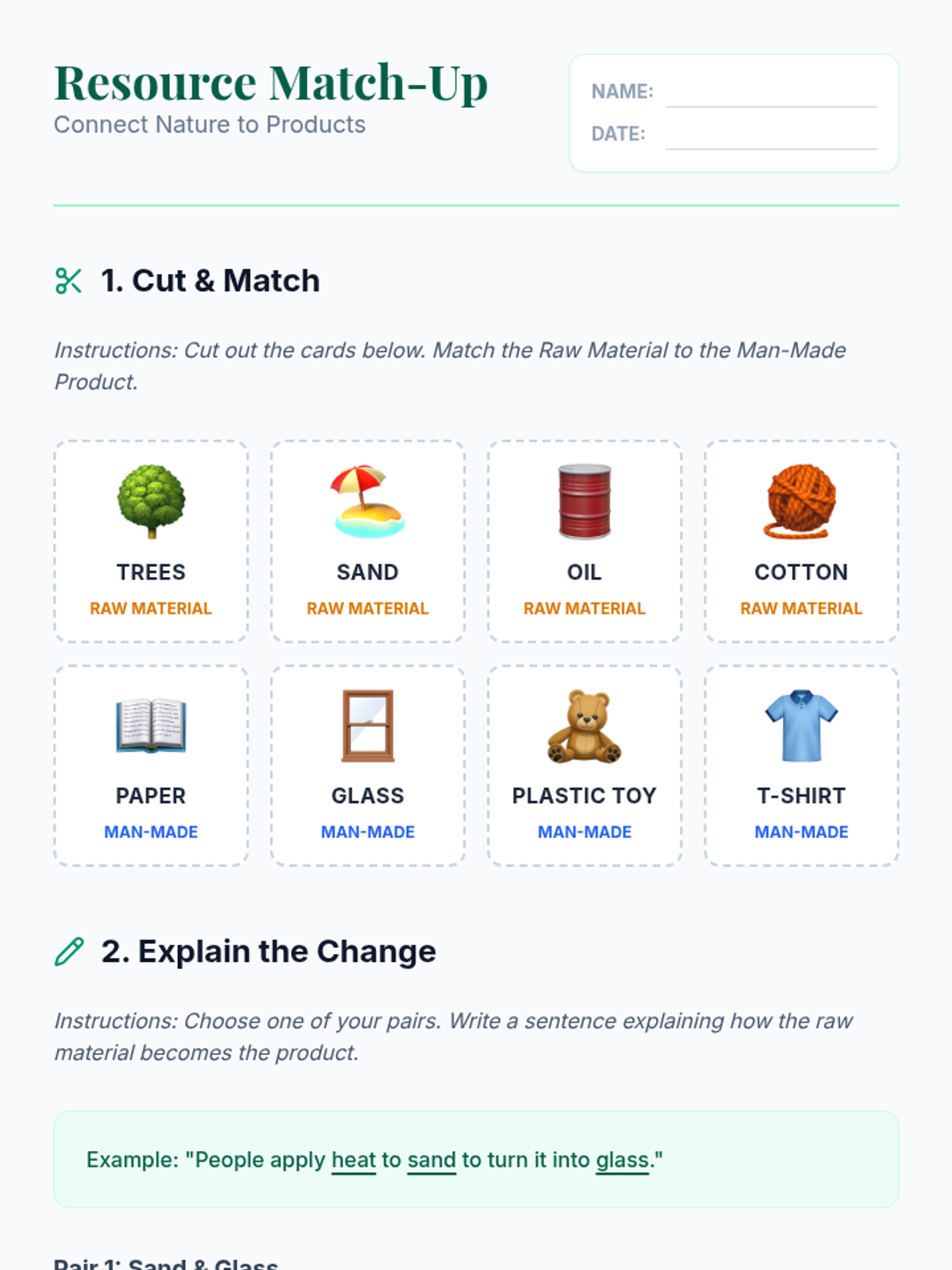 A hands-on investigation into how natural raw materials like sand, trees, and cotton are transformed into everyday man-made products through heat and processing.