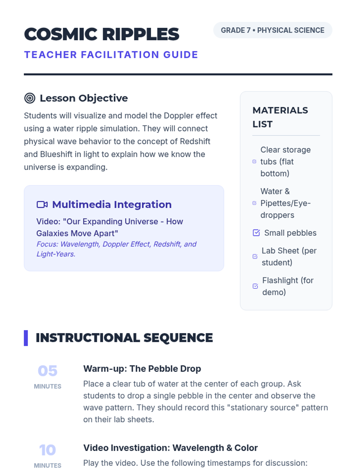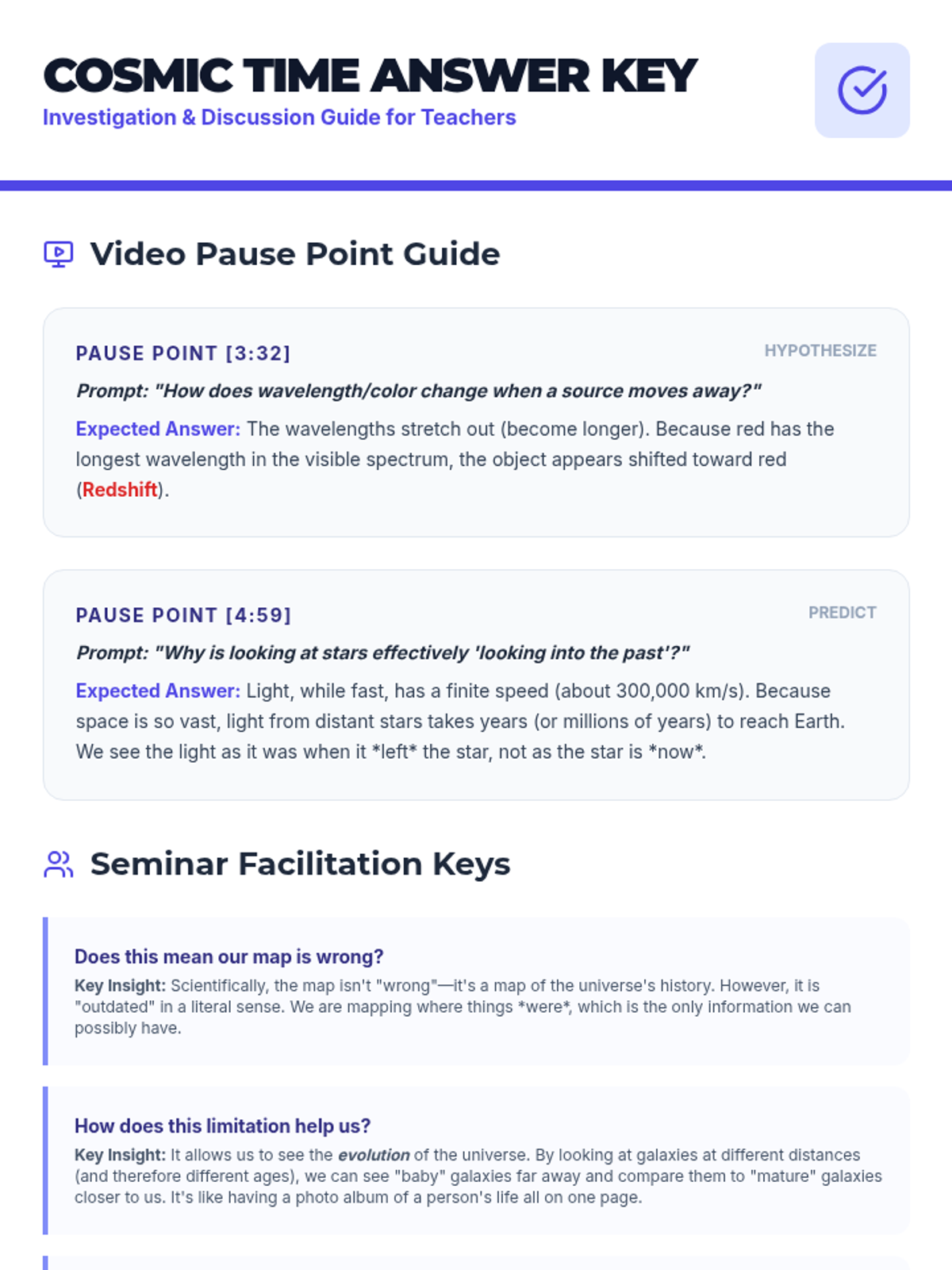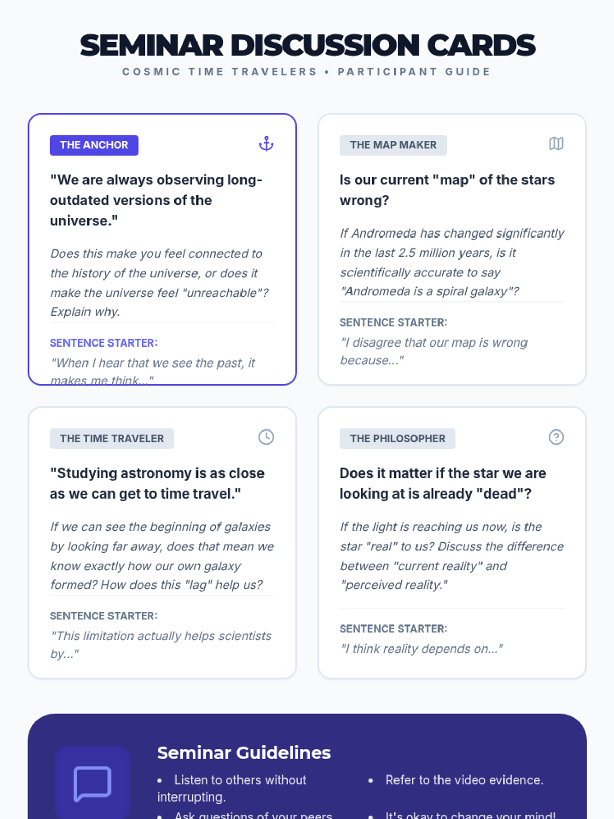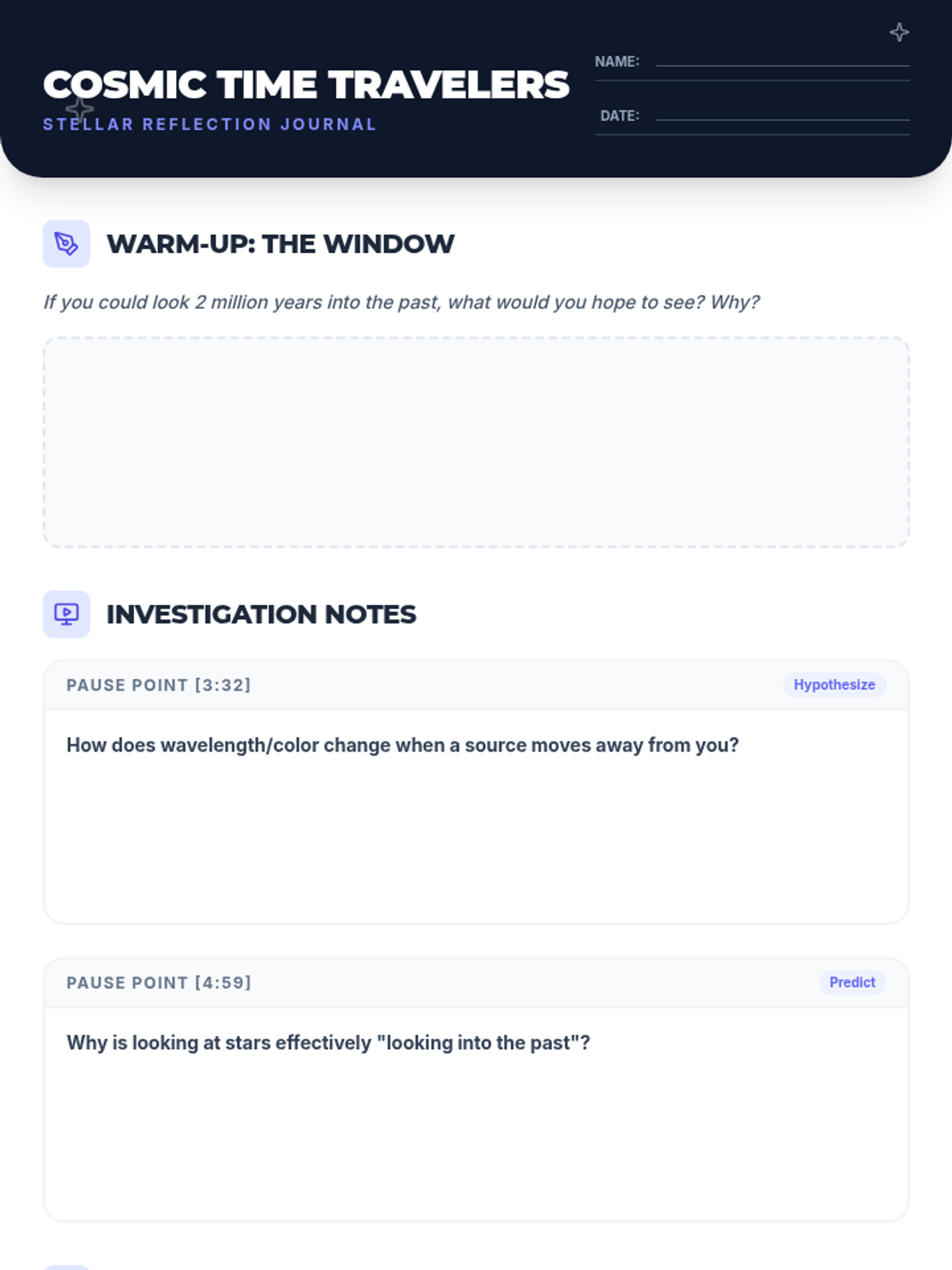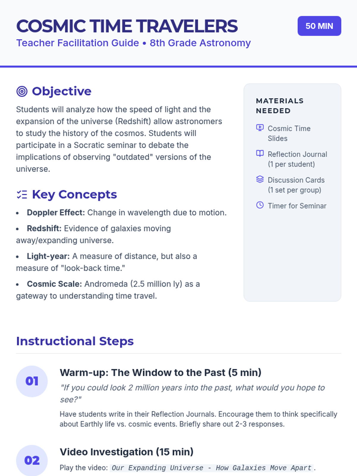 Students explore the Doppler effect, redshift, and the concept of 'light-time' to understand why looking at the stars is effectively looking into the past. The lesson culminates in a Socratic seminar focused on the philosophical and scientific implications of observing an 'outdated' universe.
