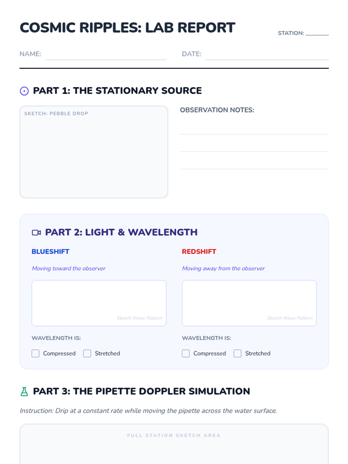 Students explore the Doppler effect through a hands-on water simulation and a video-guided study of redshift and blueshift in the expanding universe.