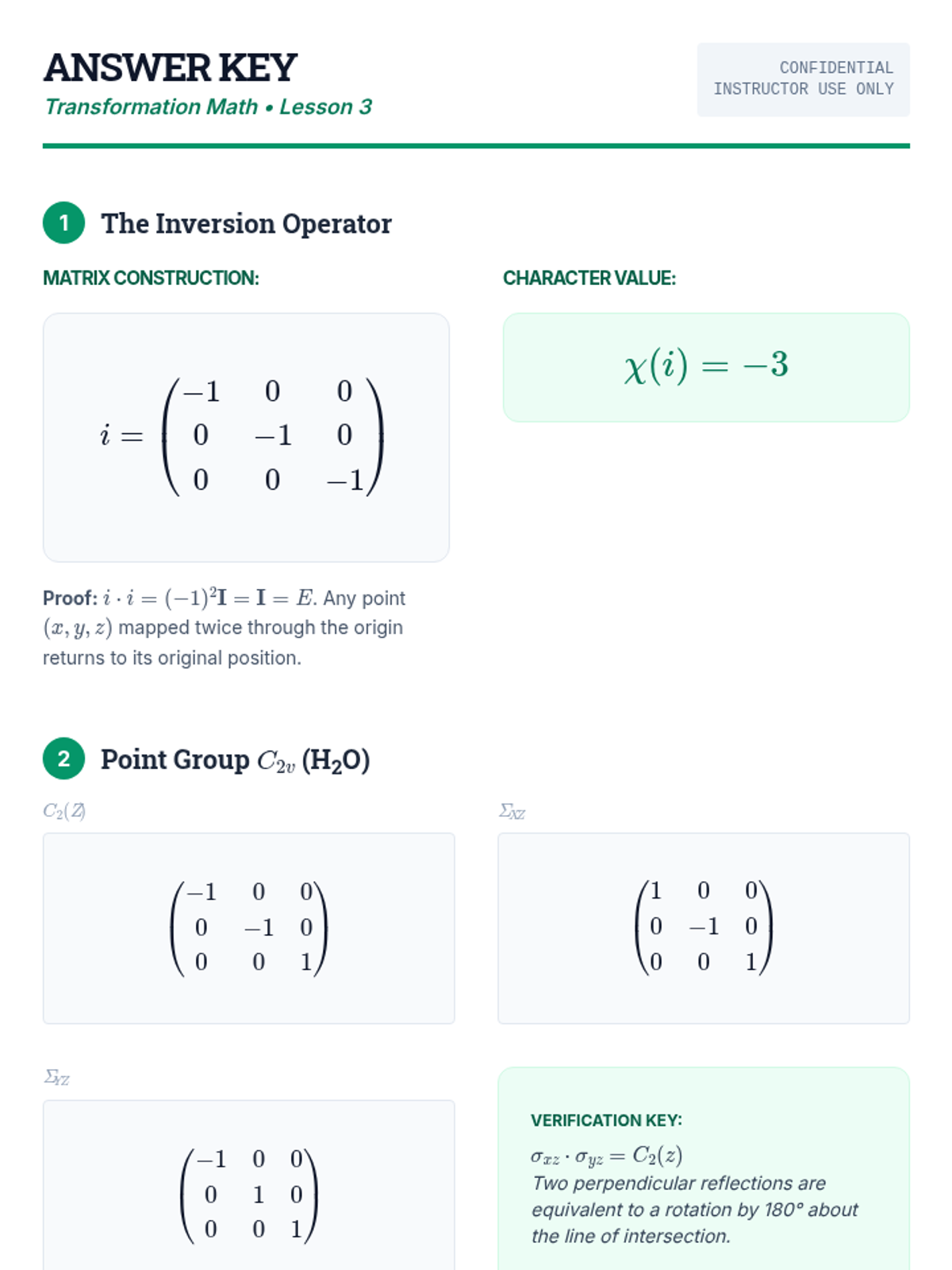 Students define symmetry elements (planes, axes, centers of inversion) and perform operations on various 2D polygons and 3D polyhedra, establishing the mathematical criteria for a group.