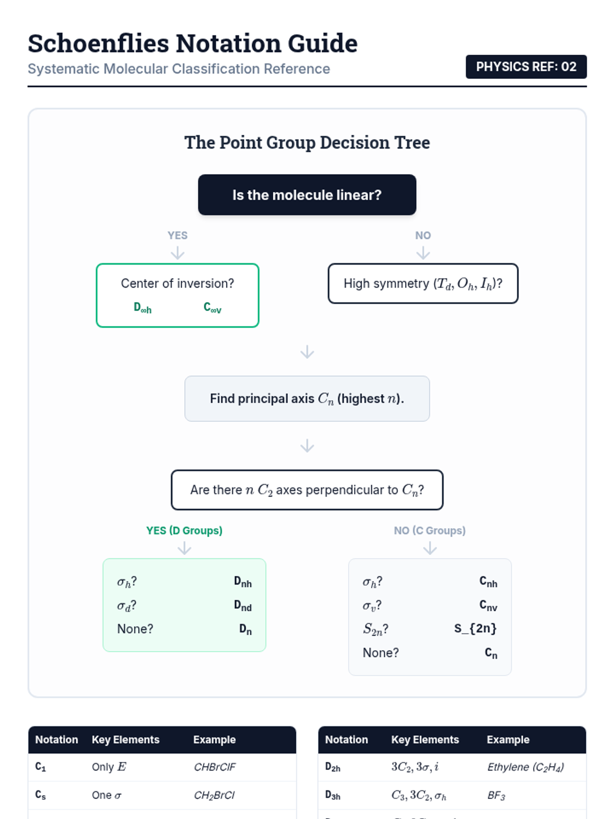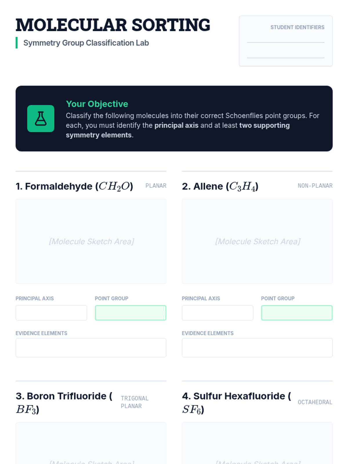 Focusing on molecular geometry, students learn to classify 3D structures into specific point groups using Schoenflies notation through systematic flow-chart analysis.