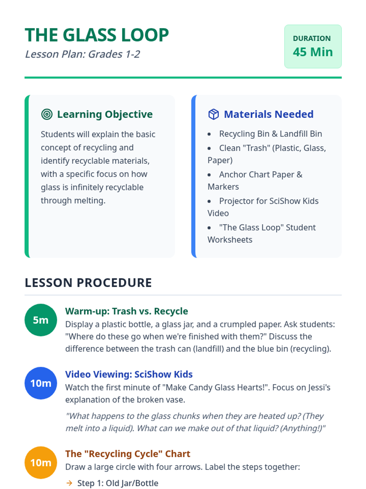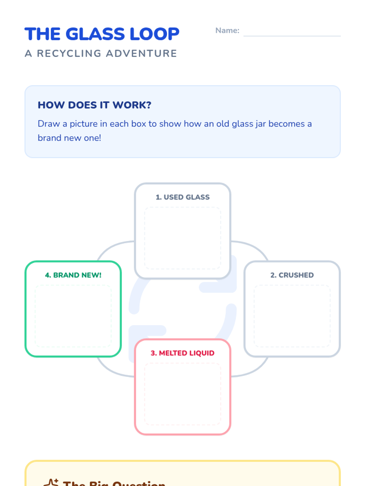 Students will explore the concept of recycling through the lens of glass, learning how items are transformed through heat and melting to be used over and over again.