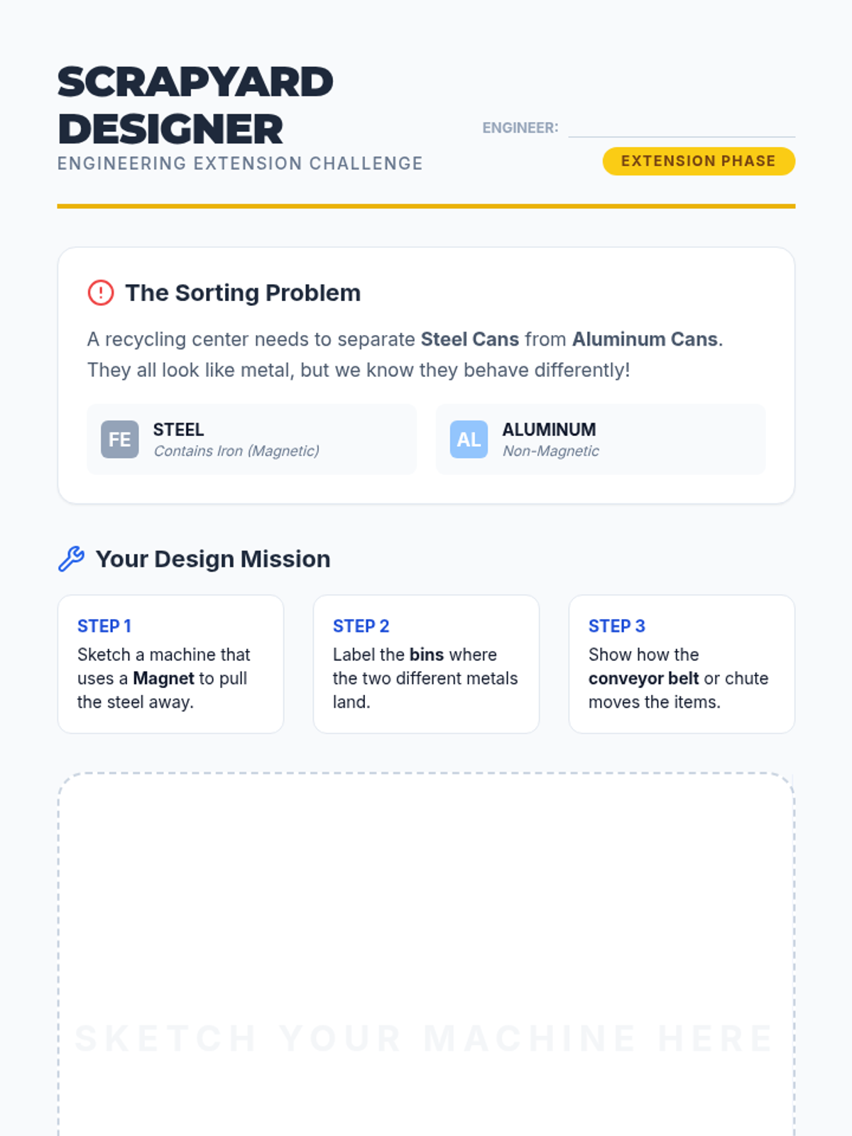 A hands-on engineering lesson where students apply knowledge of physical properties (magnetism) to design an automated recycling separation system. Students analyze a video model of magnetic separation and then scale the concept to separate steel, aluminum, and plastic.