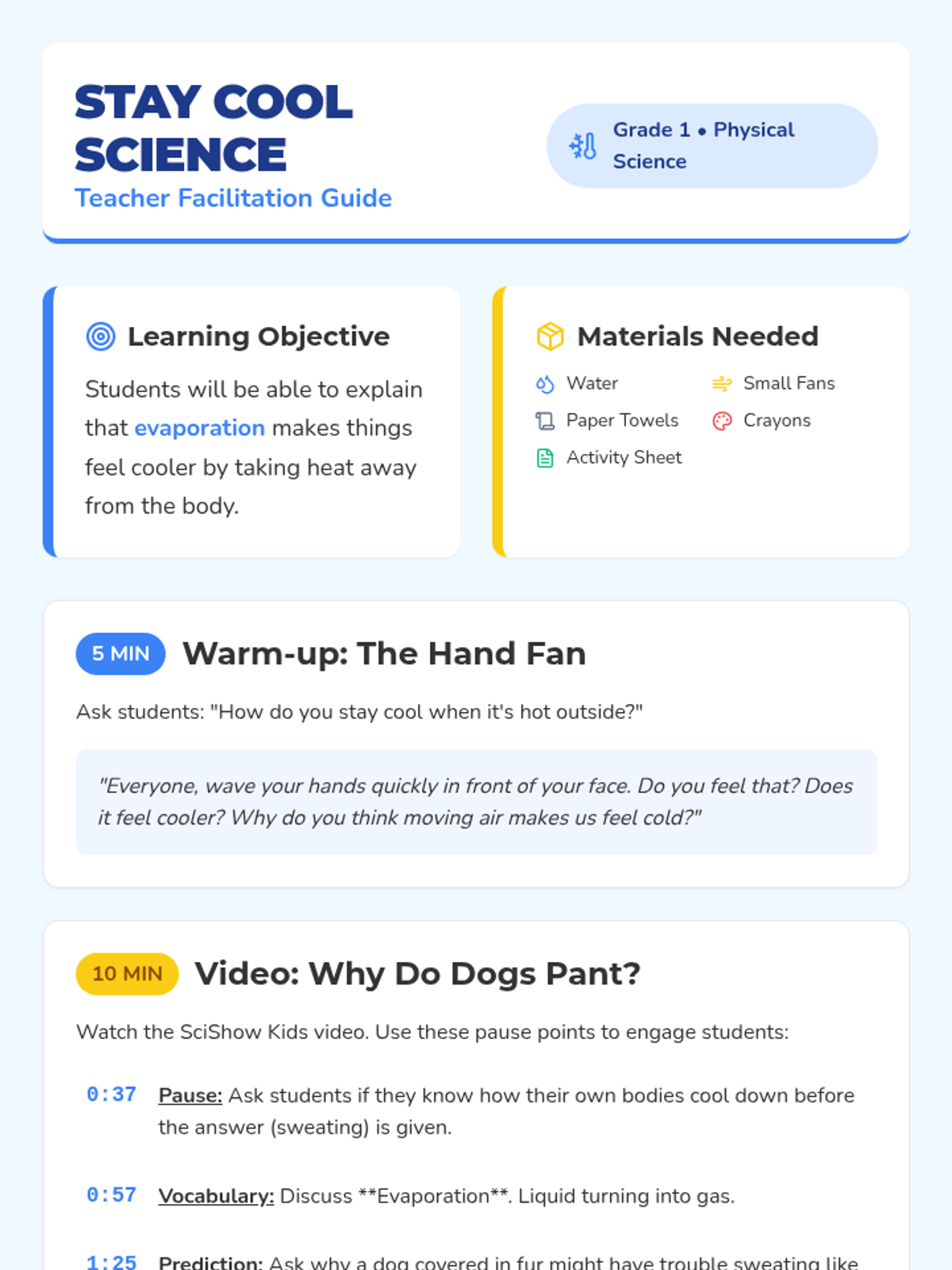 A hands-on science lesson for Kindergarten and 1st grade students to understand how sunscreen protects skin using a 'Sunscreen Painting' experiment and the SciShow Kids video. Students will explore the 'sponge and mirror' analogy and observe the effects of sunlight on construction paper.