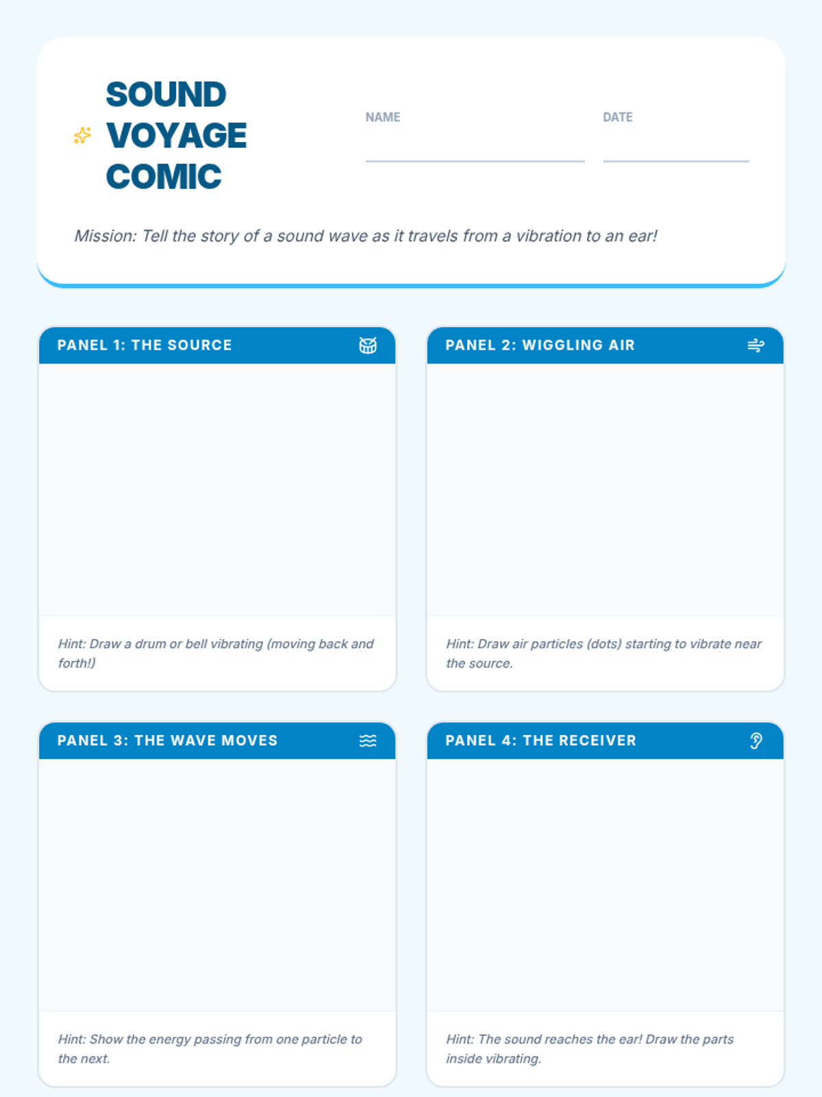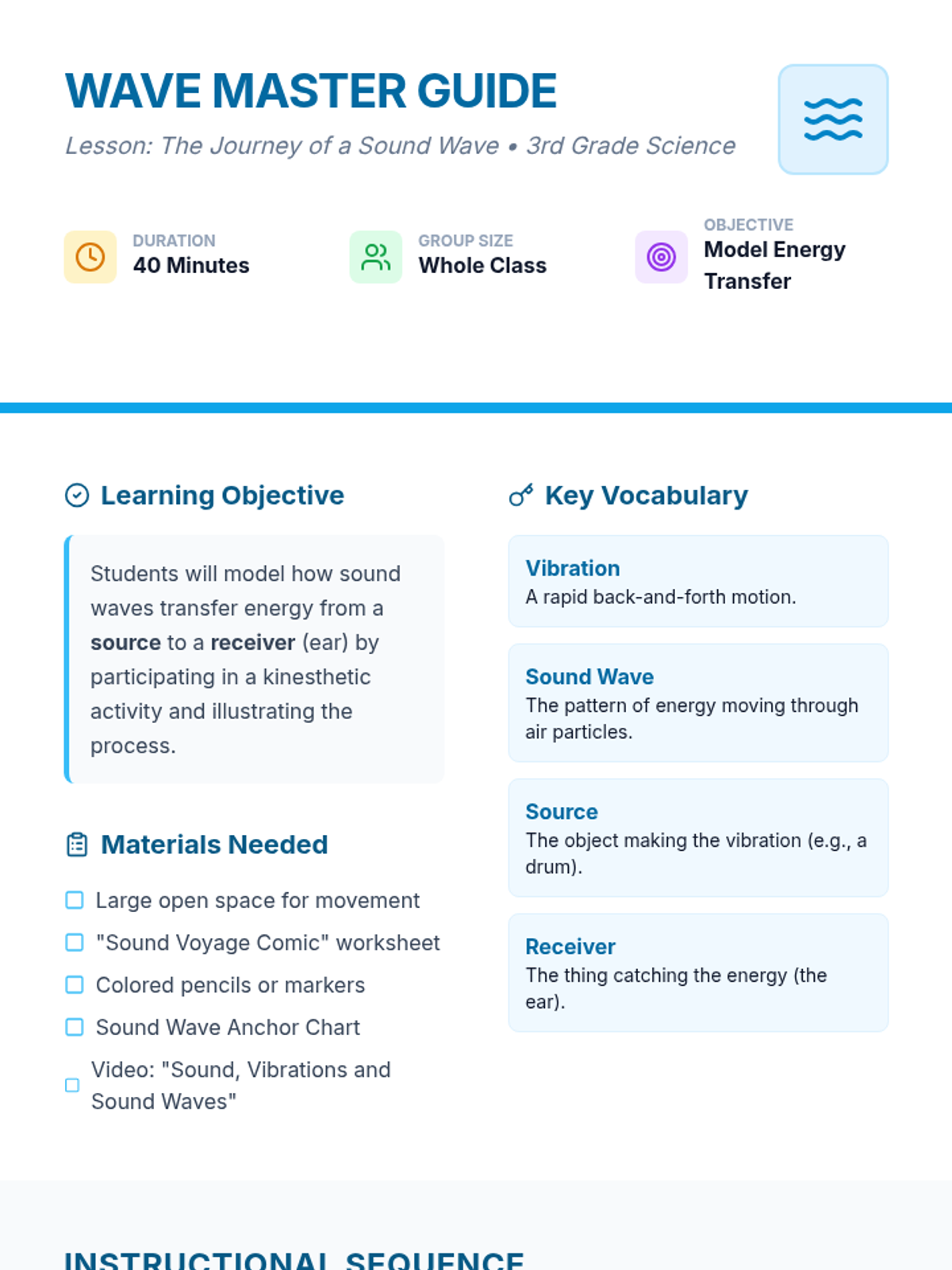 A 3rd-grade science lesson where students explore how sound energy travels from a source to the ear using a kinesthetic 'human wave' model and creative comic storytelling.