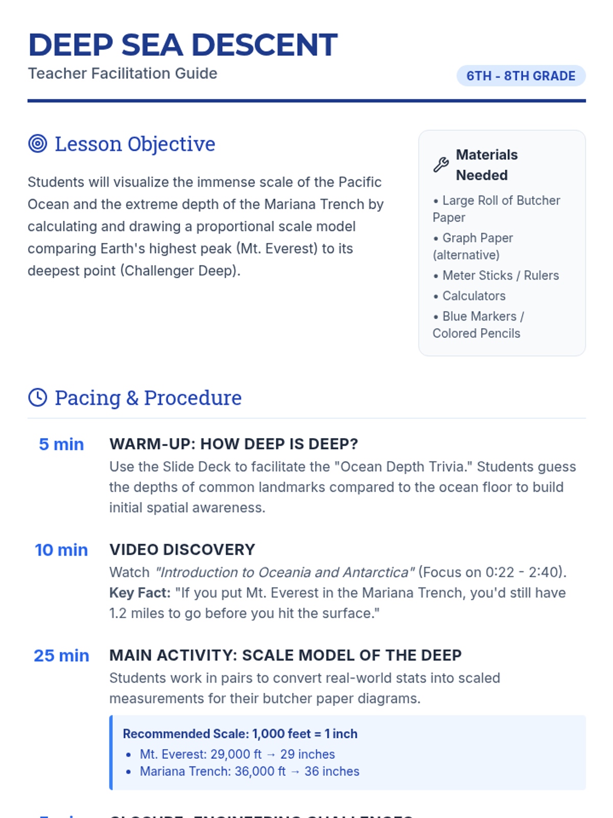 A STEM-focused lesson where students explore the extreme depths of the Pacific Ocean by creating a proportional scale model comparing Mount Everest to the Mariana Trench. The lesson utilizes a world geography video to provide context on Oceania's physical characteristics and uses math to visualize oceanic scale.