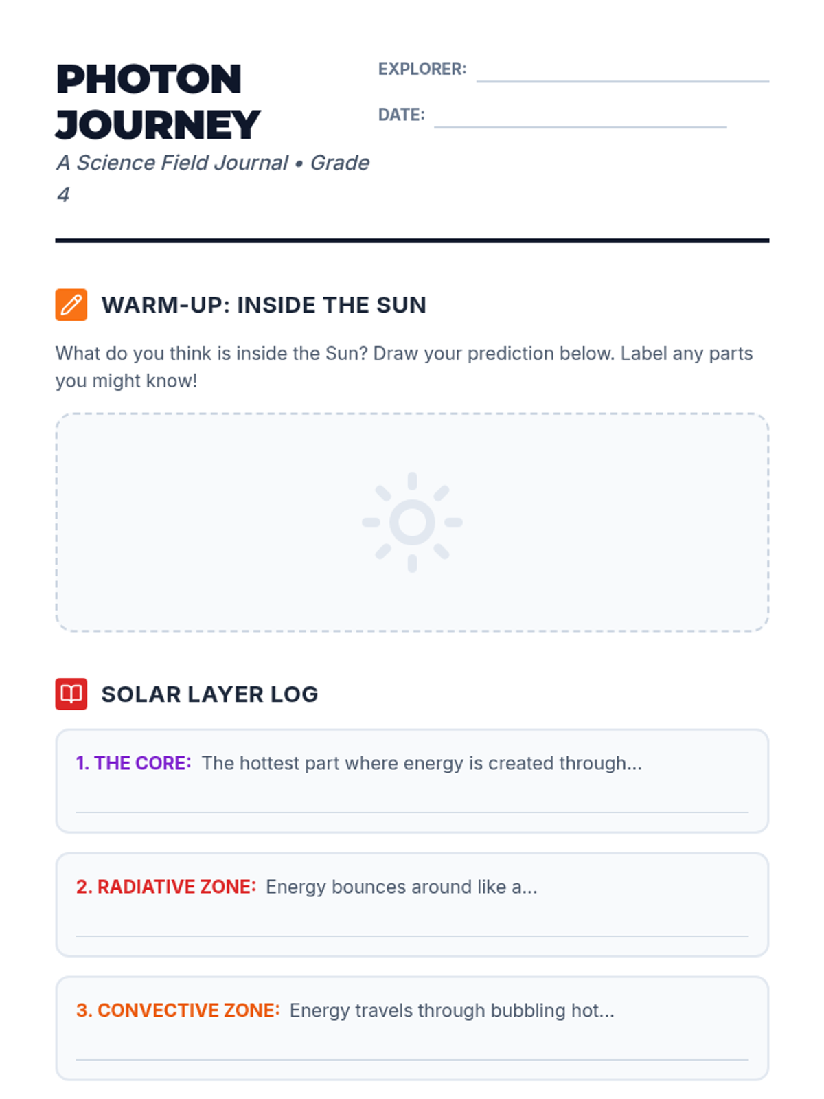 A lesson exploring the internal structure of the sun and the incredible million-year journey energy takes from the core to the surface through the radiative and convective zones.