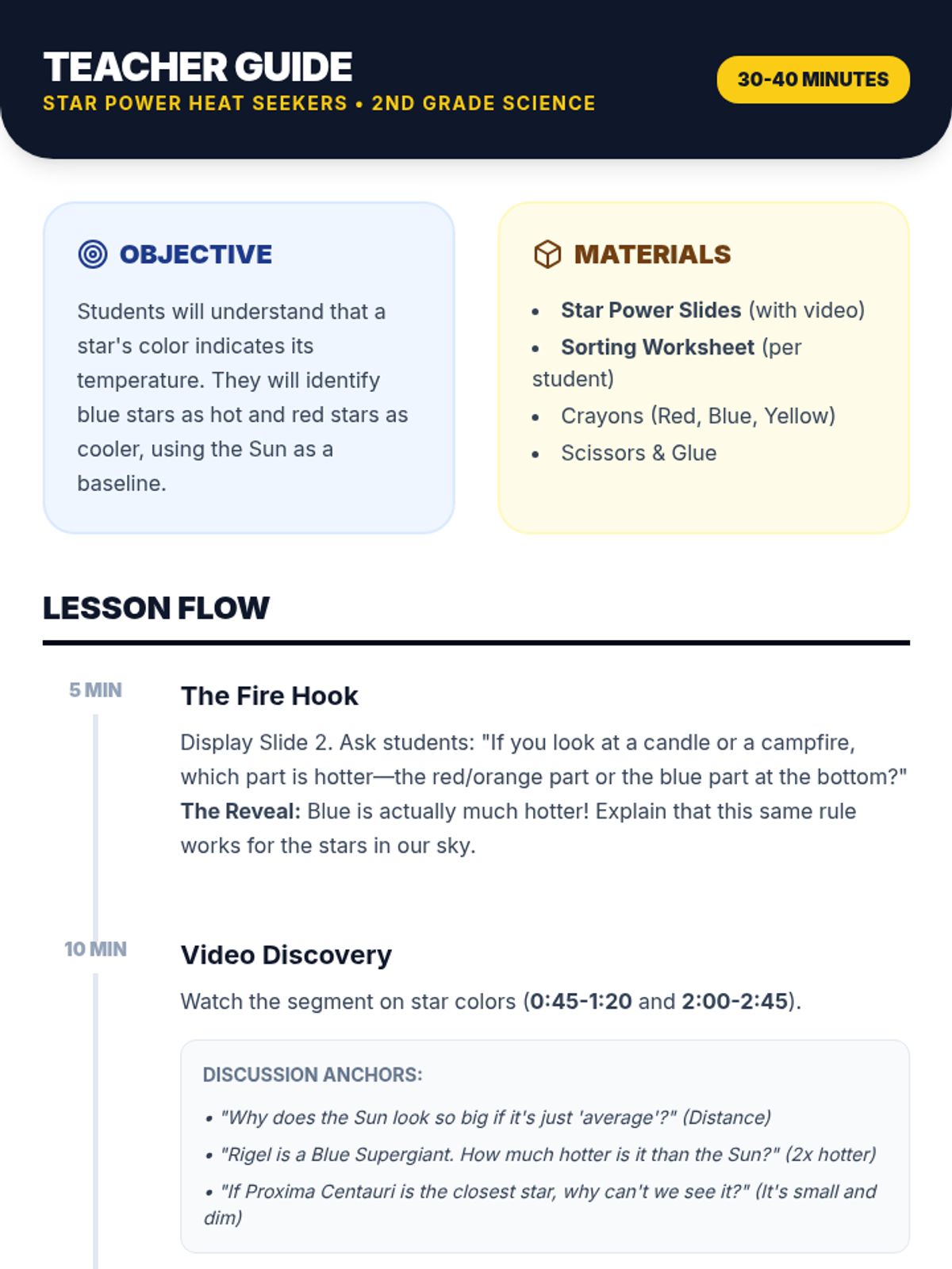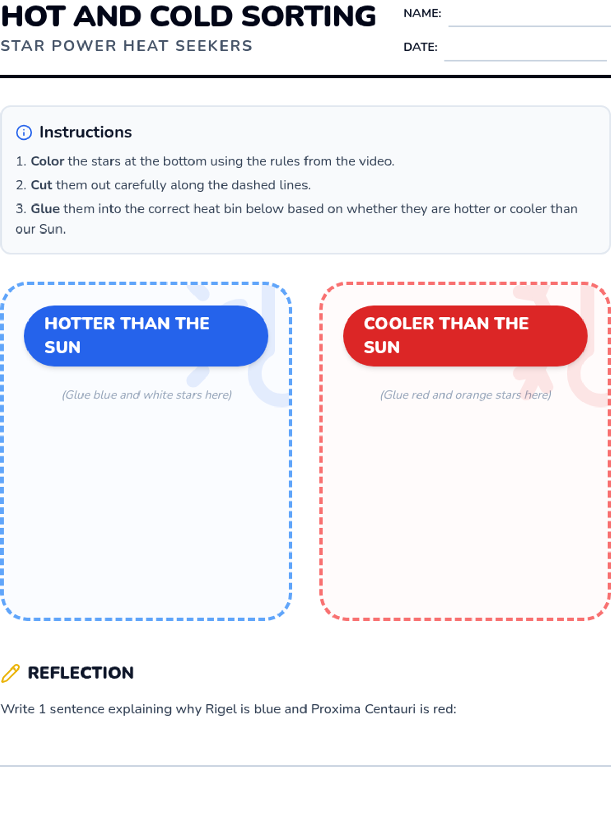 In this lesson, 2nd-grade students explore the relationship between star color and temperature. They will compare the Sun (a Yellow Dwarf) to the massive, blue Rigel and the small, red Proxima Centauri, ultimately sorting stars by heat levels.