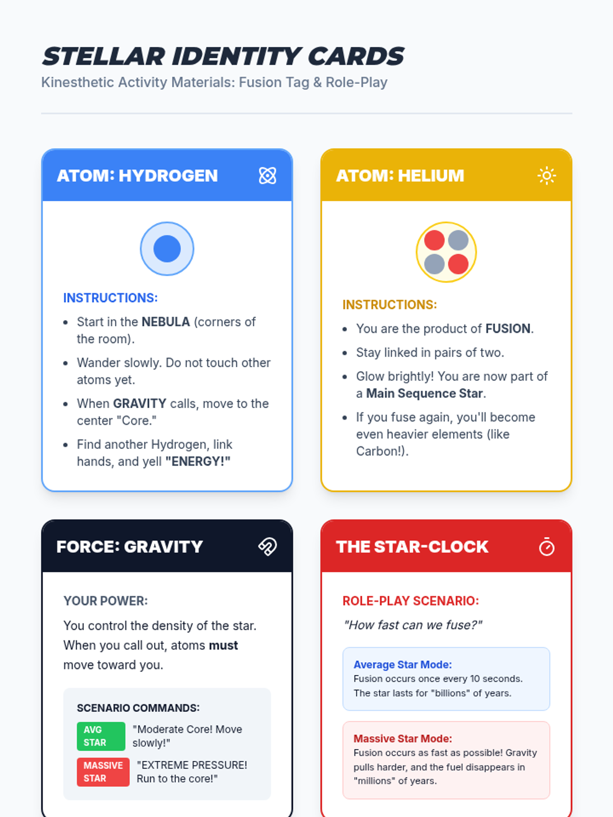 Students explore the process of nuclear fusion through a kinetic modeling activity where they act as hydrogen atoms fusing into helium, releasing energy along the way. The lesson covers the fuel of stars and why they eventually burn out.