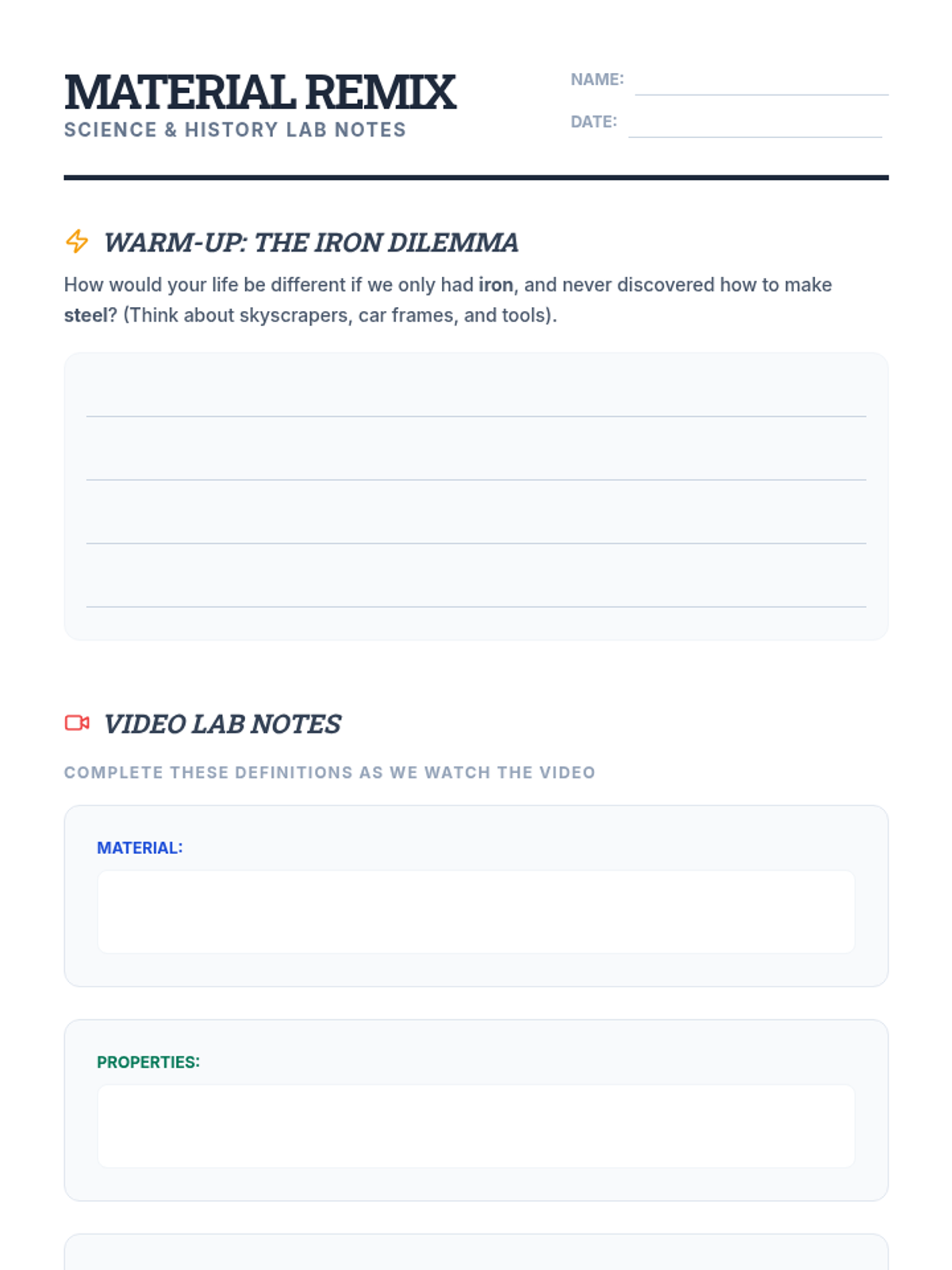 A 6th-grade science and history lesson where students explore how material scientists improve substances by changing their properties, focusing on historical shifts like iron to steel and ancient concrete.