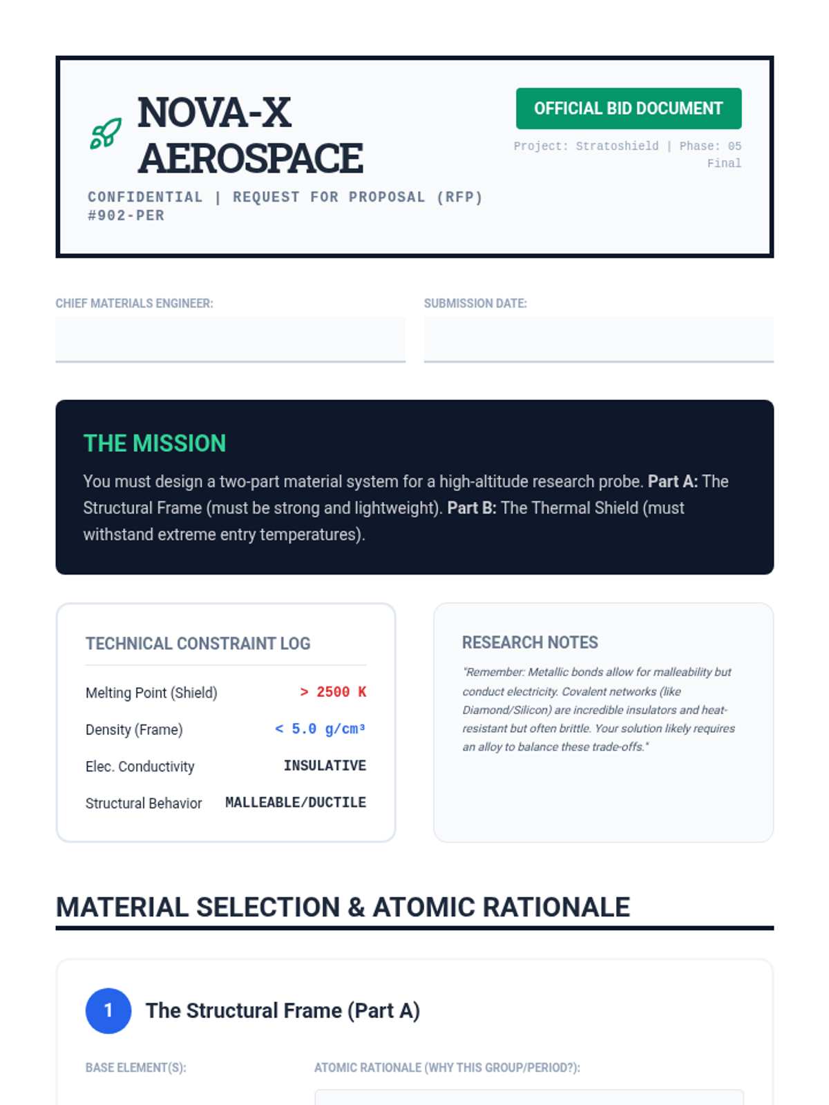 A culminating design challenge where students act as materials engineers to propose elements for specific aerospace and technological tasks.
