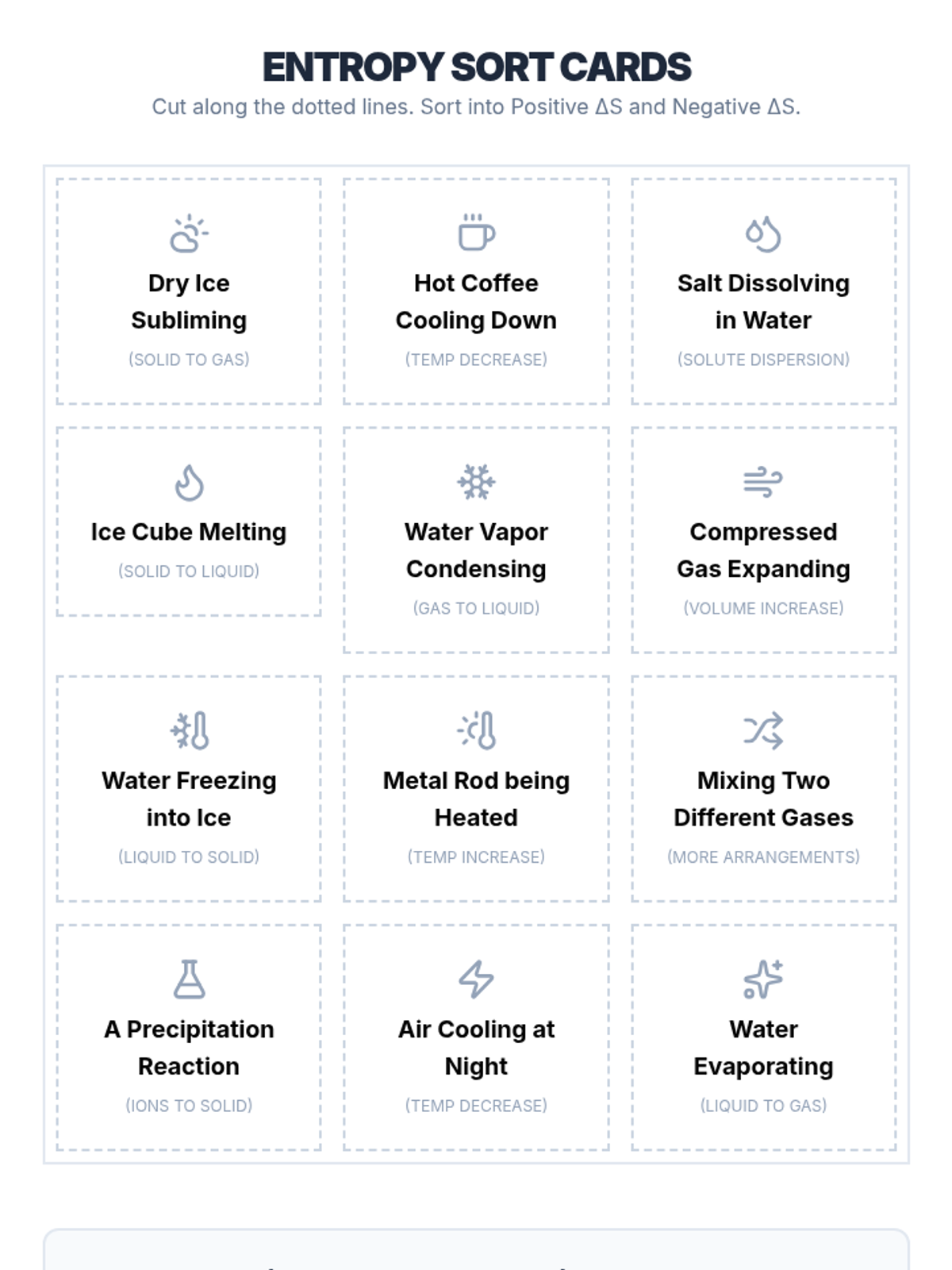 This lesson introduces entropy as a measure of disorder and the 2nd Law of Thermodynamics. Students will use phase changes and temperature fluctuations to predict entropy changes, culminating in an analysis of how local entropy decreases (like freezing) fit into the universal law.