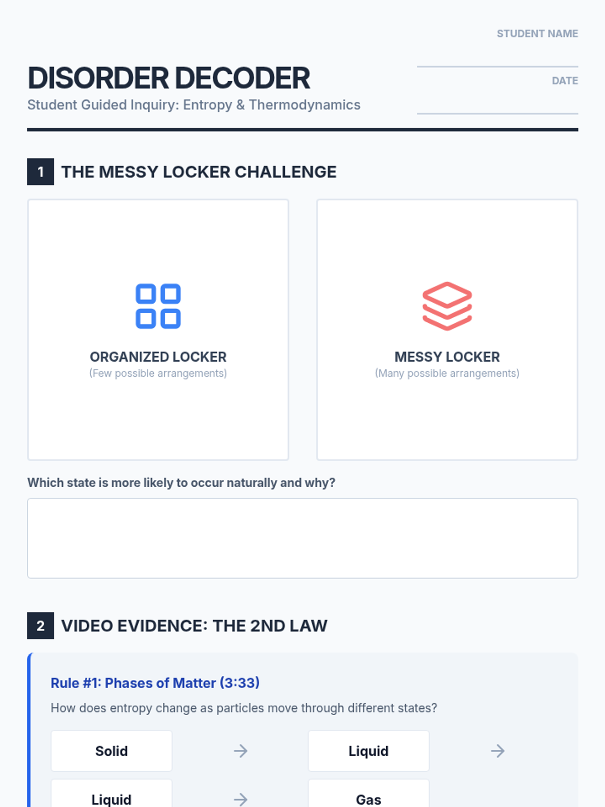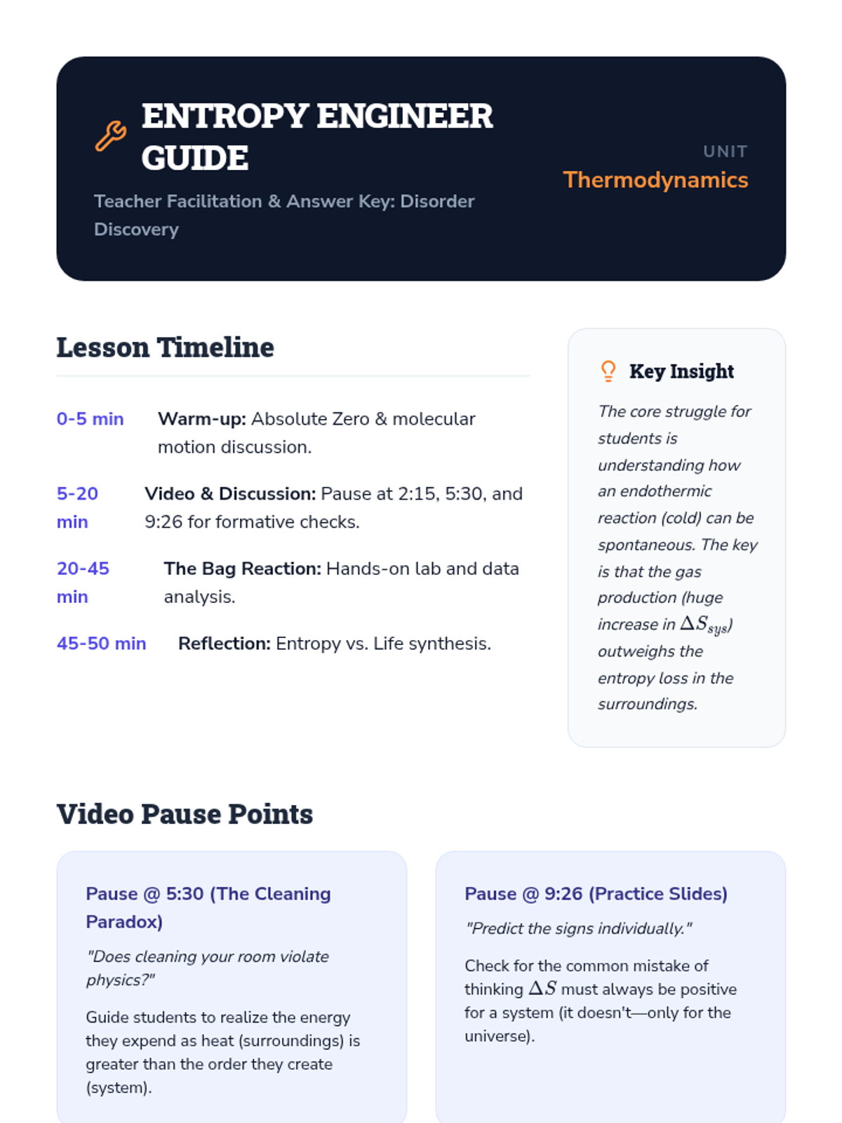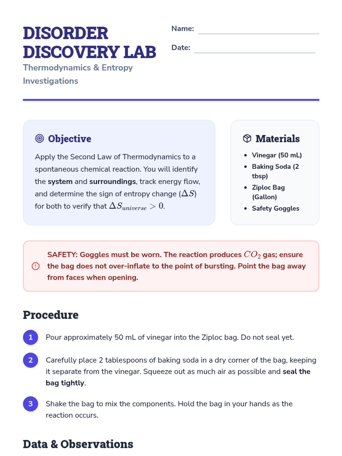 A high school physics lesson exploring the Second Law of Thermodynamics through the lens of entropy, system-surrounding interactions, and a hands-on endothermic reaction lab. Students will analyze why spontaneous processes occur even when local order increases or temperature drops.
