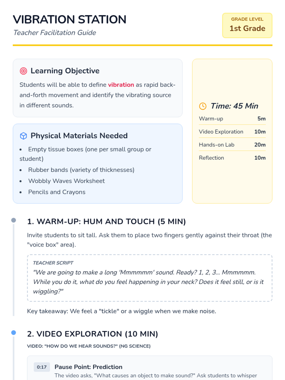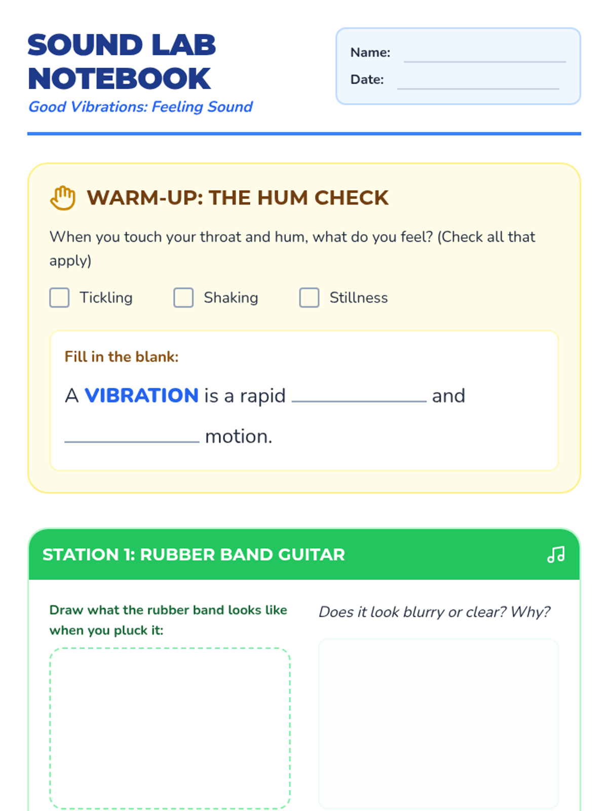 A hands-on introductory lesson where 1st graders explore sound through their own vocal cords and rubber band 'guitars' to define and identify vibrations.