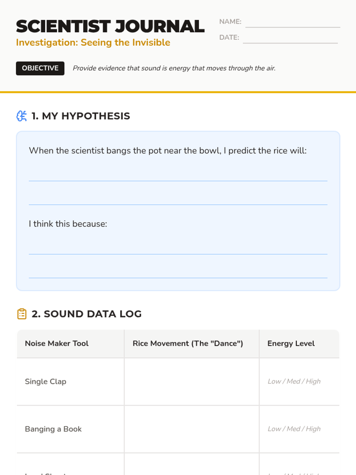 A hands-on science lesson for 3rd graders that uses a 'dancing rice' experiment to provide visible evidence that sound is a form of energy that travels through air as waves. Students will make predictions, observe vibrations in action, and record data on how different volumes affect matter.