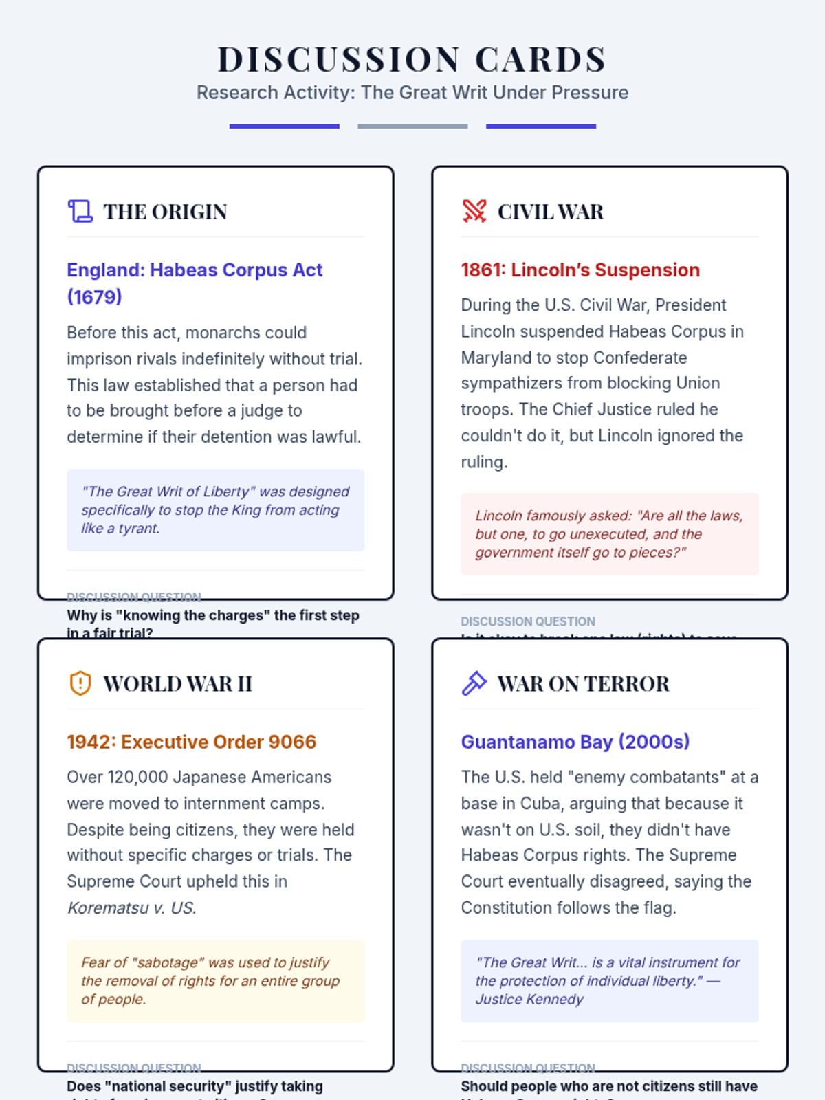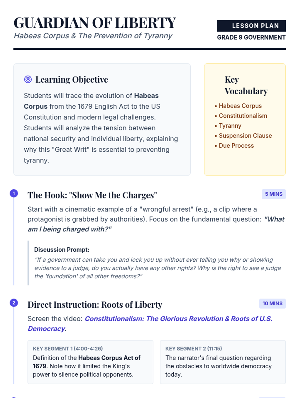 A 9th-grade government lesson tracing the history of Habeas Corpus from the 1679 English Act to modern-day challenges, focusing on its role in preventing tyranny and the ethics of its suspension during crises.