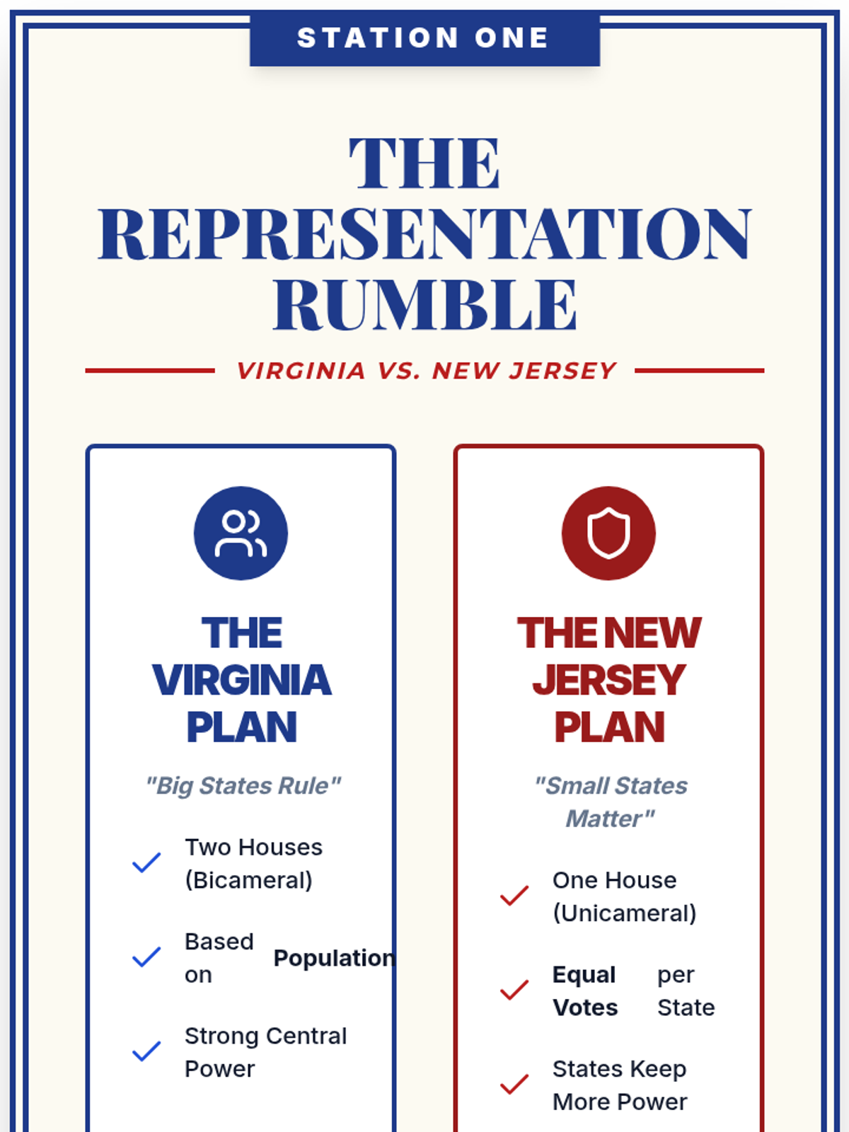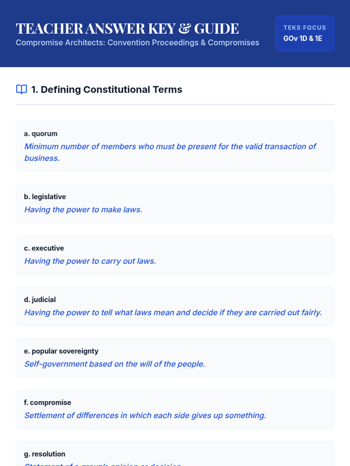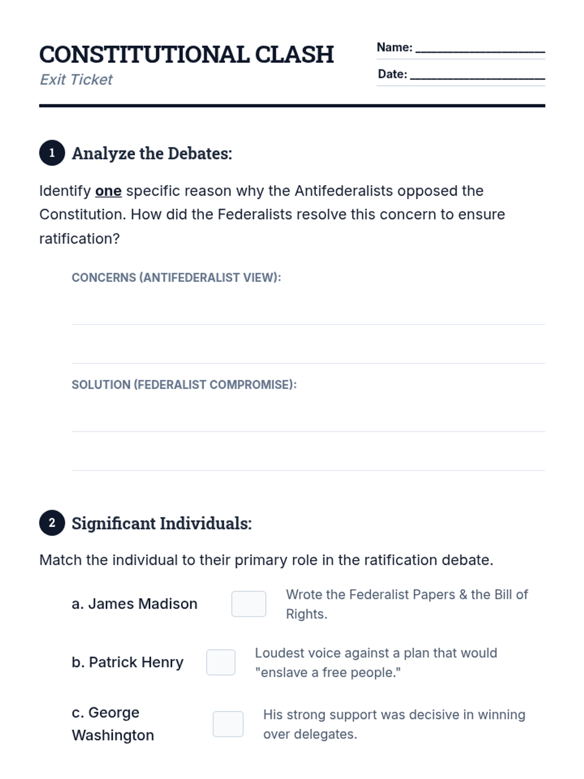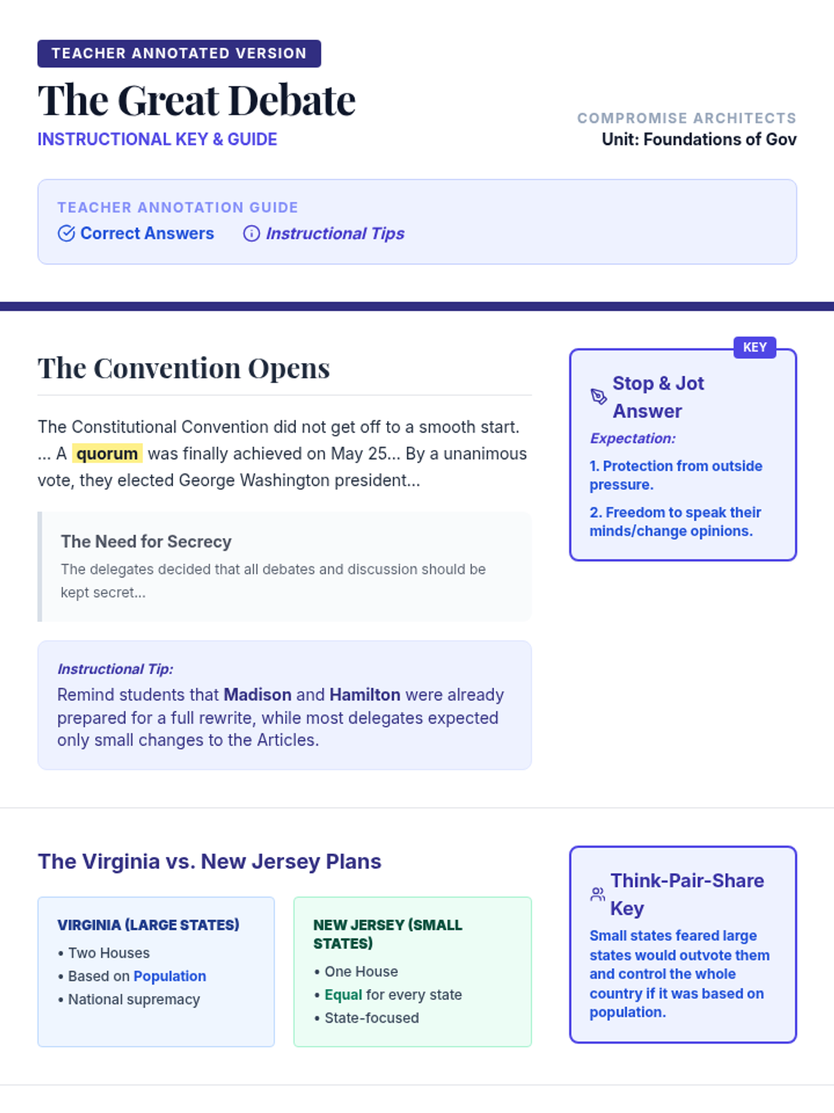 This lesson covers the proceedings of the Constitutional Convention, focusing on the conflicting Virginia and New Jersey Plans and the crucial compromises (Great Compromise, Three-Fifths Compromise, and Commerce/Slave Trade) that shaped the U.S. government. Students will analyze the contributions of key Founding Fathers and evaluate how these debates led to the creation of the Constitution.