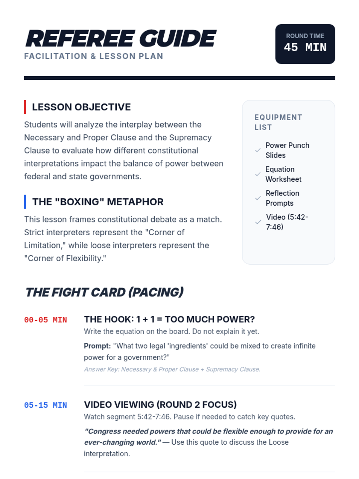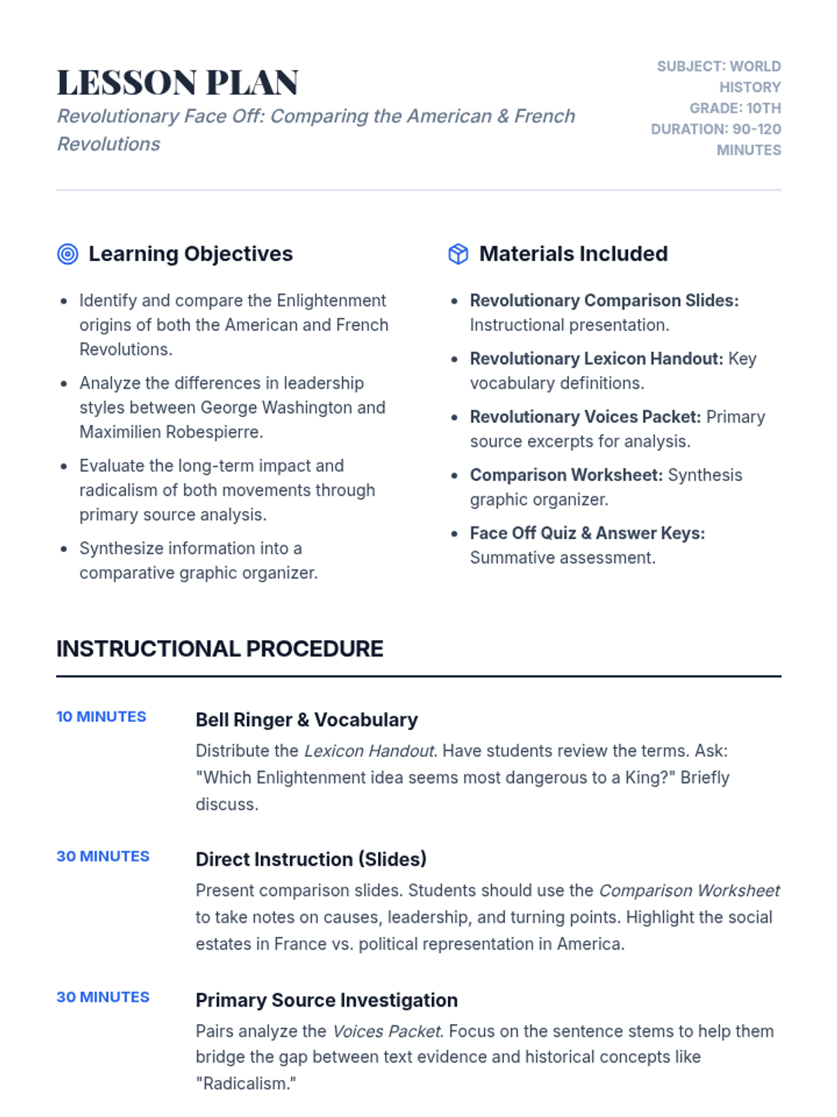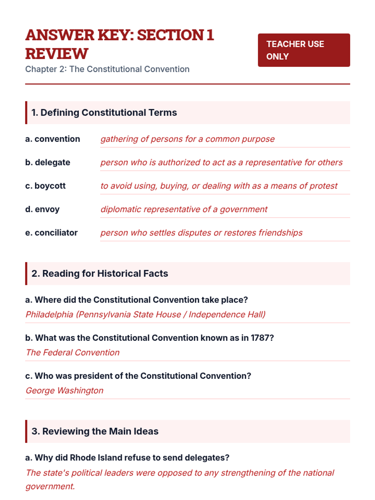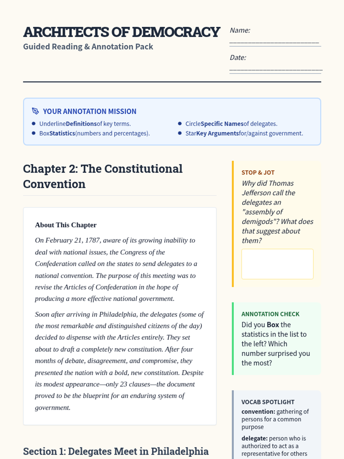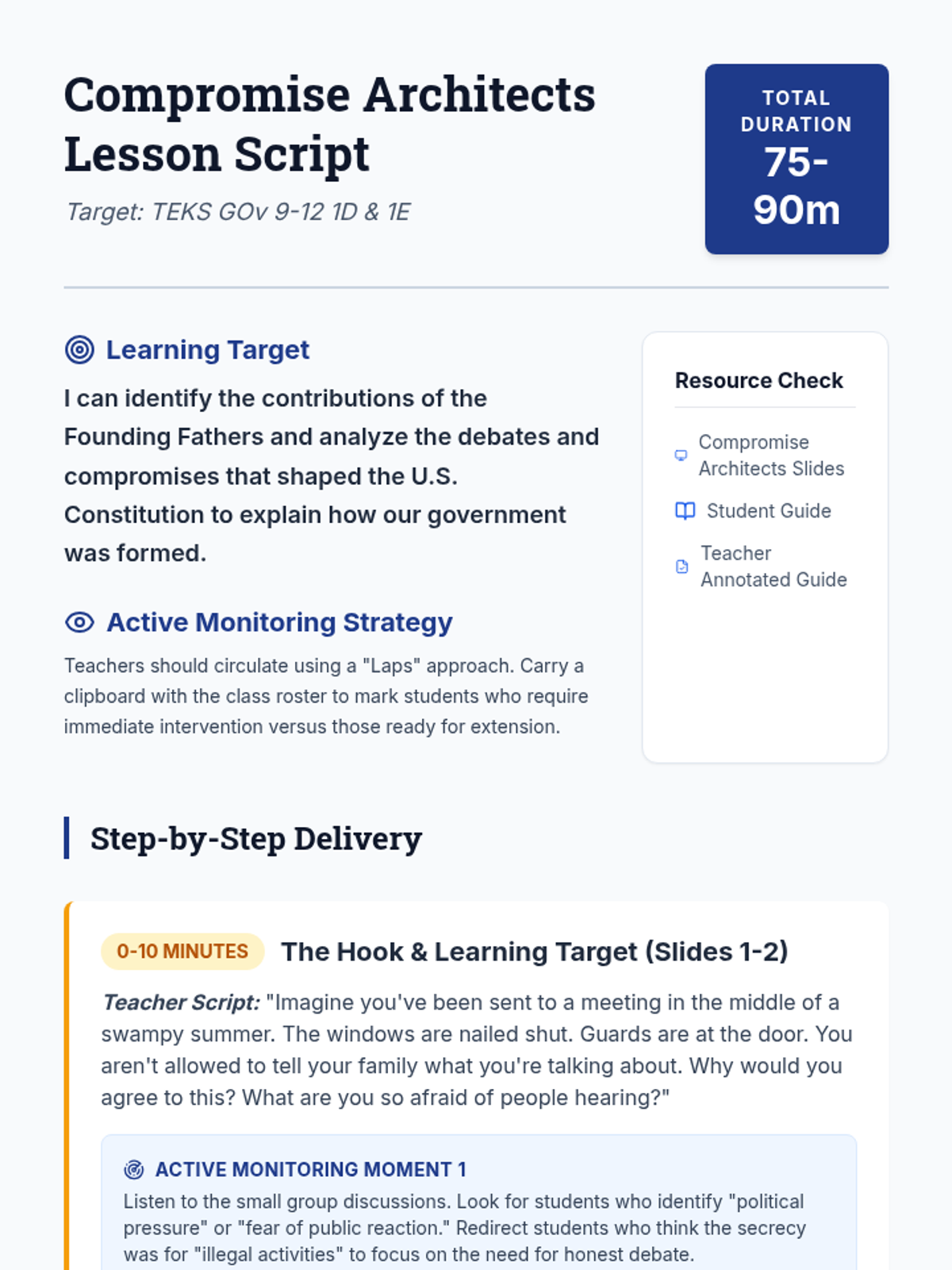 This lesson covers the proceedings of the Constitutional Convention, focusing on the conflicting Virginia and New Jersey Plans and the crucial compromises (Great Compromise, Three-Fifths Compromise, and Commerce/Slave Trade) that shaped the U.S. government. Students will analyze the contributions of key Founding Fathers and evaluate how these debates led to the creation of the Constitution.
