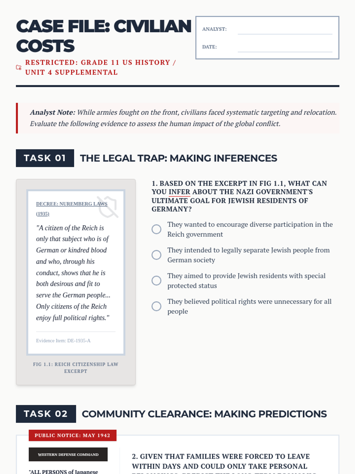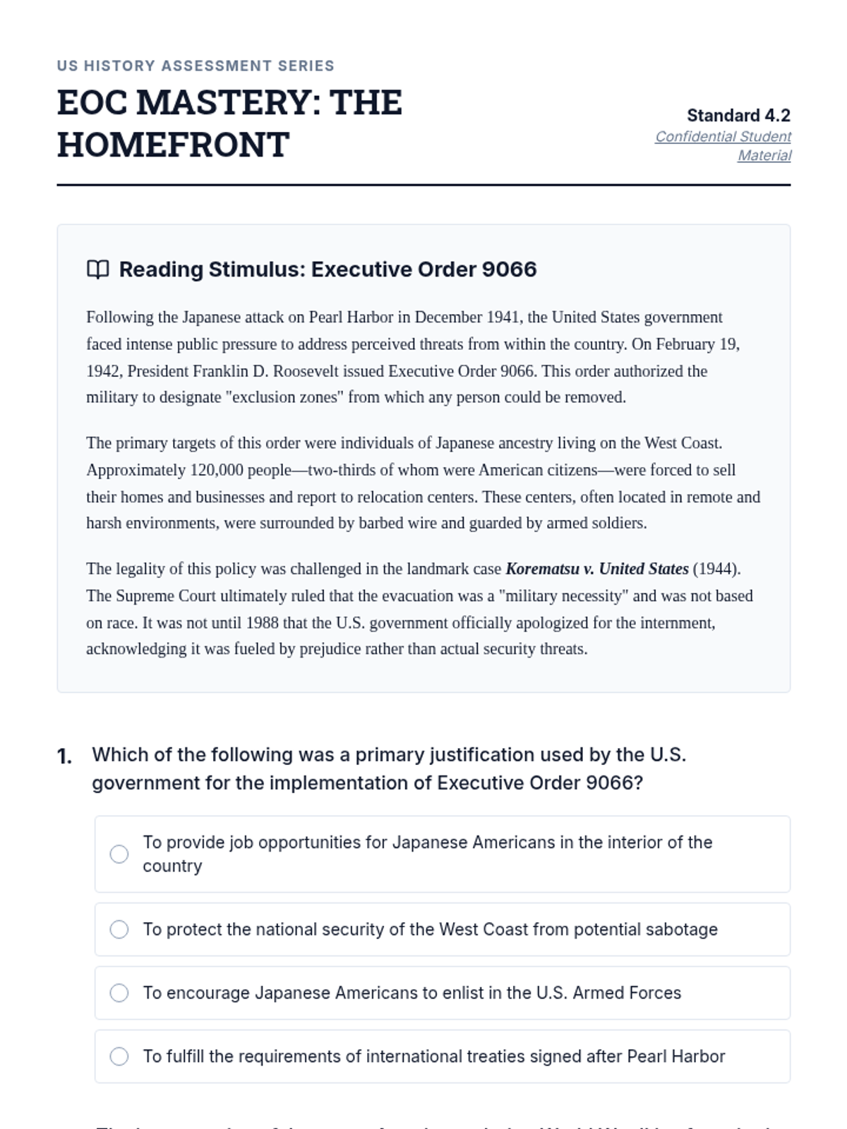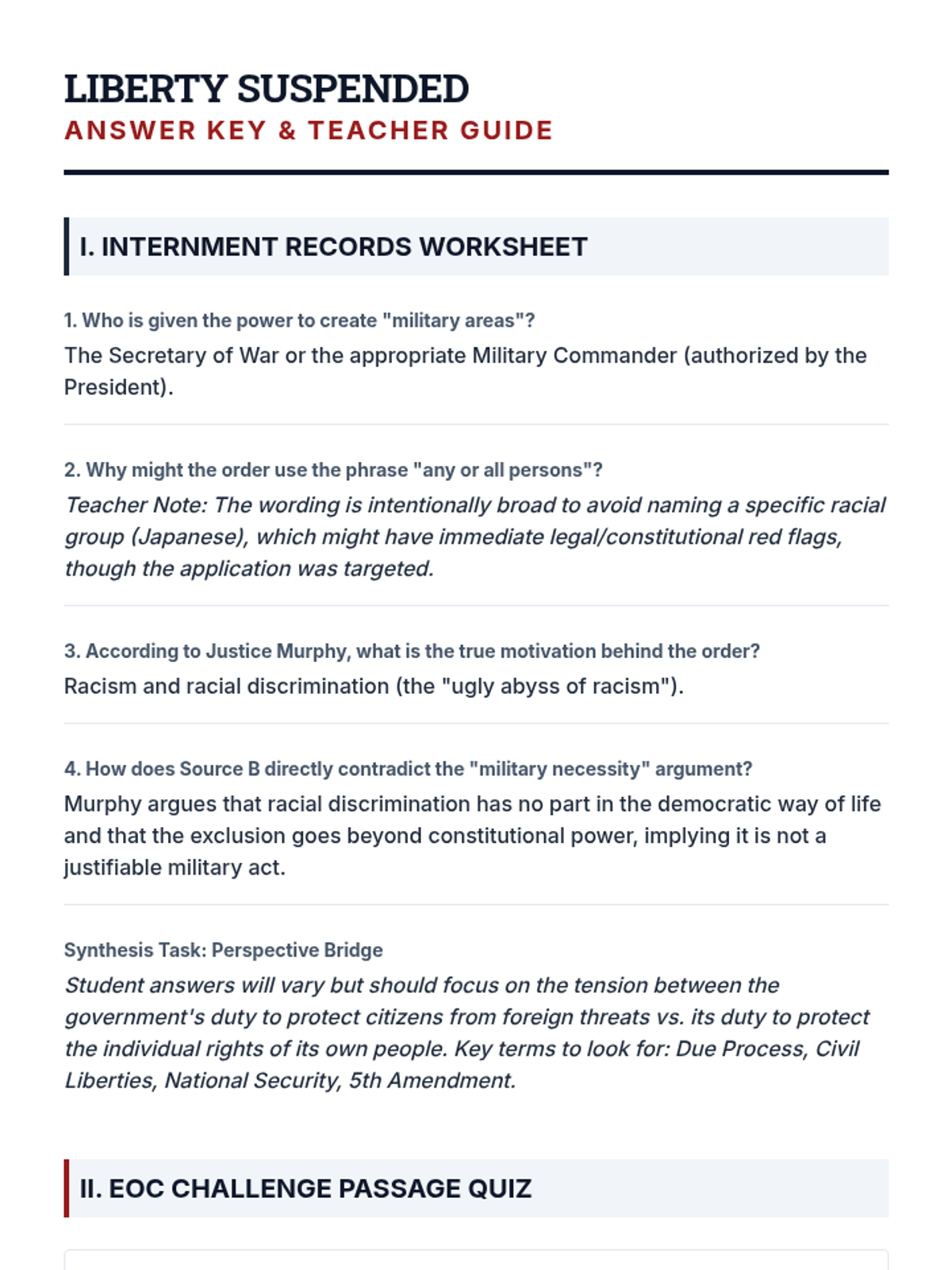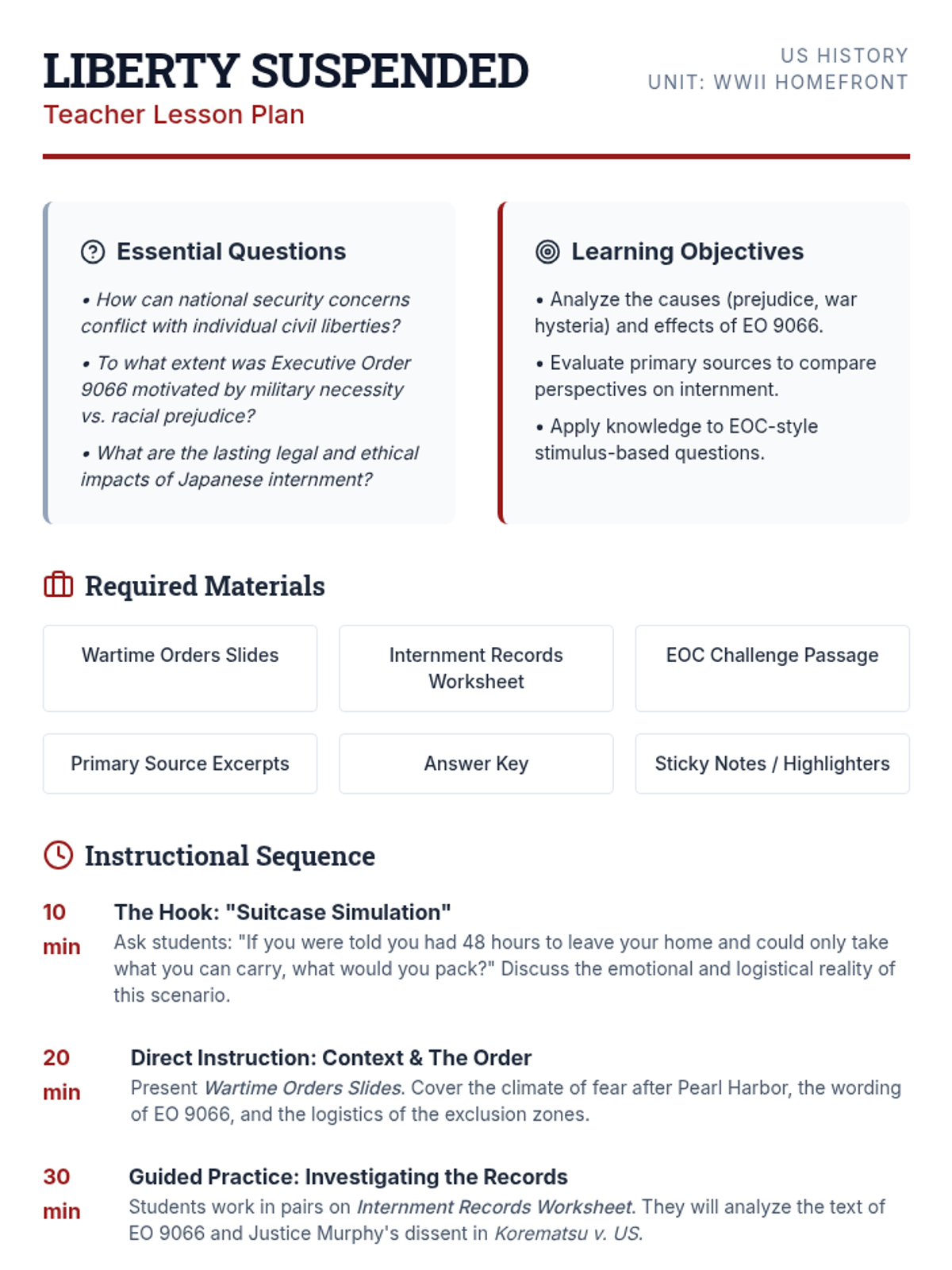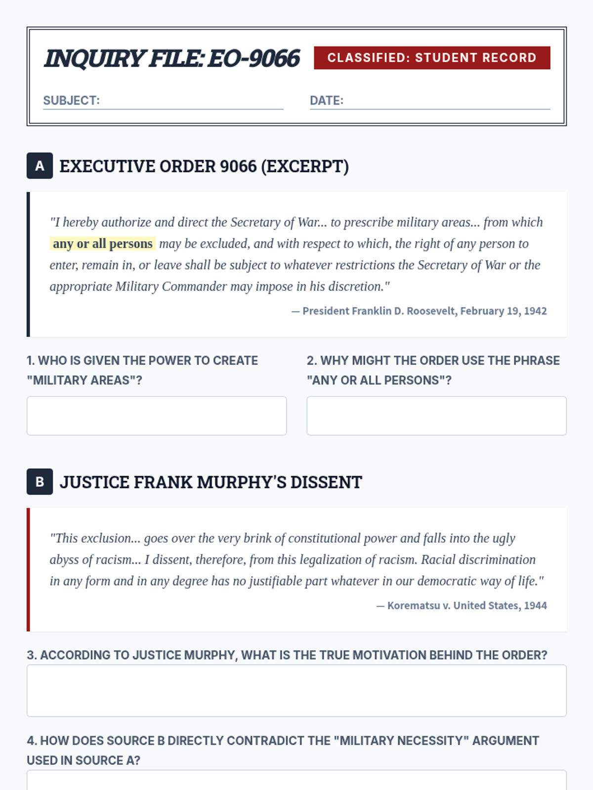 A comprehensive lesson exploring the historical context, legal implications, and human impact of Executive Order 9066 through primary source analysis and EOC-style assessment.