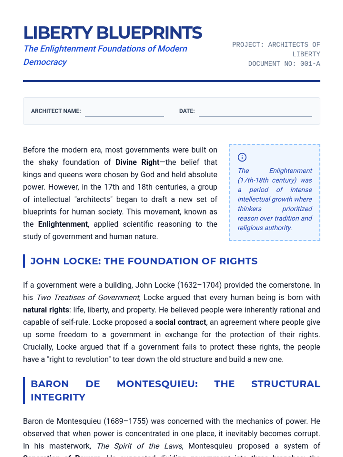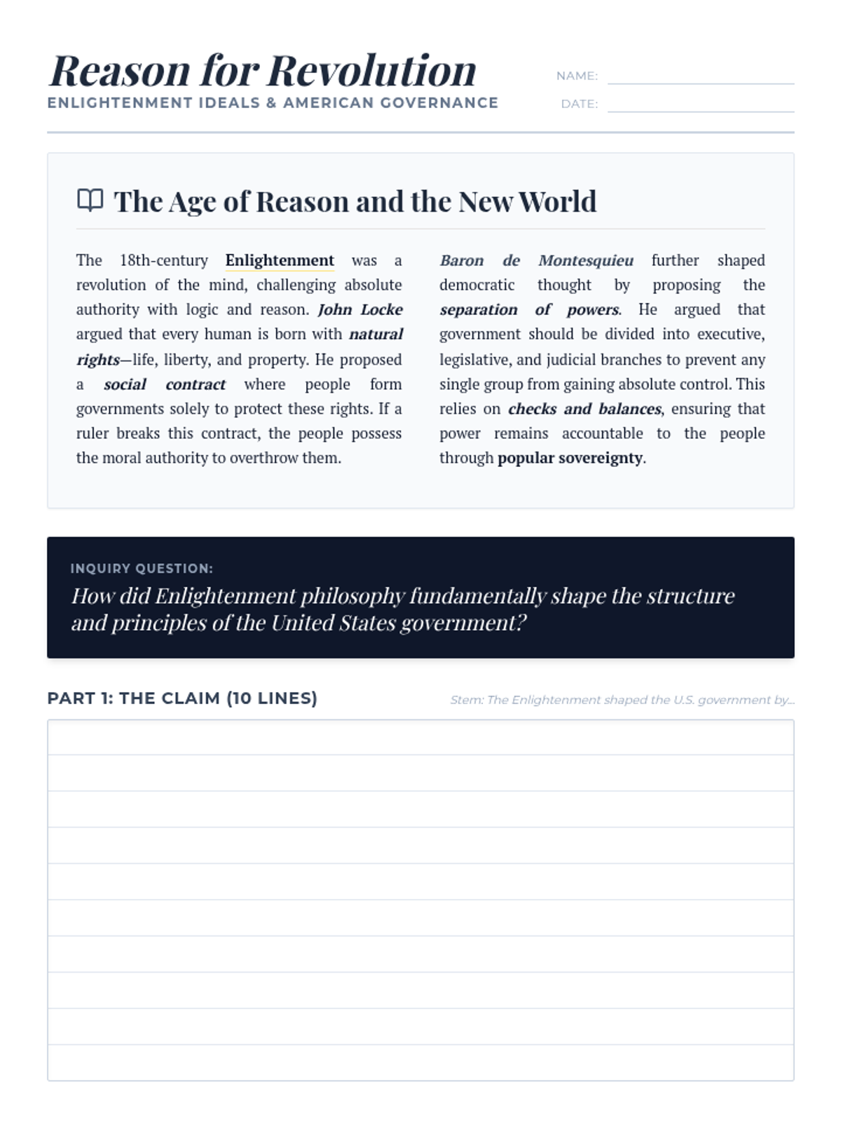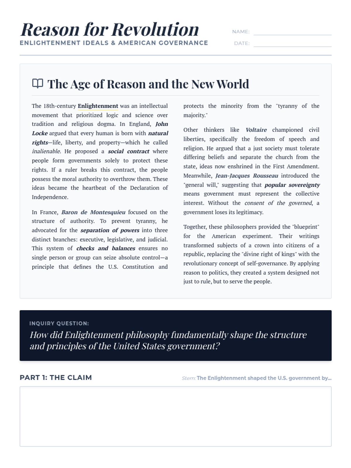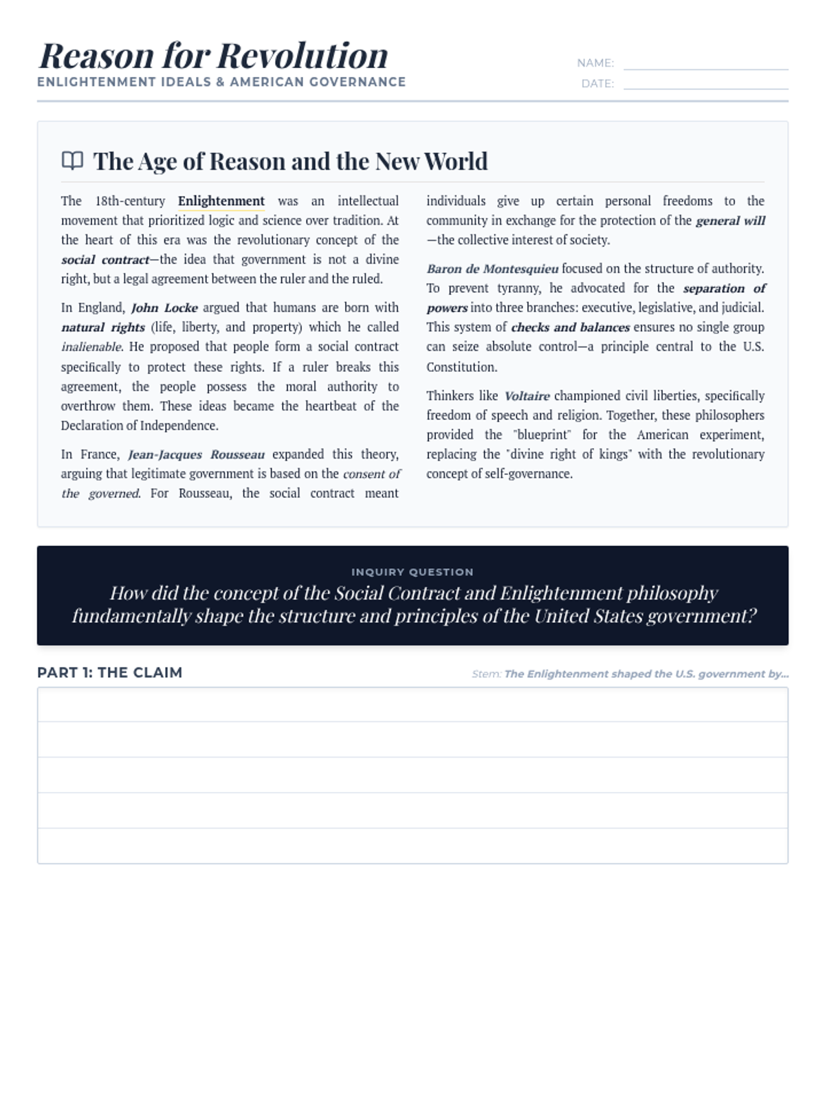 Government FoundationsHistorical origins of democracy, the separation of powers, and the U.S. Constitution. Connects Enlightenment philosophies to foundational documents like the Bill of Rights.