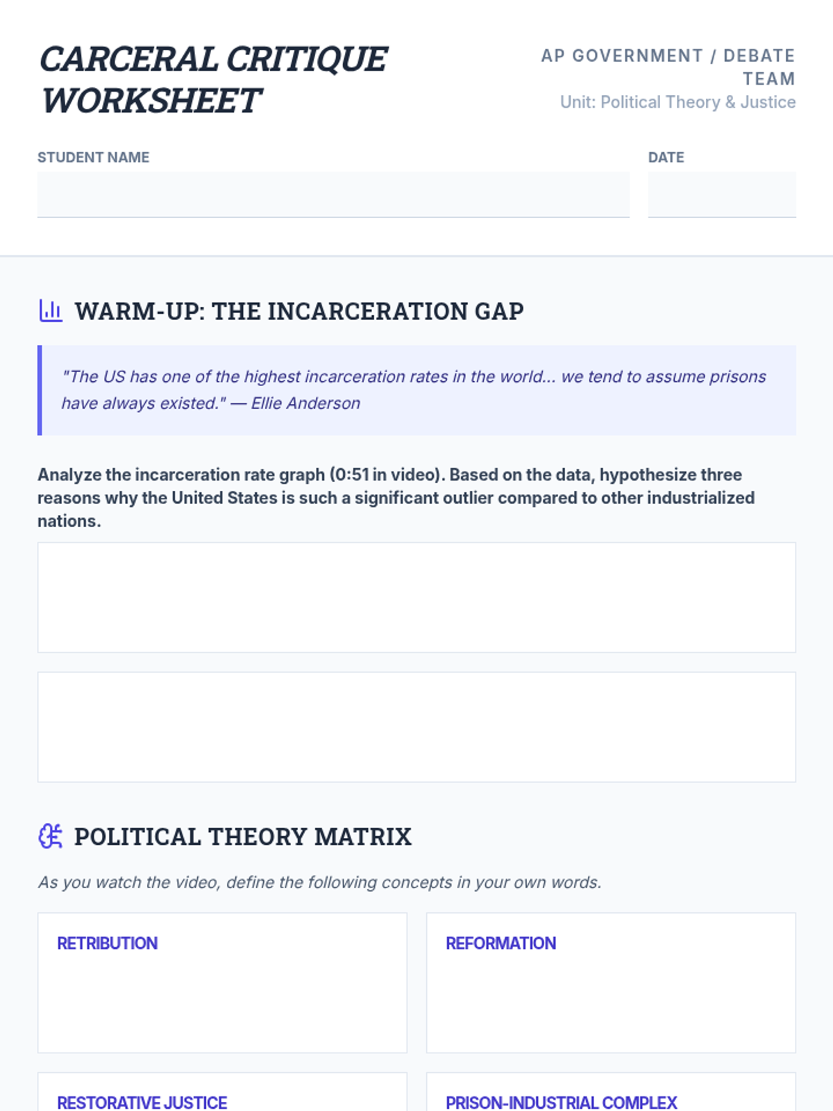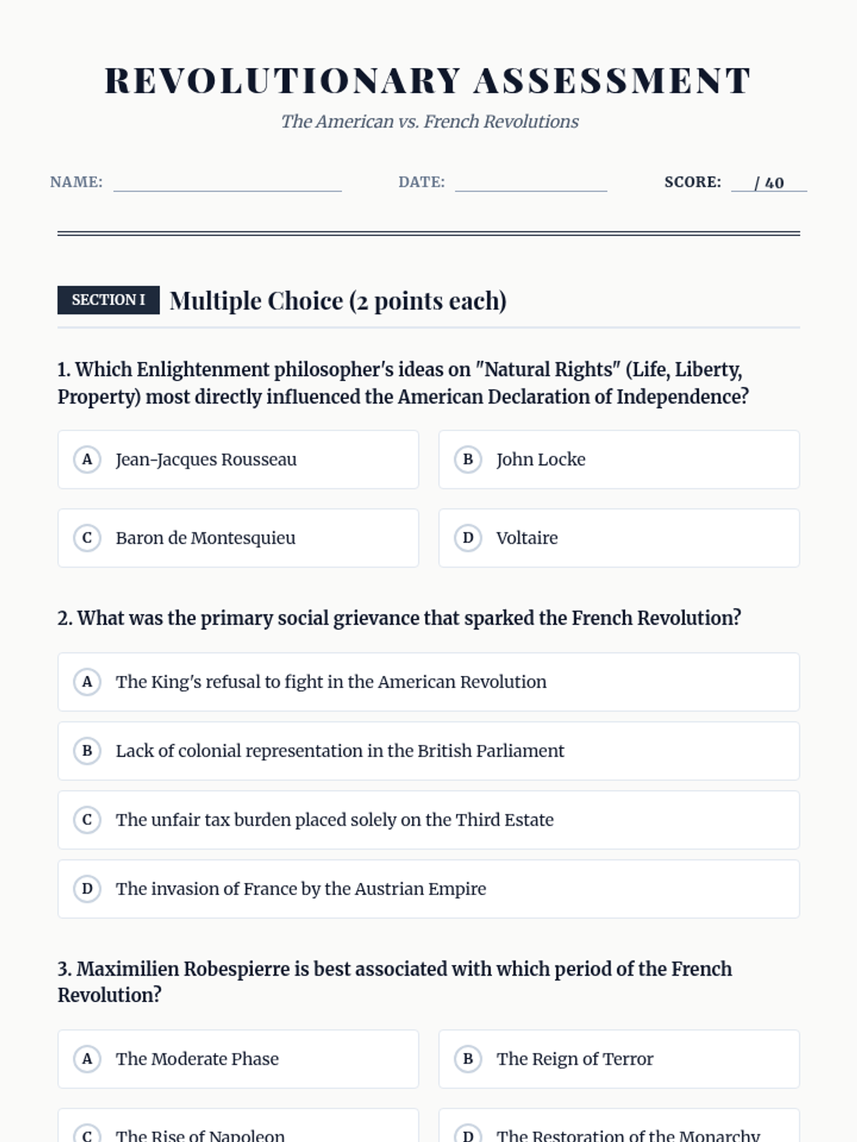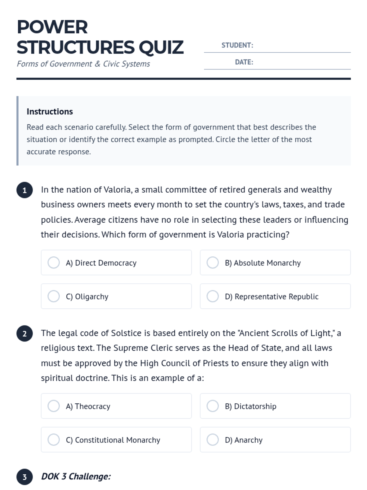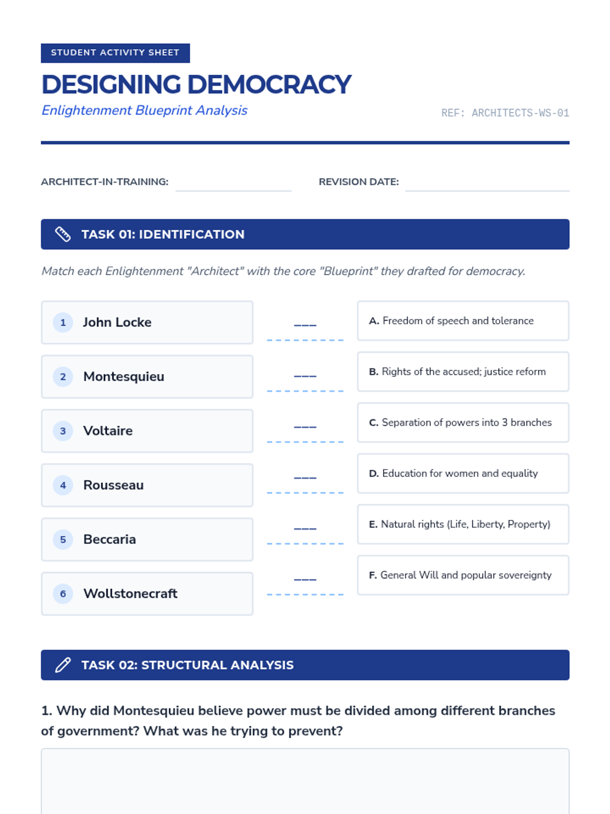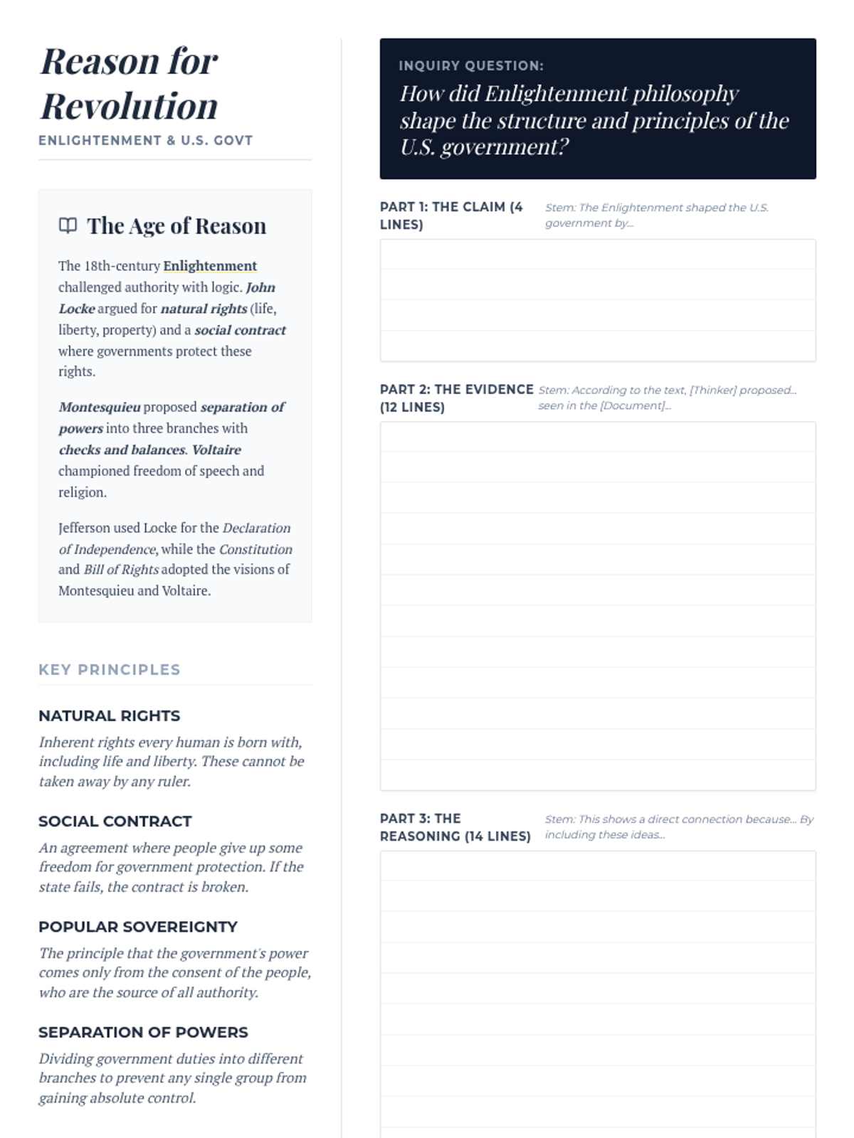 Government FoundationsHistorical origins of democracy, the separation of powers, and the U.S. Constitution. Connects Enlightenment philosophies to foundational documents like the Bill of Rights.