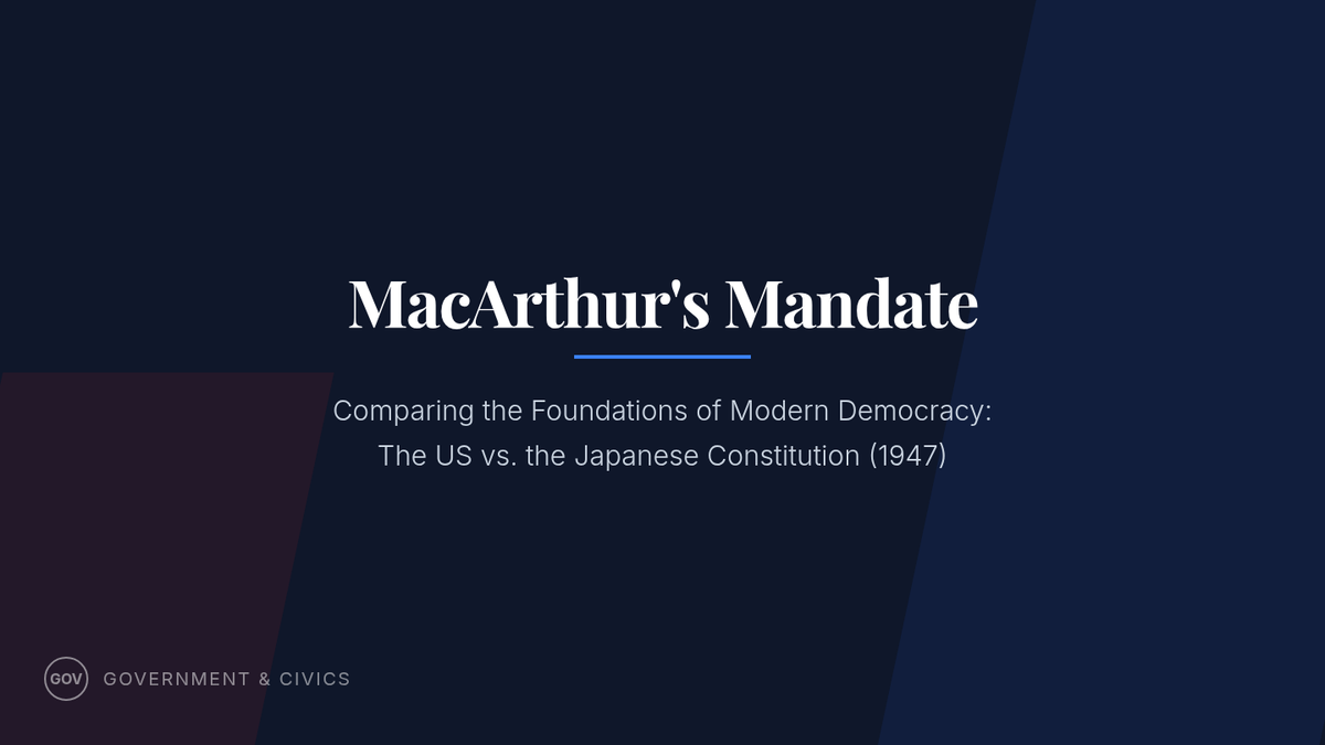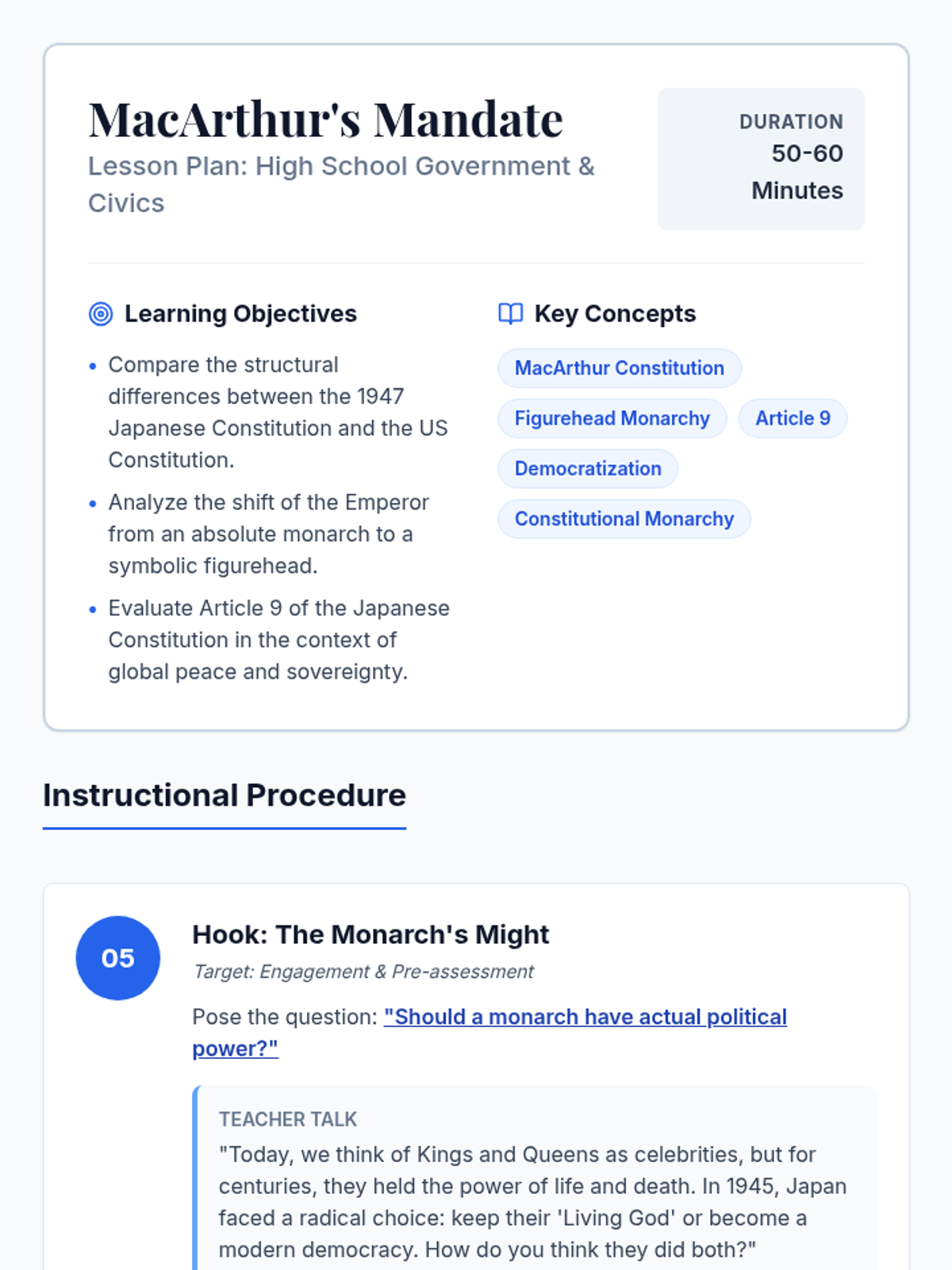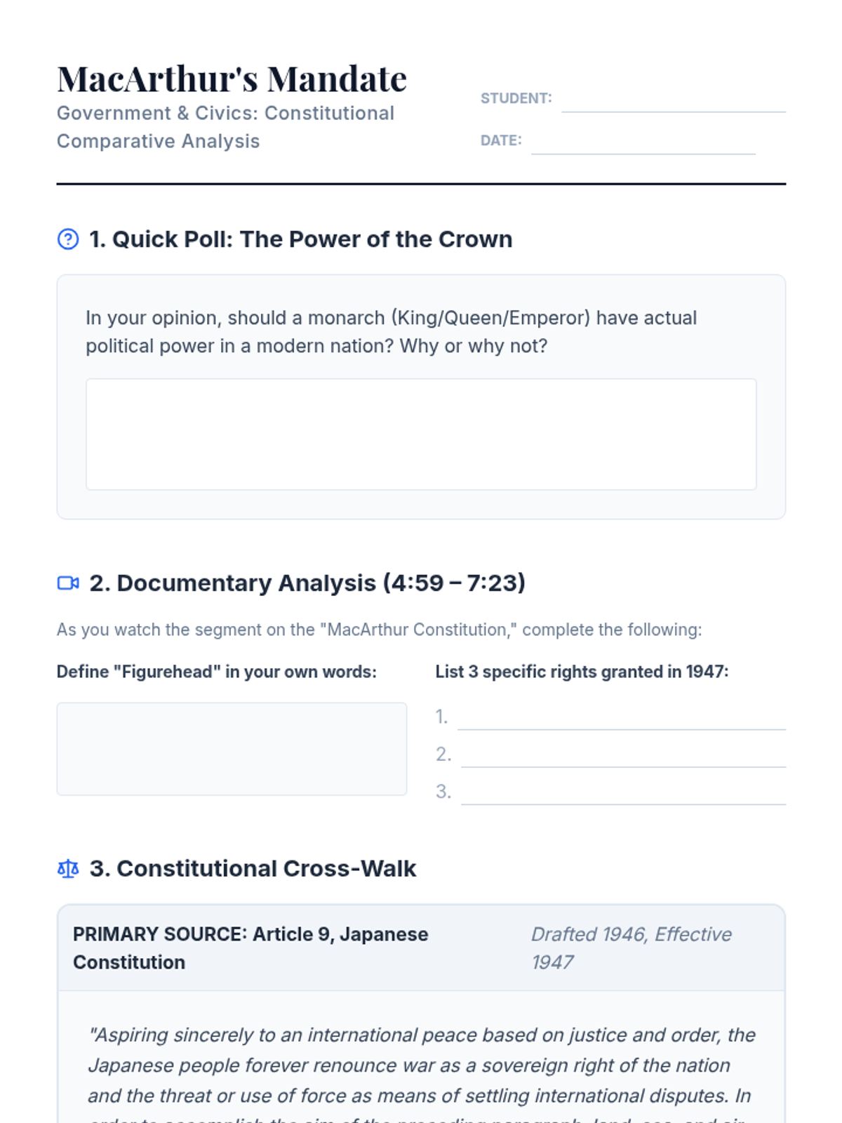 A High School Government lesson comparing the US Constitution to the 1947 Japanese 'MacArthur' Constitution, focusing on Article 9 and the transition of the Emperor to a figurehead.