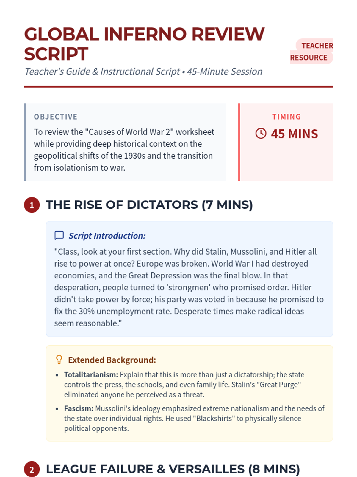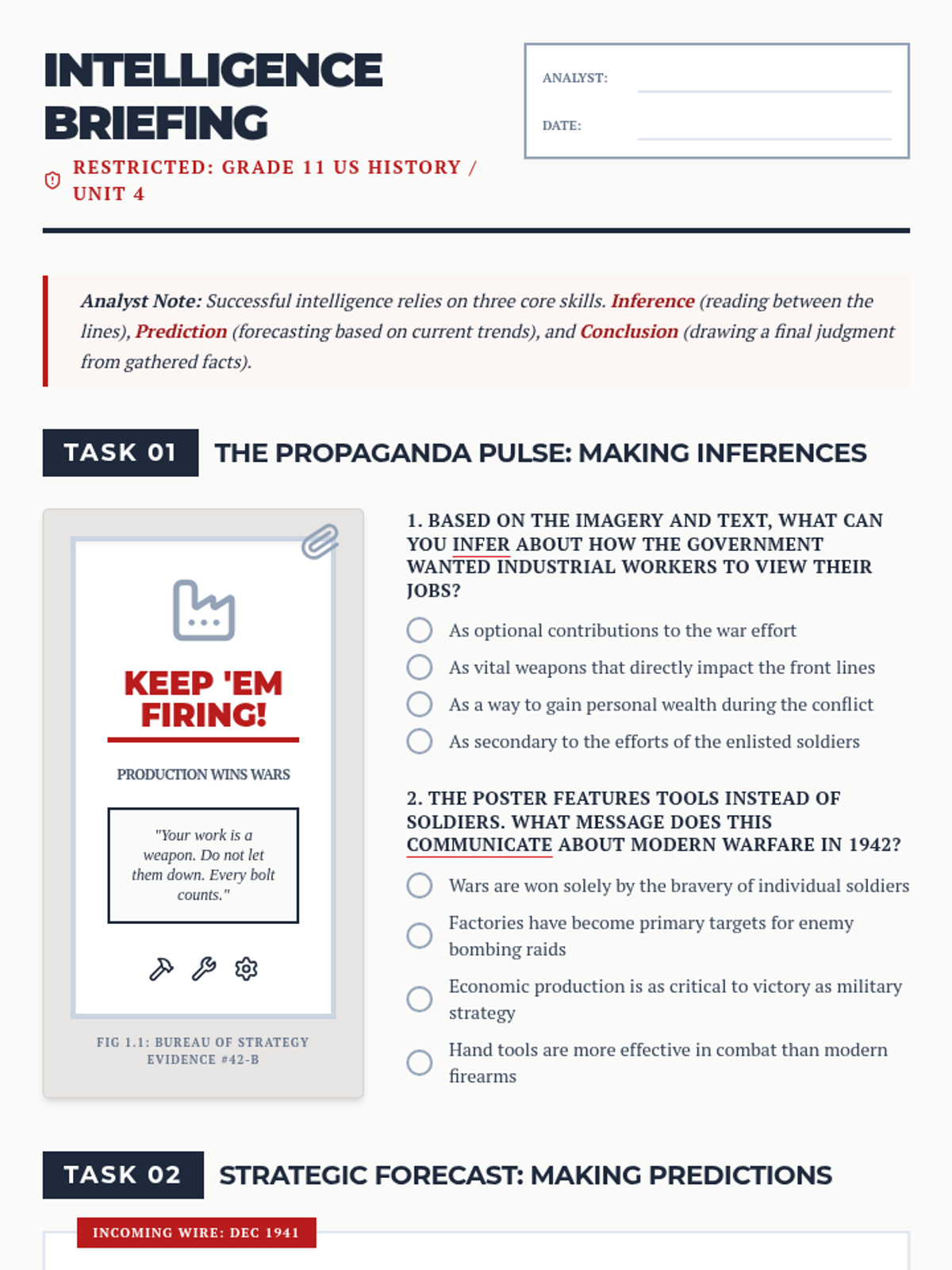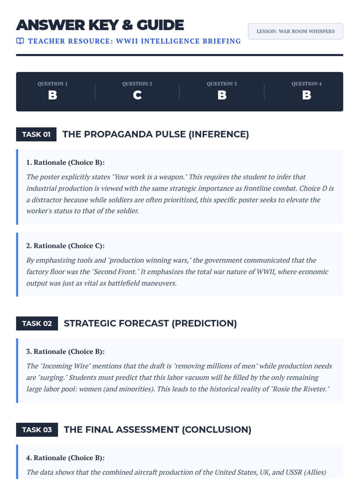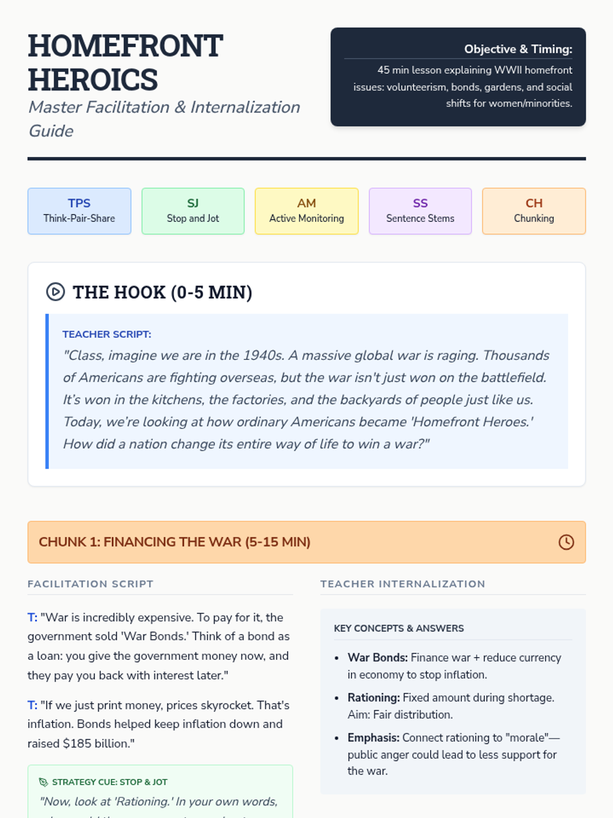 A comprehensive guide for teachers to internalize and deliver a lesson on the American home front during WWII, featuring instructional strategies and annotated content.