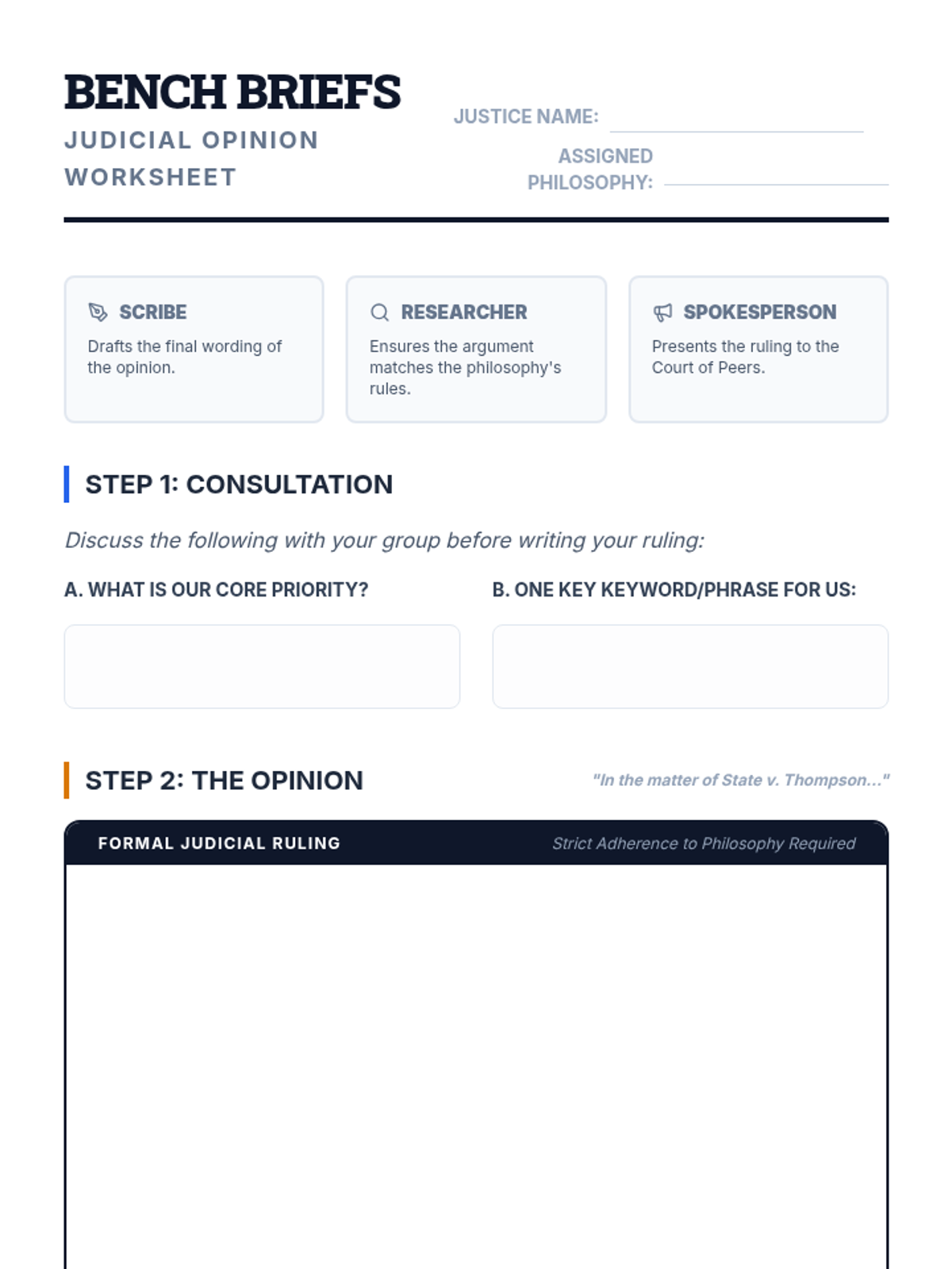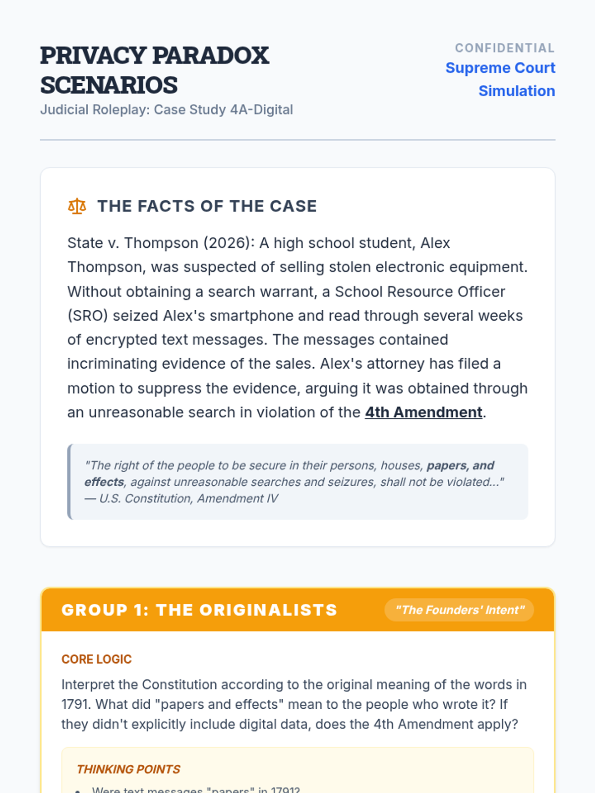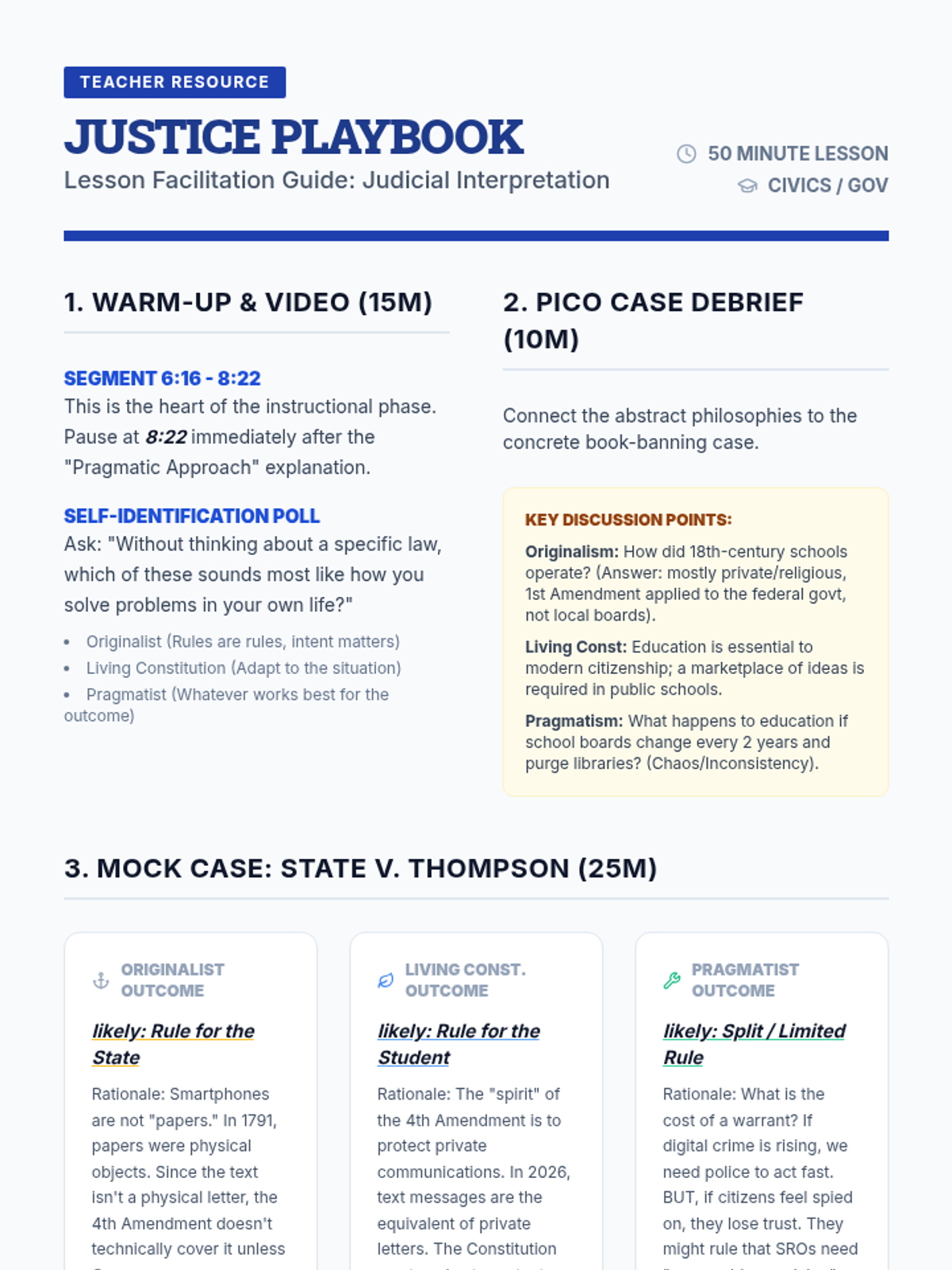 A high school civics lesson exploring the three primary judicial philosophies: Originalism, Living Constitution, and Pragmatism through the lens of the Island Trees v. Pico case and a modern privacy simulation.