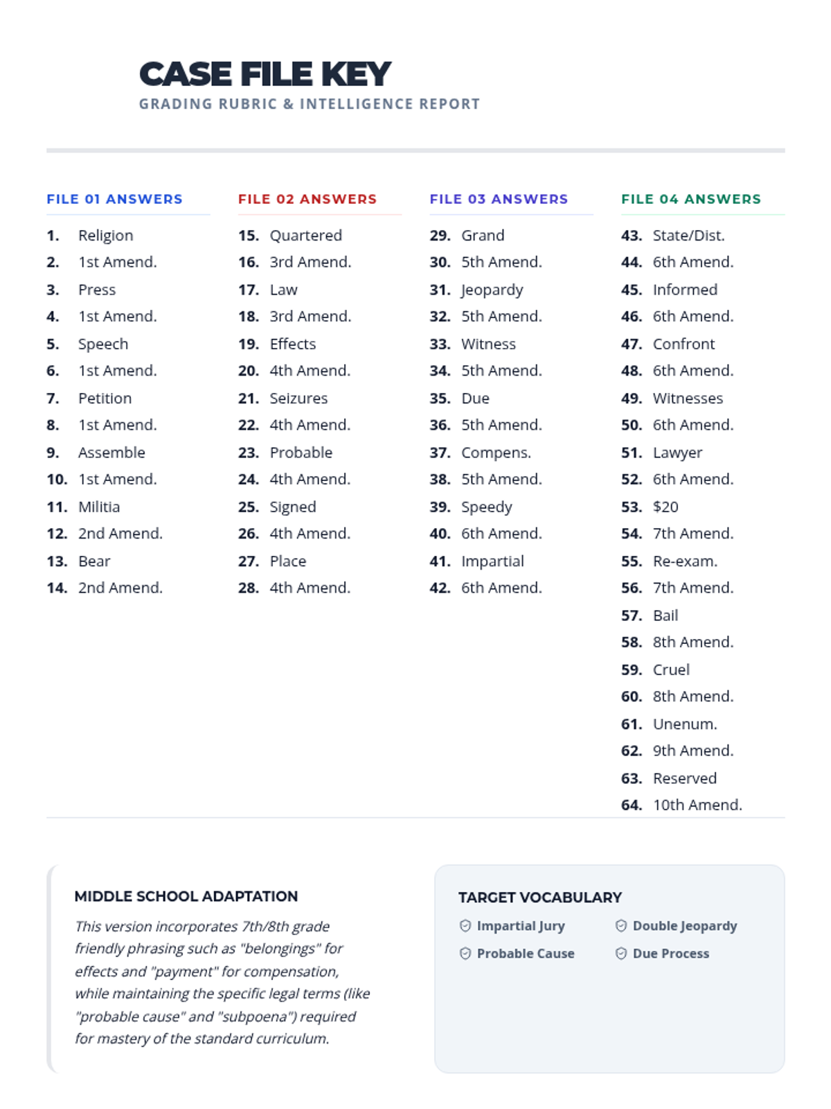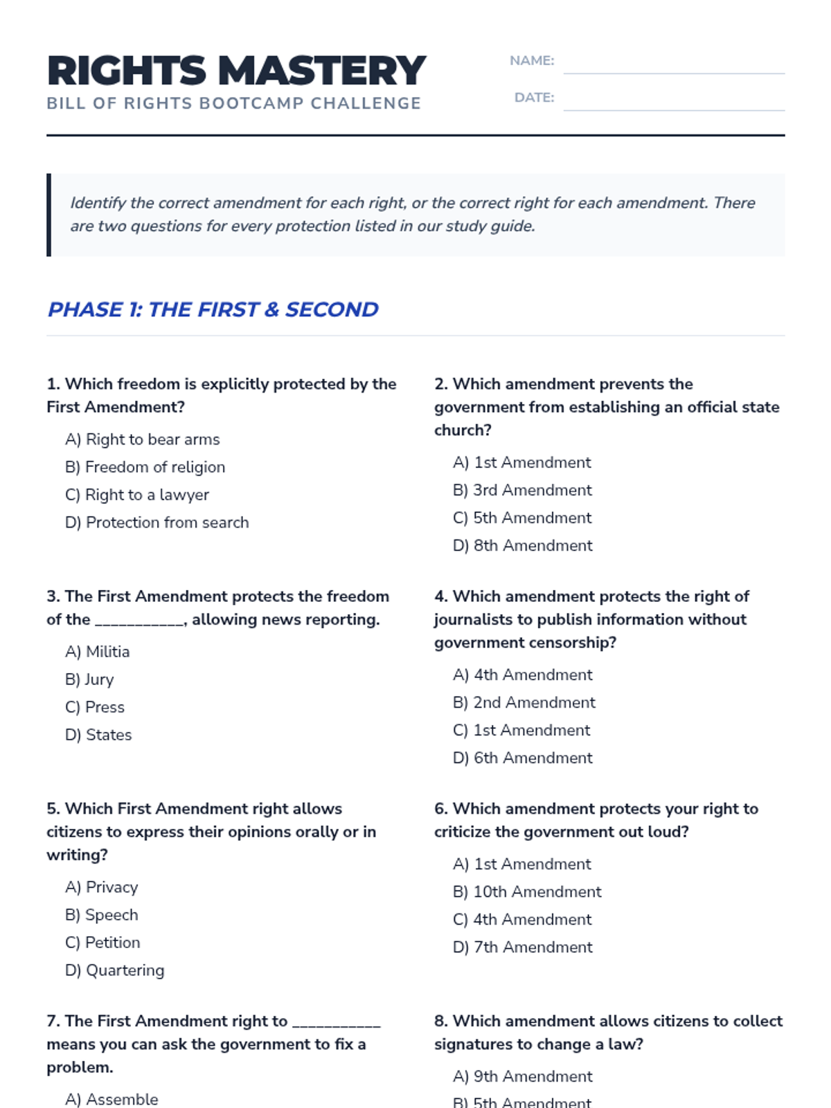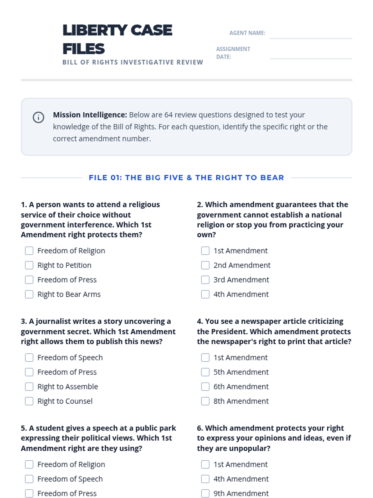 A comprehensive review module focused on memorizing the specific protections of the Bill of Rights through repetitive identification and classification questions.