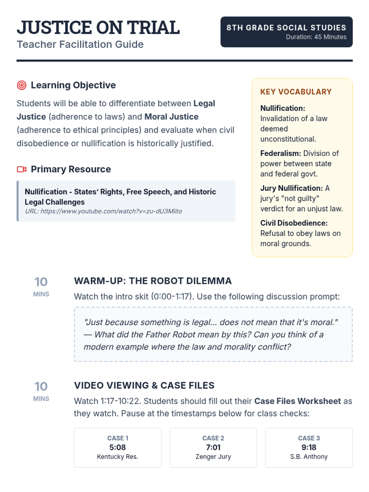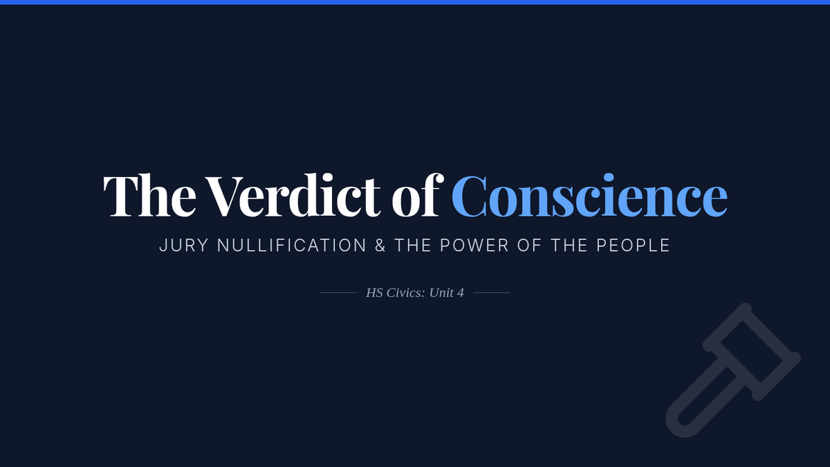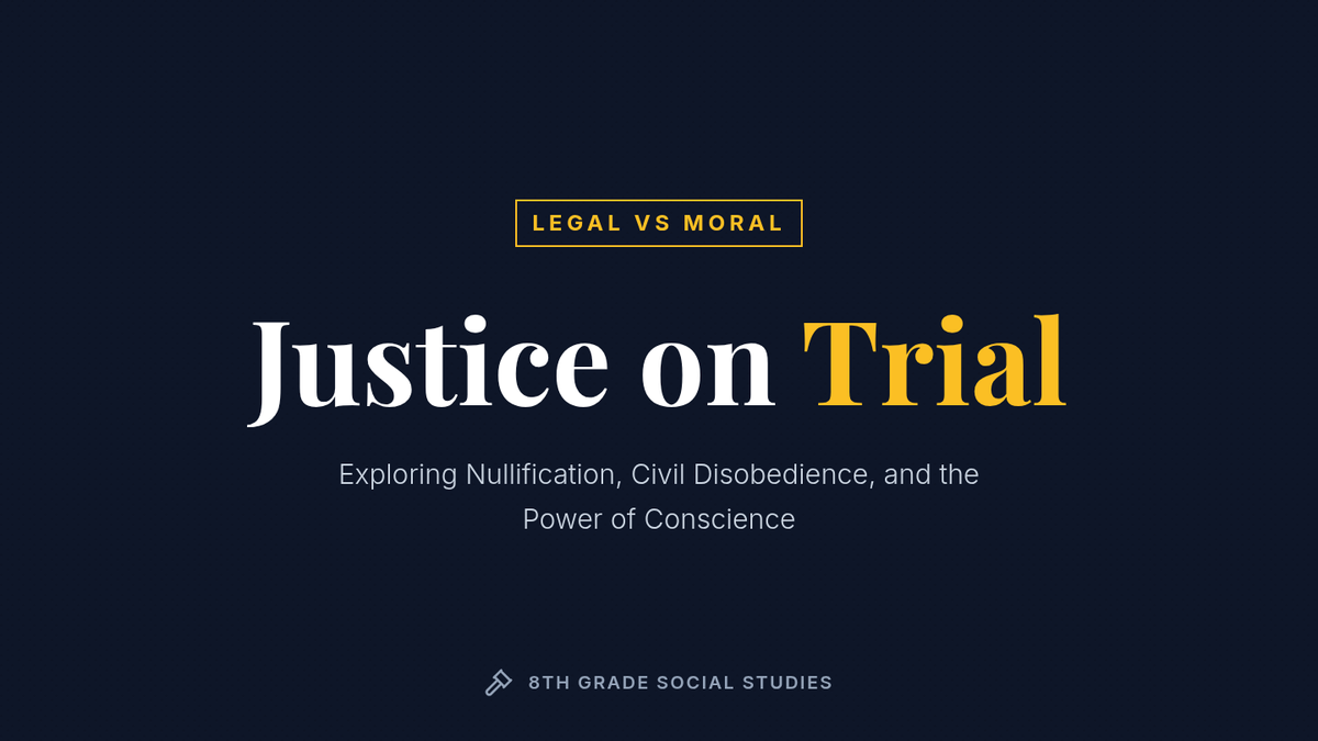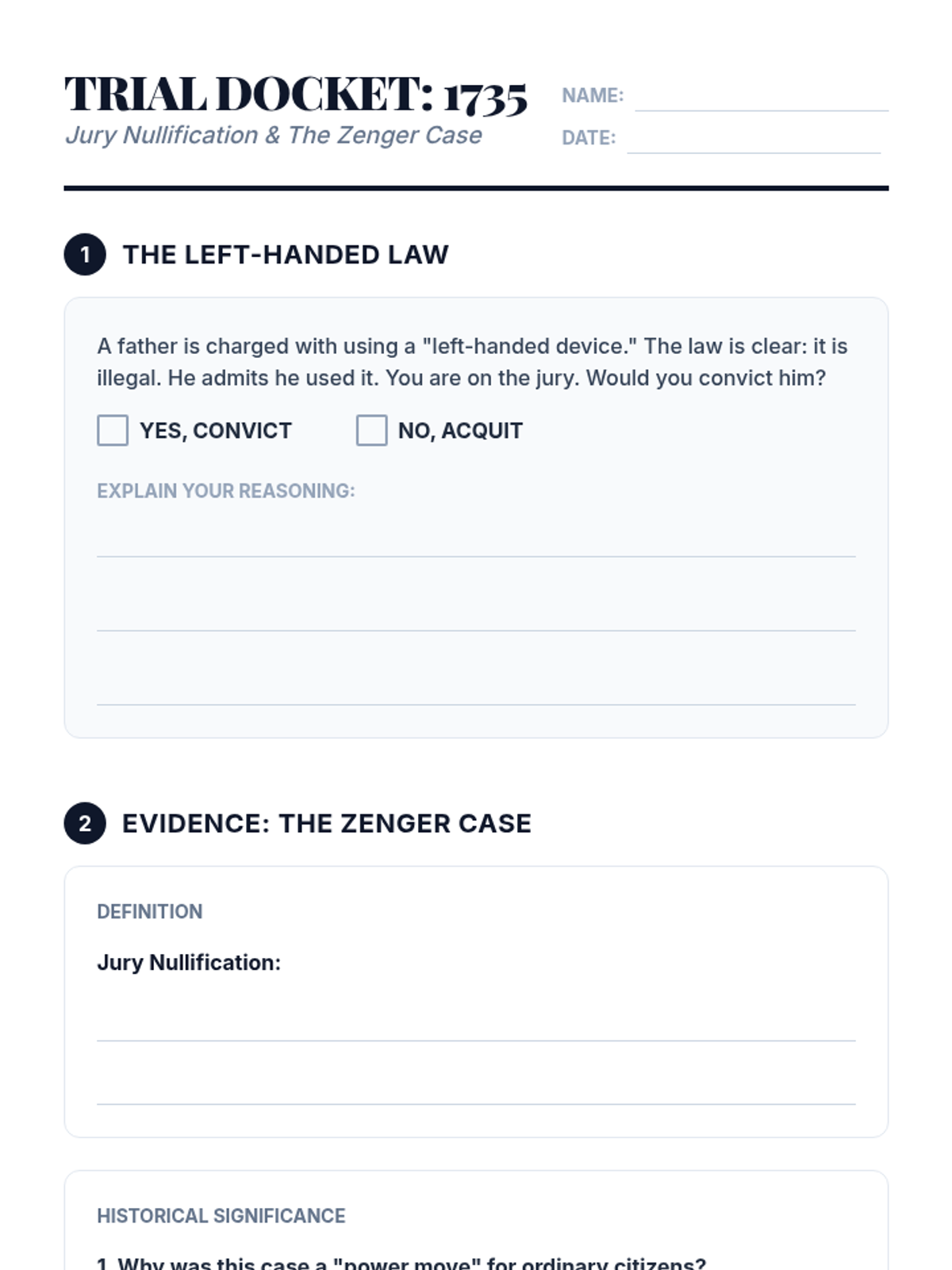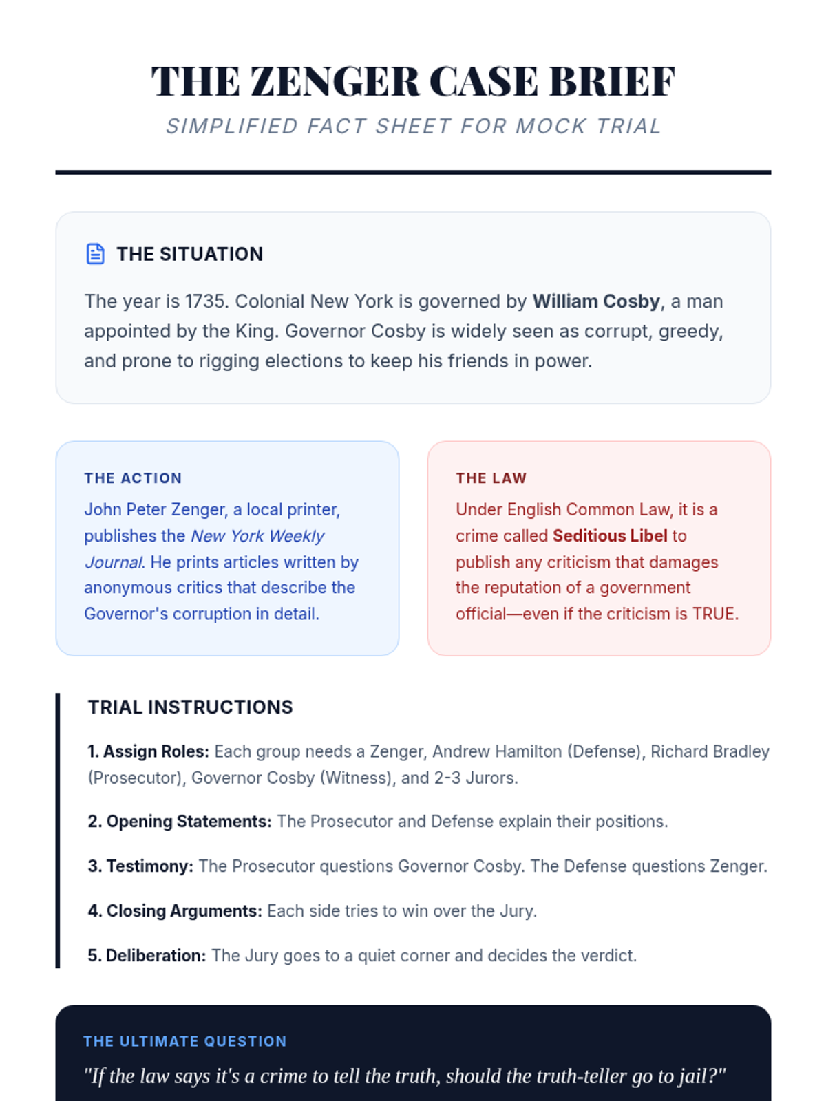A High School Civics lesson exploring jury nullification through the lens of the historic Zenger Case. Students analyze the tension between legal statutes and moral conscience while participating in a mock trial activity.