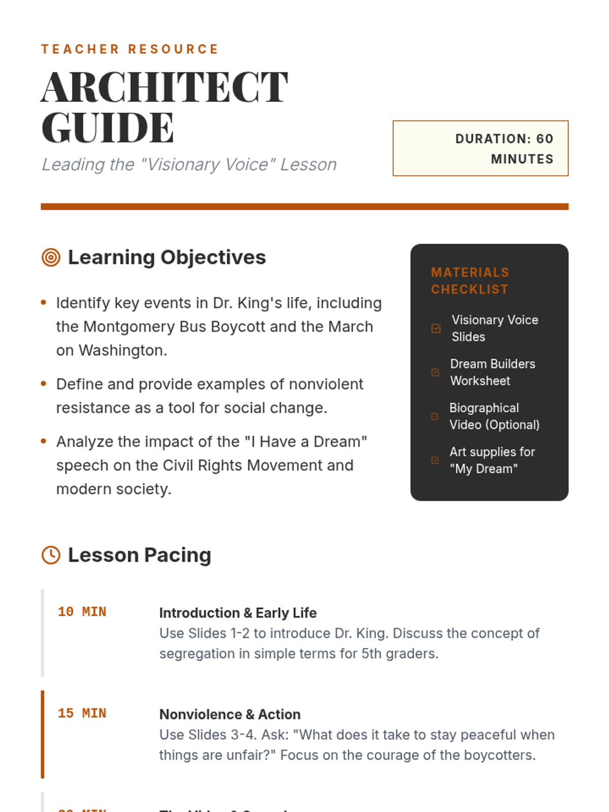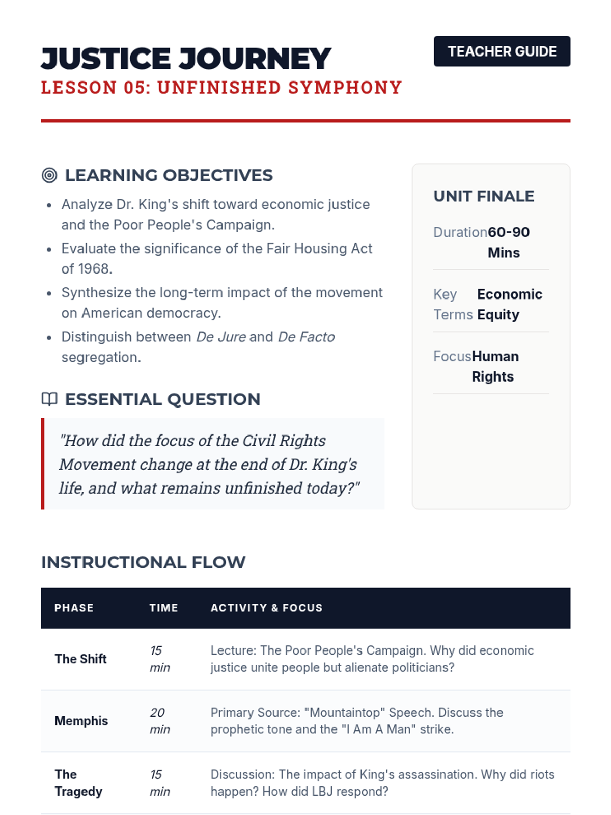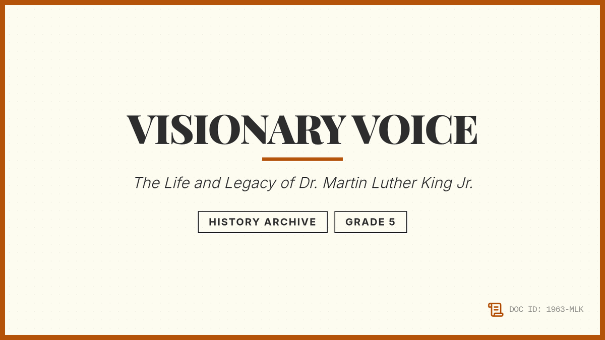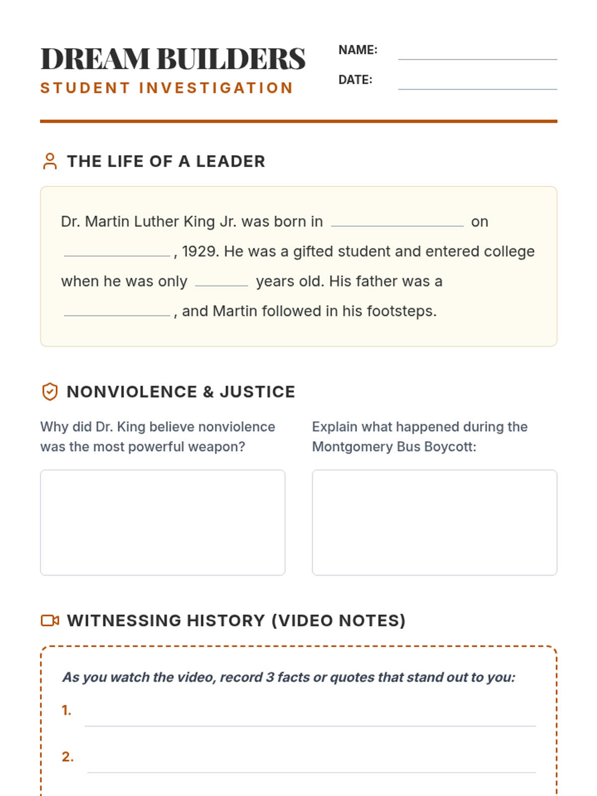 A comprehensive look at the life and legacy of Dr. Martin Luther King Jr., focusing on his philosophy of nonviolence and his pivotal role in the Civil Rights Movement. Students will explore key historical events and reflect on how his 'dream' continues to shape the world today.