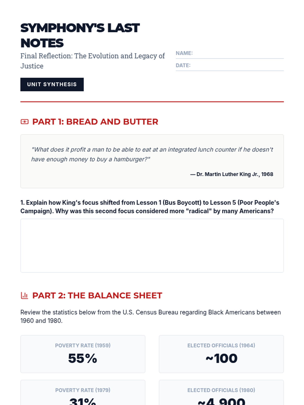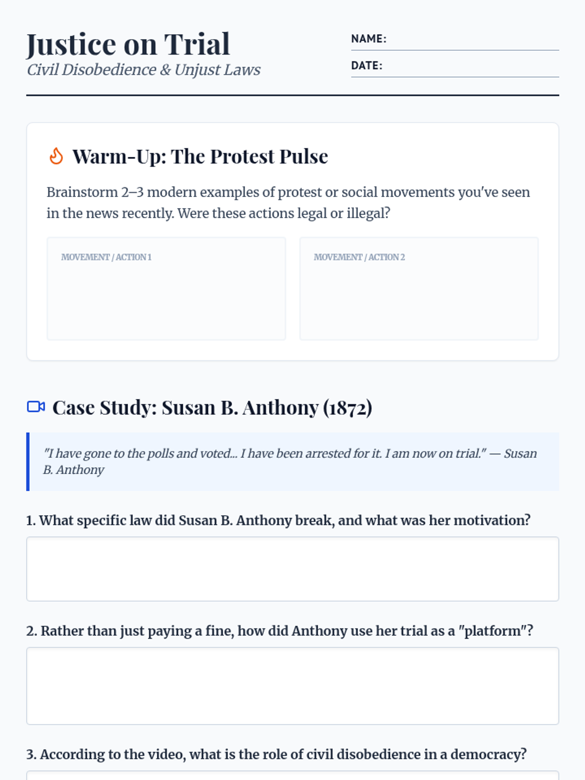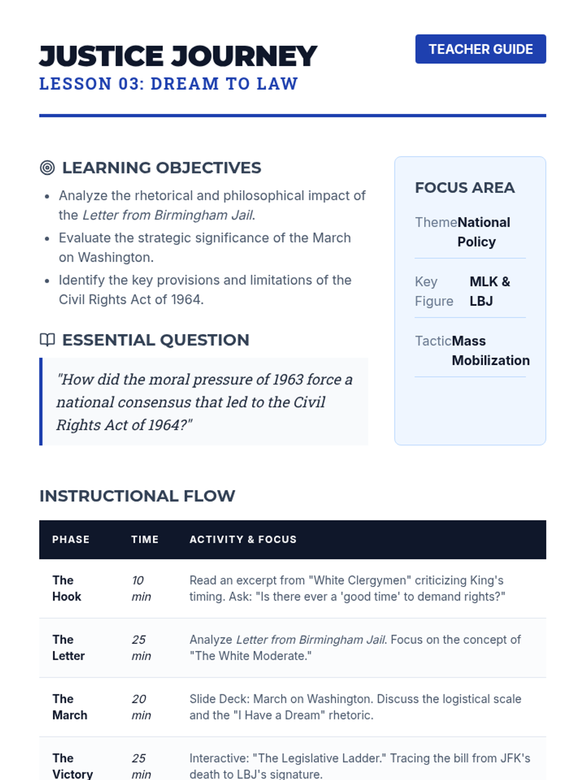 A comprehensive look at the life and legacy of Dr. Martin Luther King Jr., focusing on his philosophy of nonviolence and his pivotal role in the Civil Rights Movement. Students will explore key historical events and reflect on how his 'dream' continues to shape the world today.