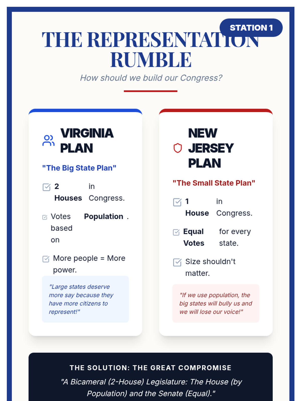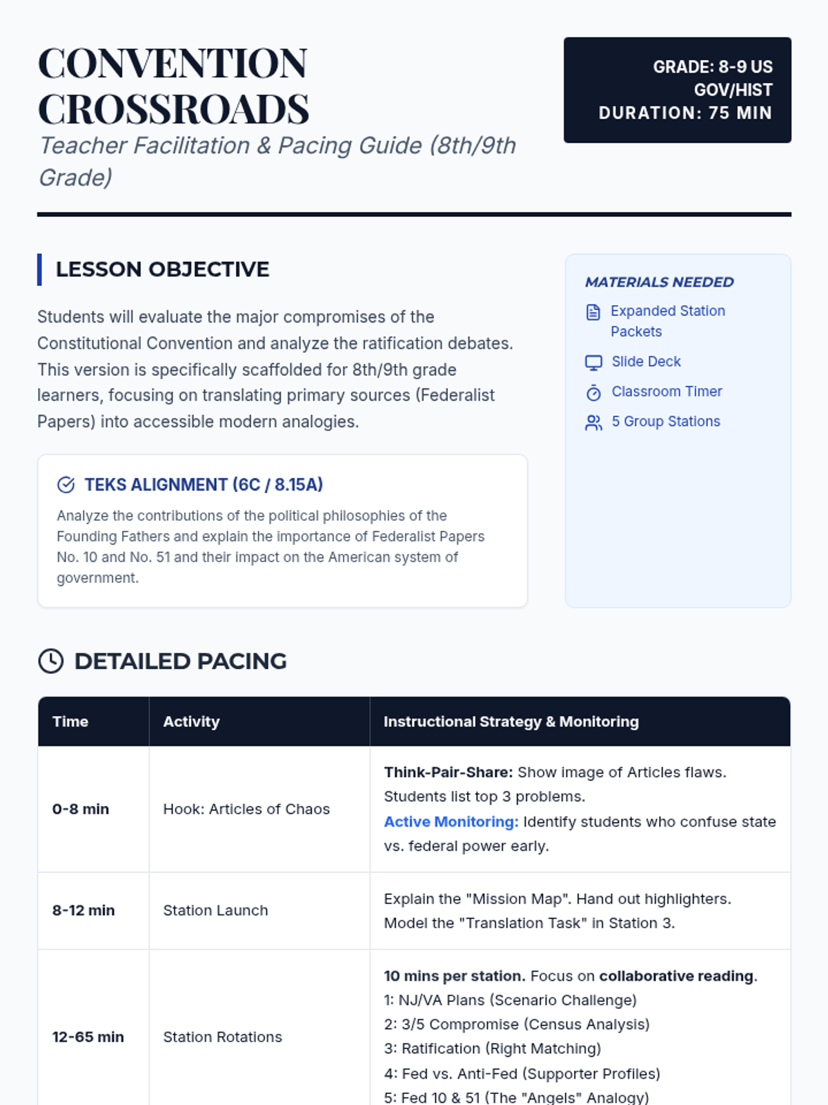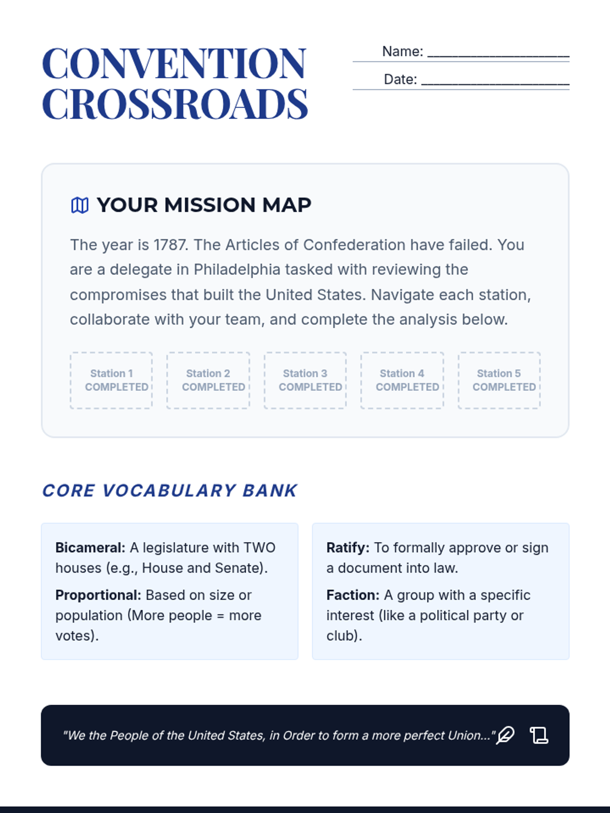 A comprehensive, station-based review lesson covering the Constitutional Convention, key compromises, Federalist vs. Anti-Federalist debates, and analysis of Federalist Papers 10 and 51. Designed for high school US Government students with heavy scaffolding for IEP and LEP learners.