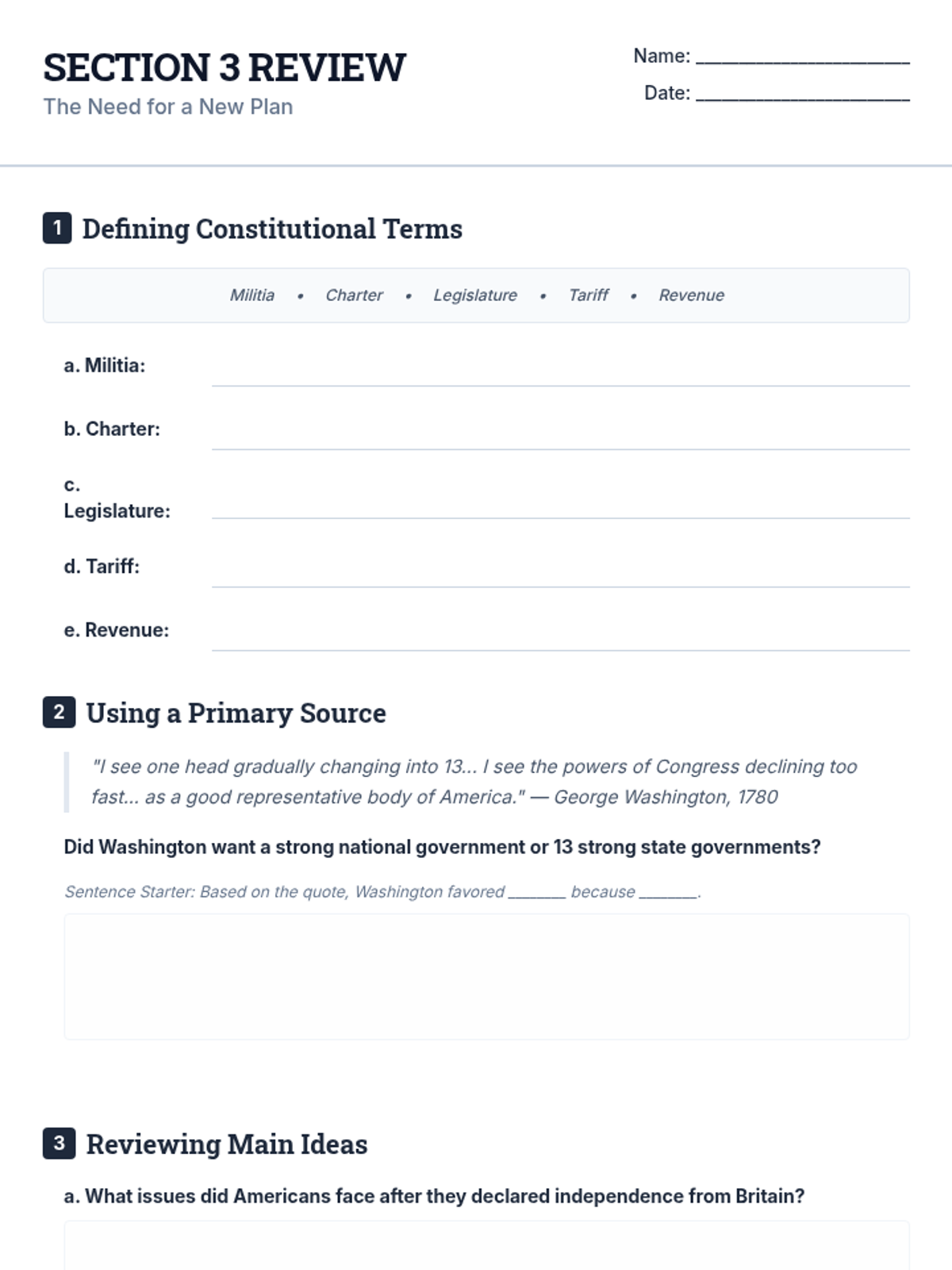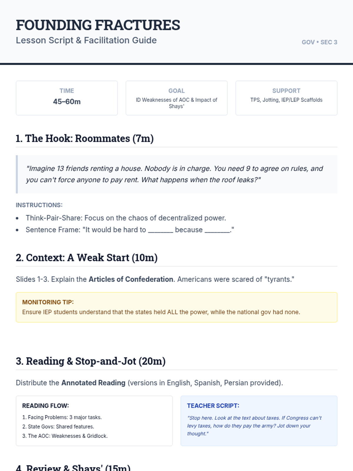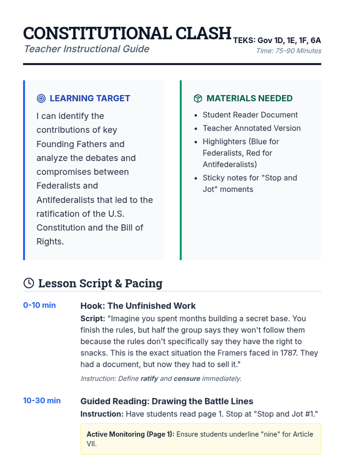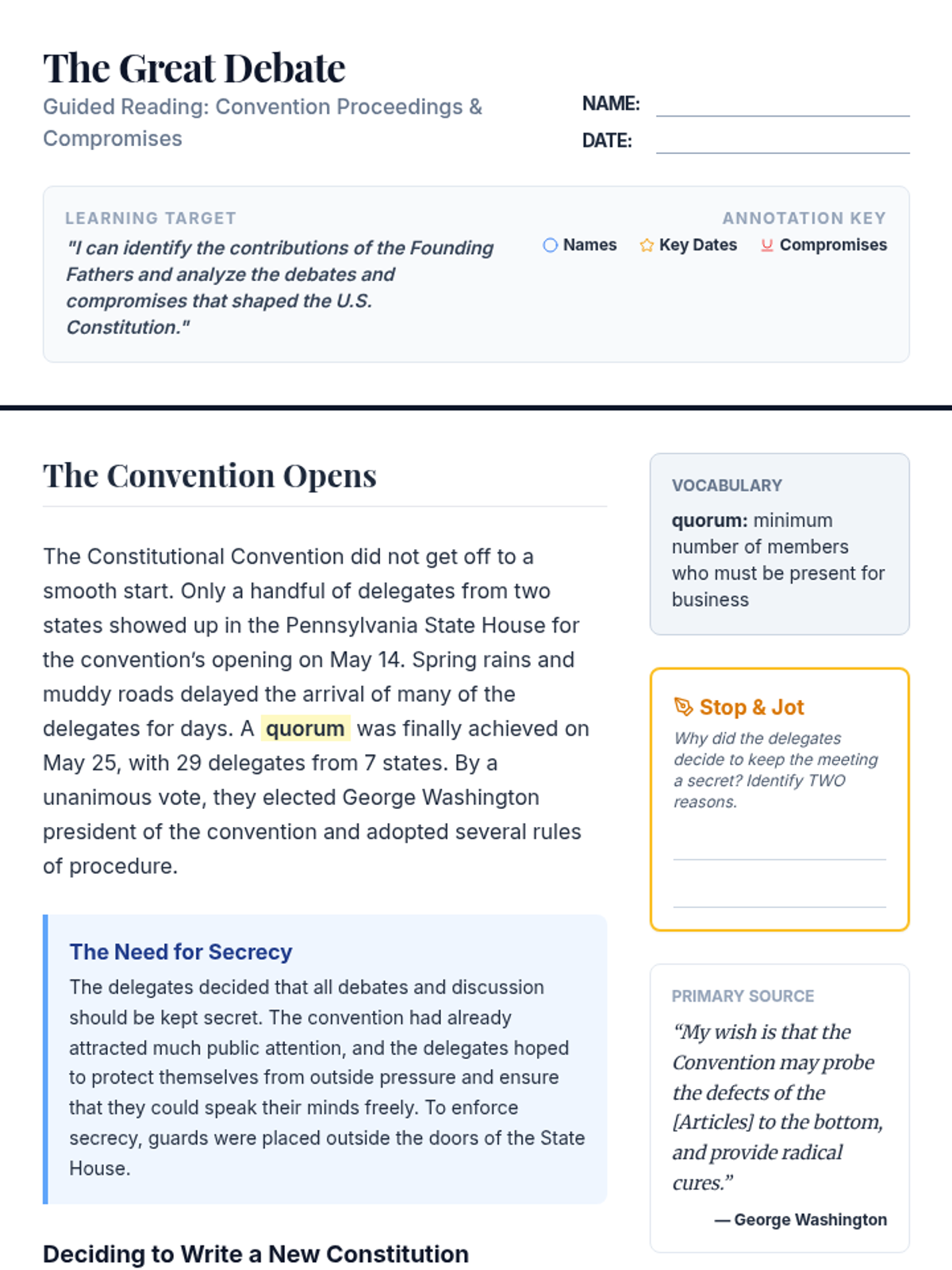 A comprehensive, station-based review lesson covering the Constitutional Convention, key compromises, Federalist vs. Anti-Federalist debates, and analysis of Federalist Papers 10 and 51. Designed for high school US Government students with heavy scaffolding for IEP and LEP learners.