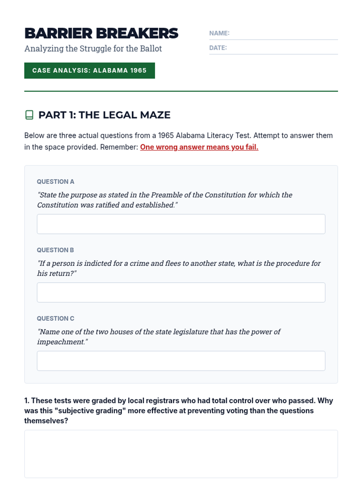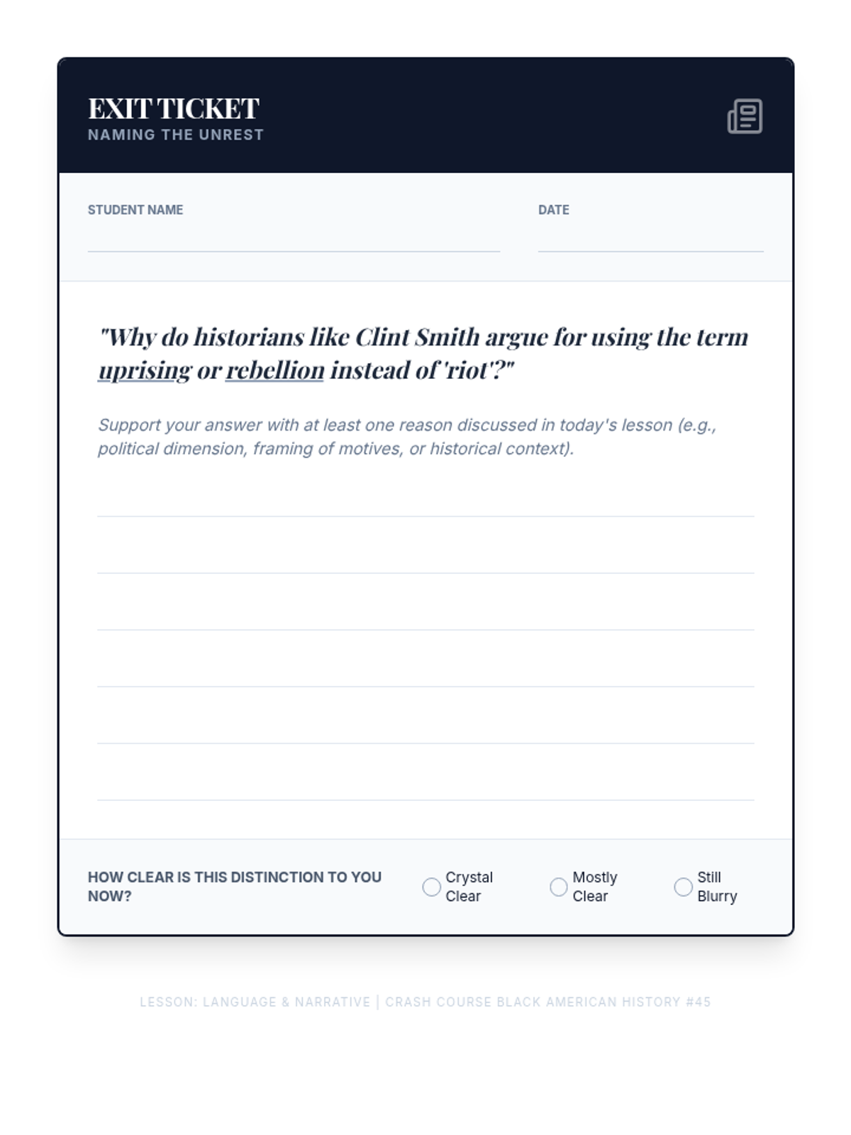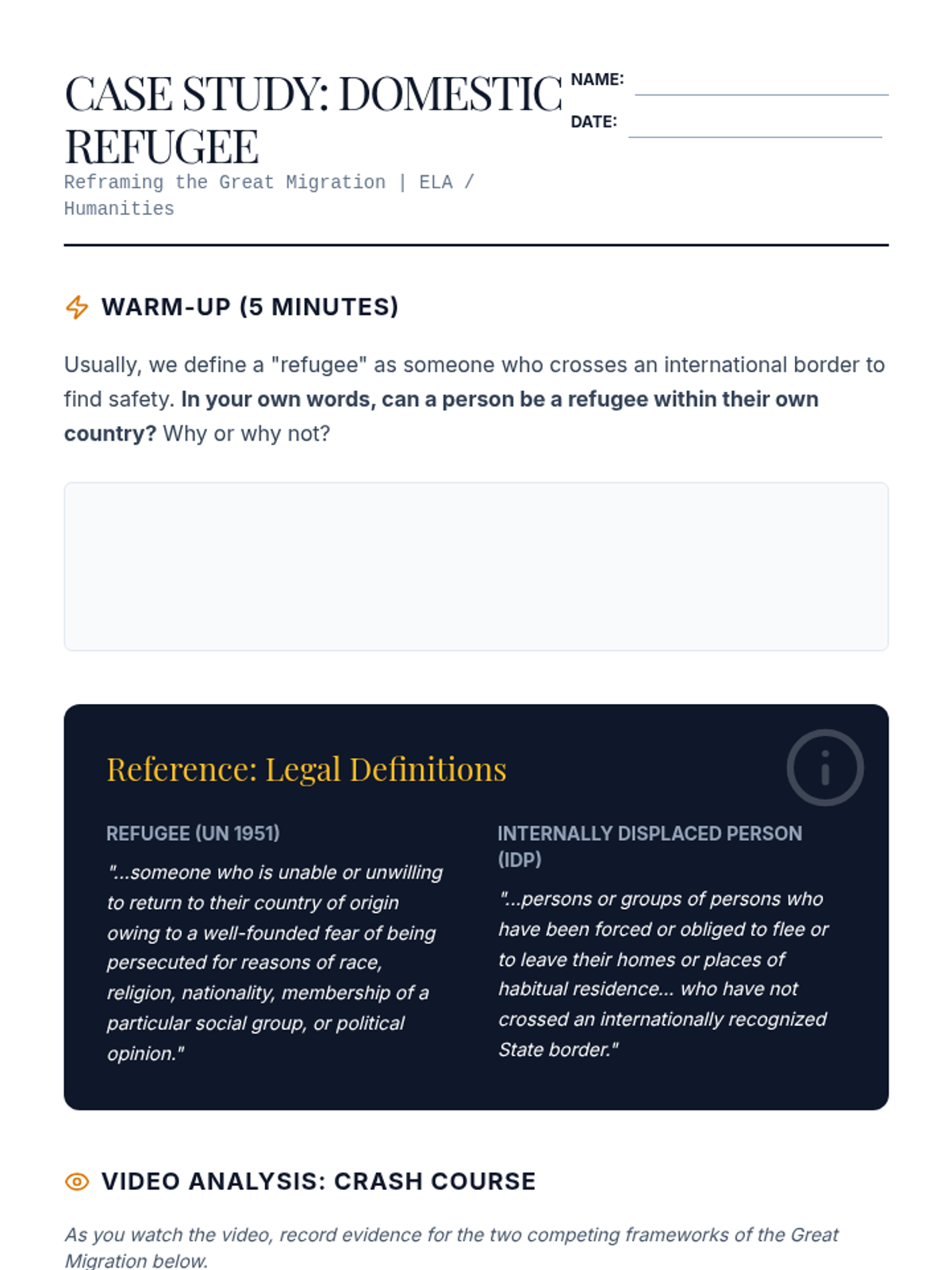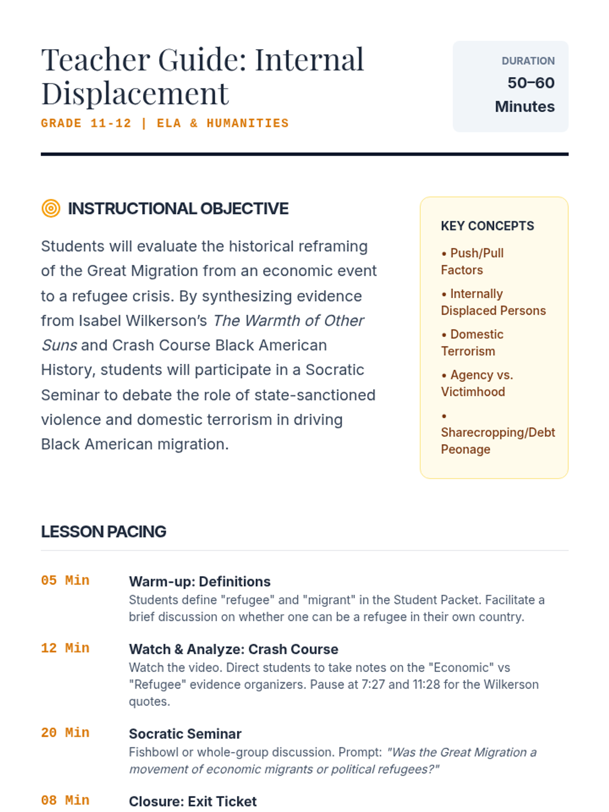 This lesson challenges 11th-12th grade students to evaluate the Great Migration through the lens of a 'refugee crisis' rather than just an economic move. Using Isabel Wilkerson's 'The Warmth of Other Suns' and Clint Smith's 'Crash Course Black American History', students will analyze push/pull factors and participate in a Socratic Seminar to debate the historical reframing of this domestic migration.