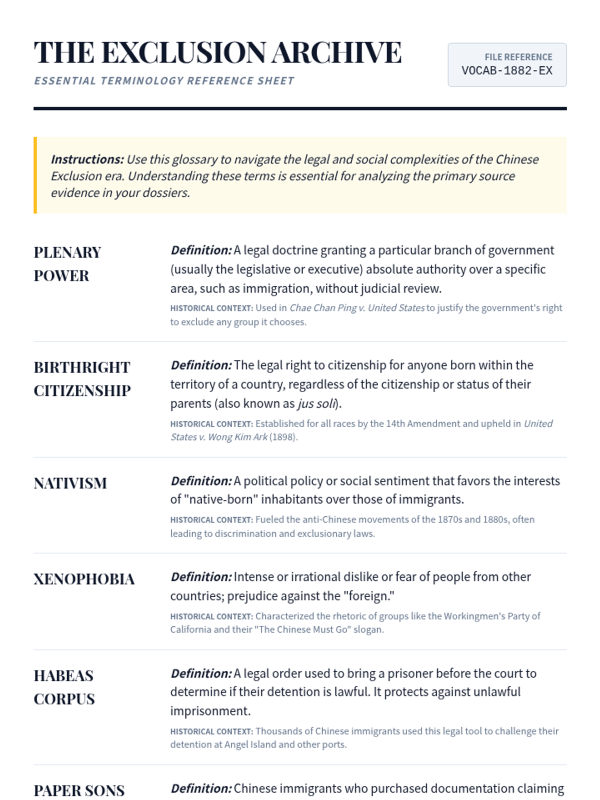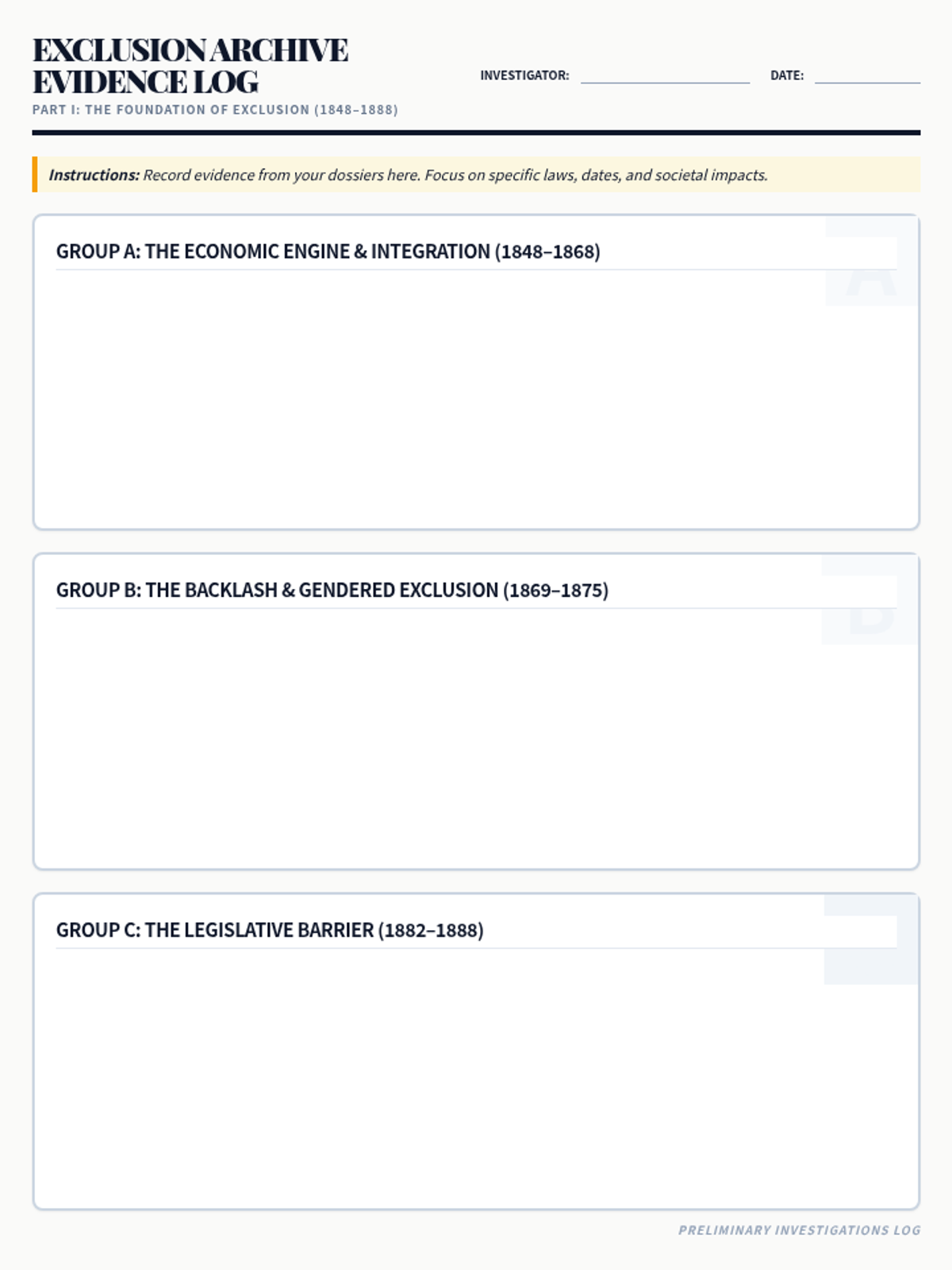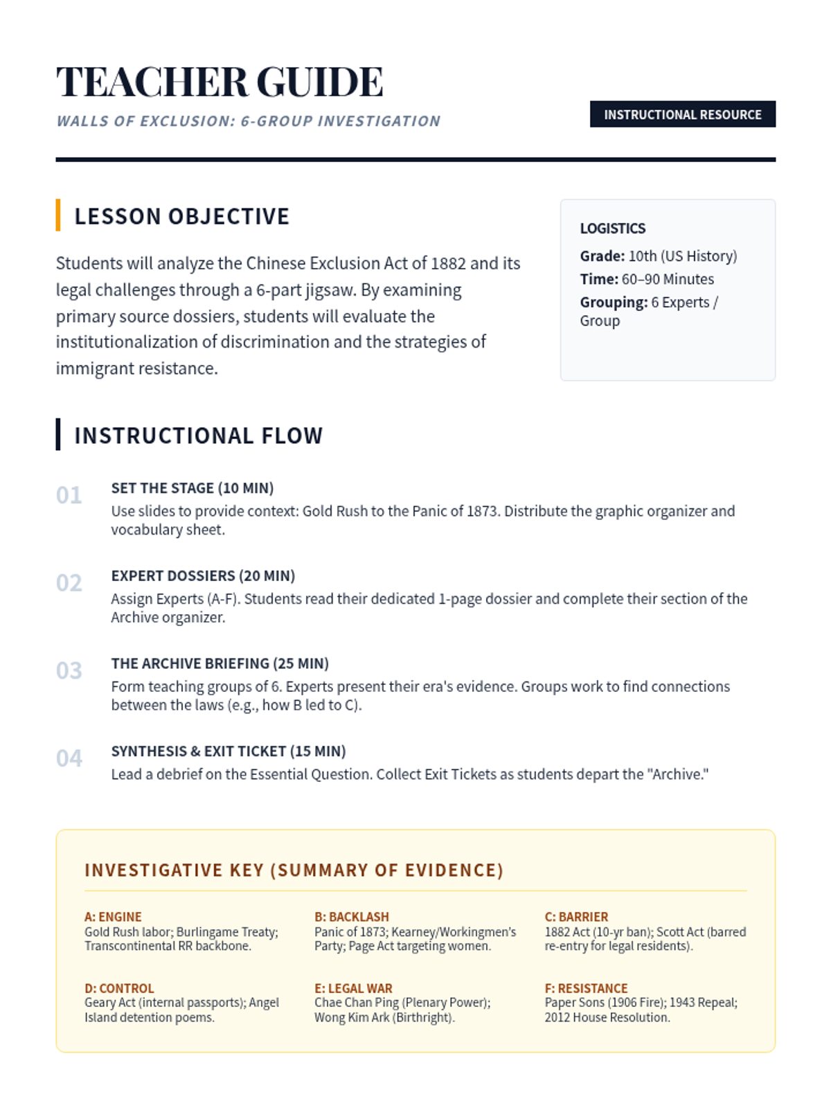 A comprehensive 6-group jigsaw reading activity for 10th-grade history students exploring the social, legal, and political dimensions of the Chinese Exclusion Act through primary sources and case law.