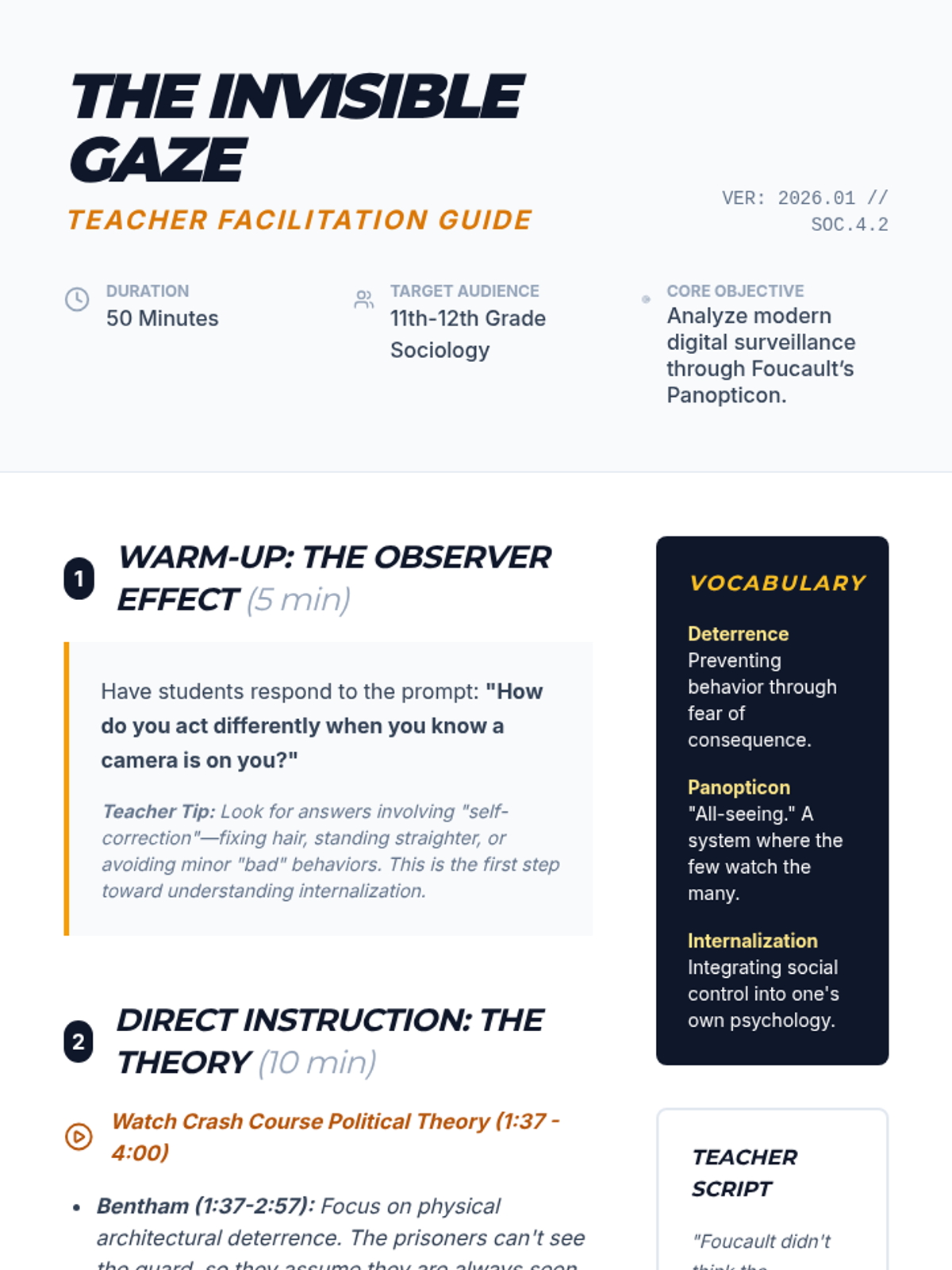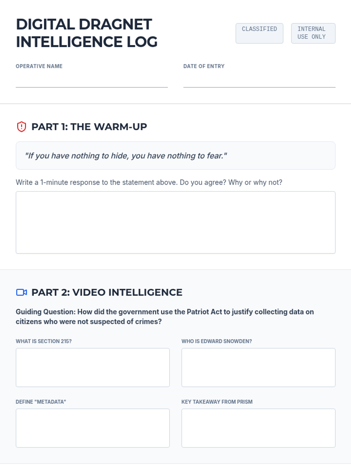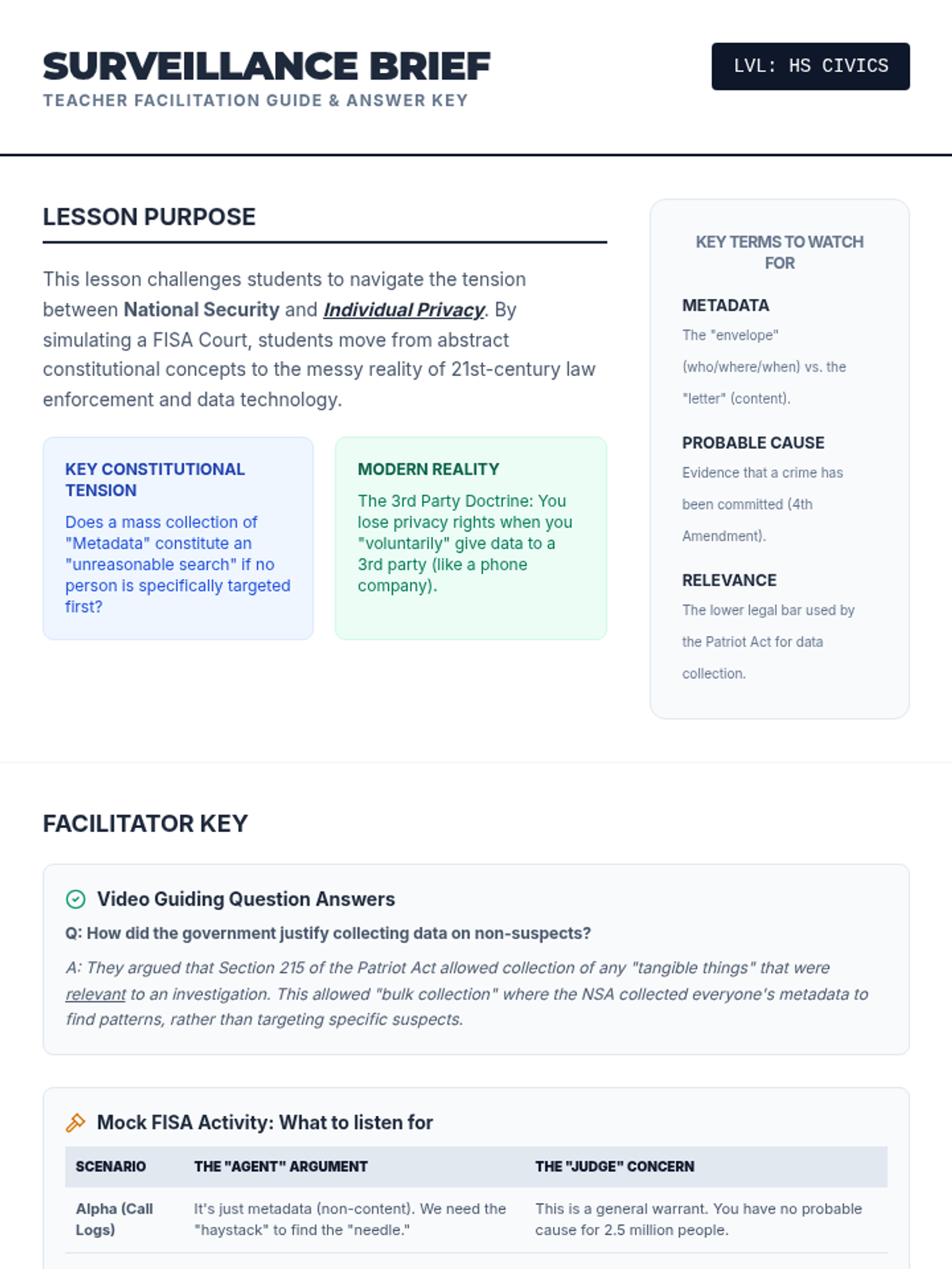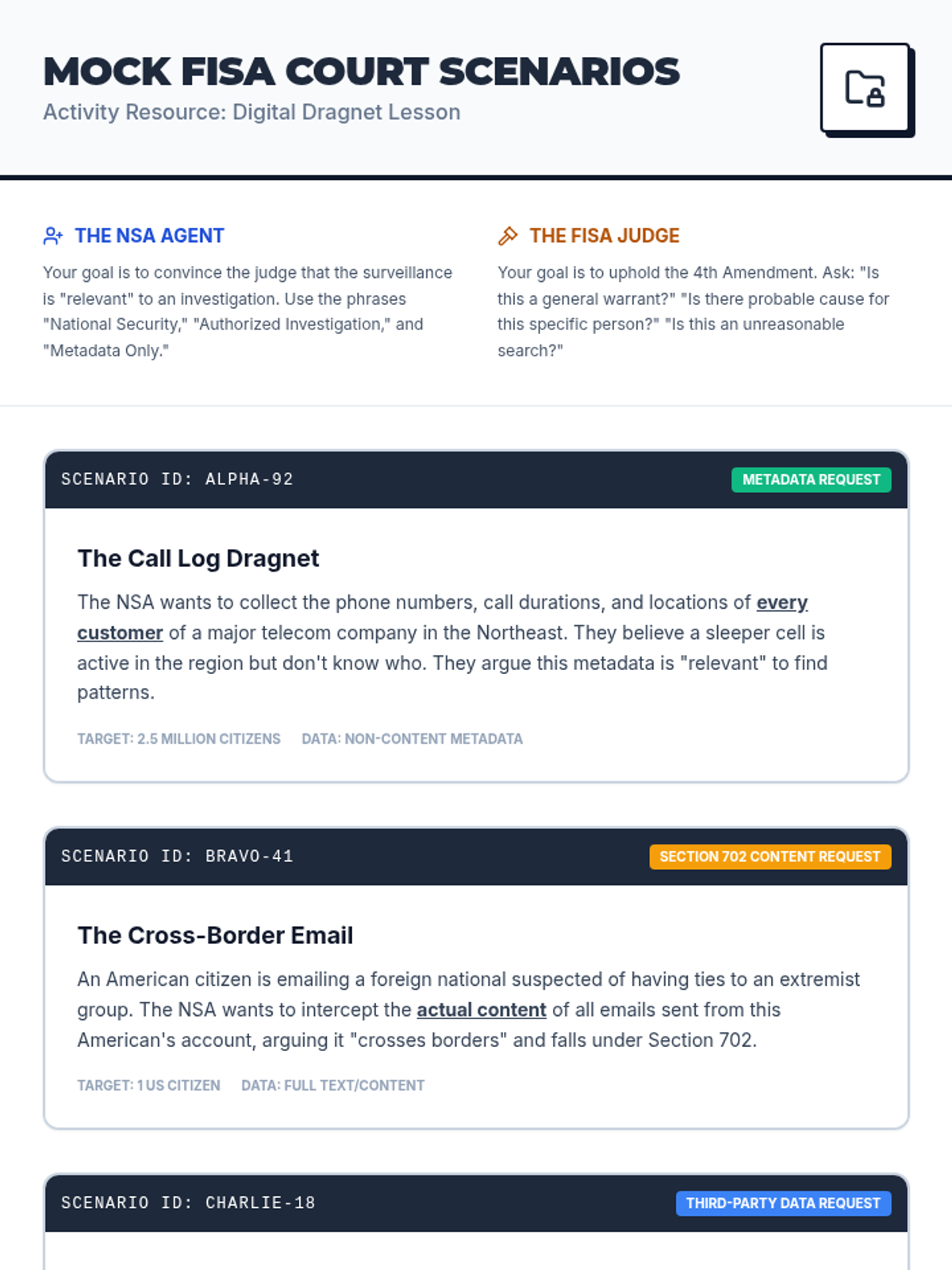 This lesson evaluates the constitutionality of mass surveillance programs like PRISM. Students explore the Fourth Amendment through a Mock FISA Court activity and analysis of Edward Snowden's leaks.