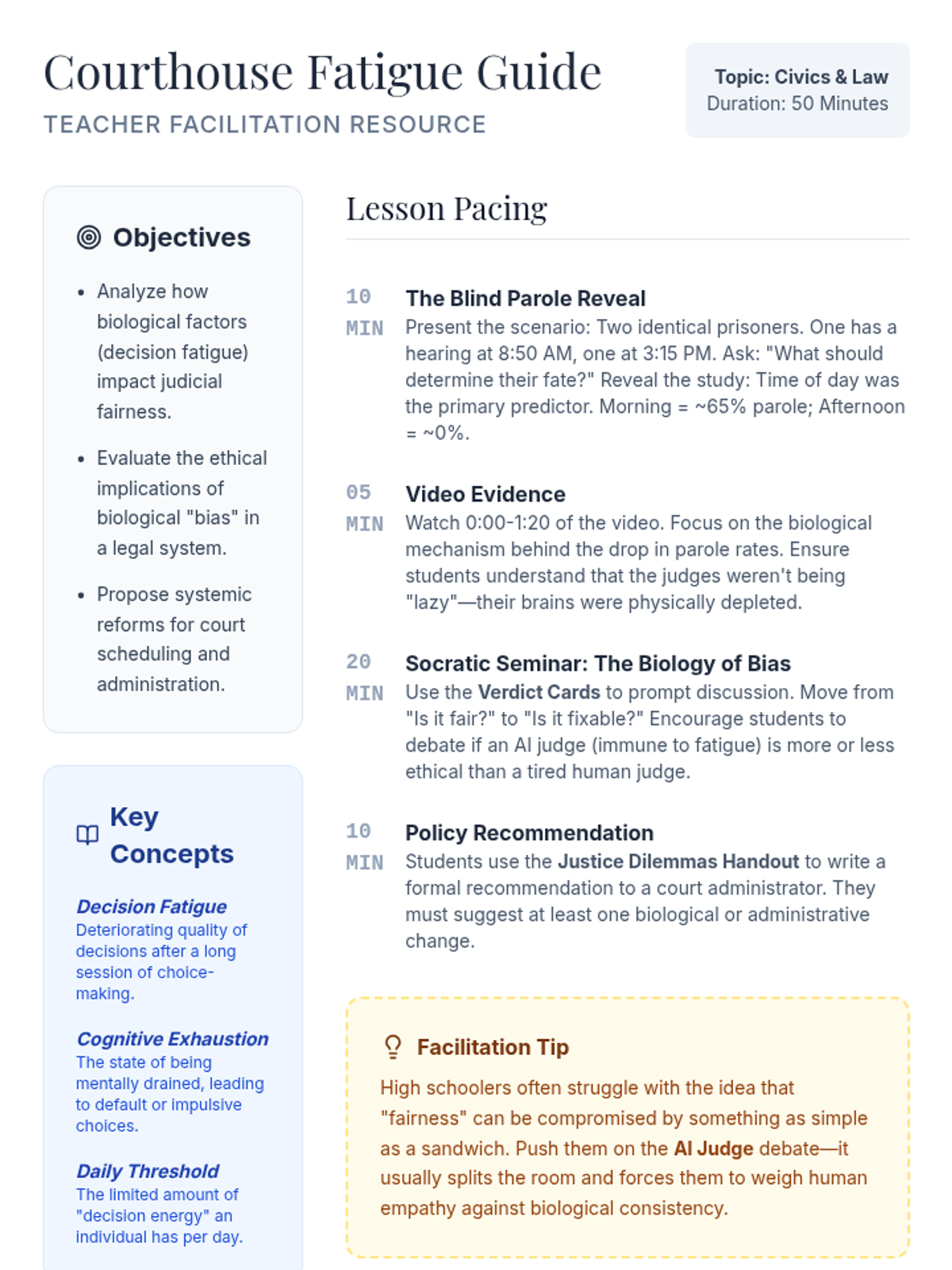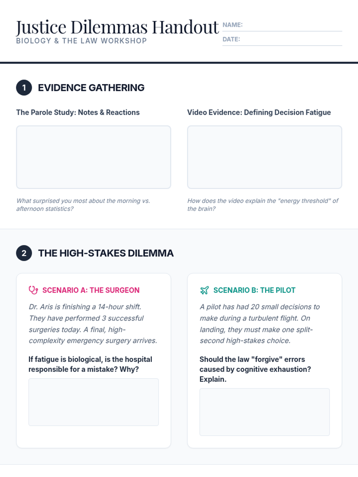Students explore the intersection of biology and law through the lens of 'decision fatigue' in judicial rulings, culminating in a Socratic seminar and policy proposal for systemic reform.