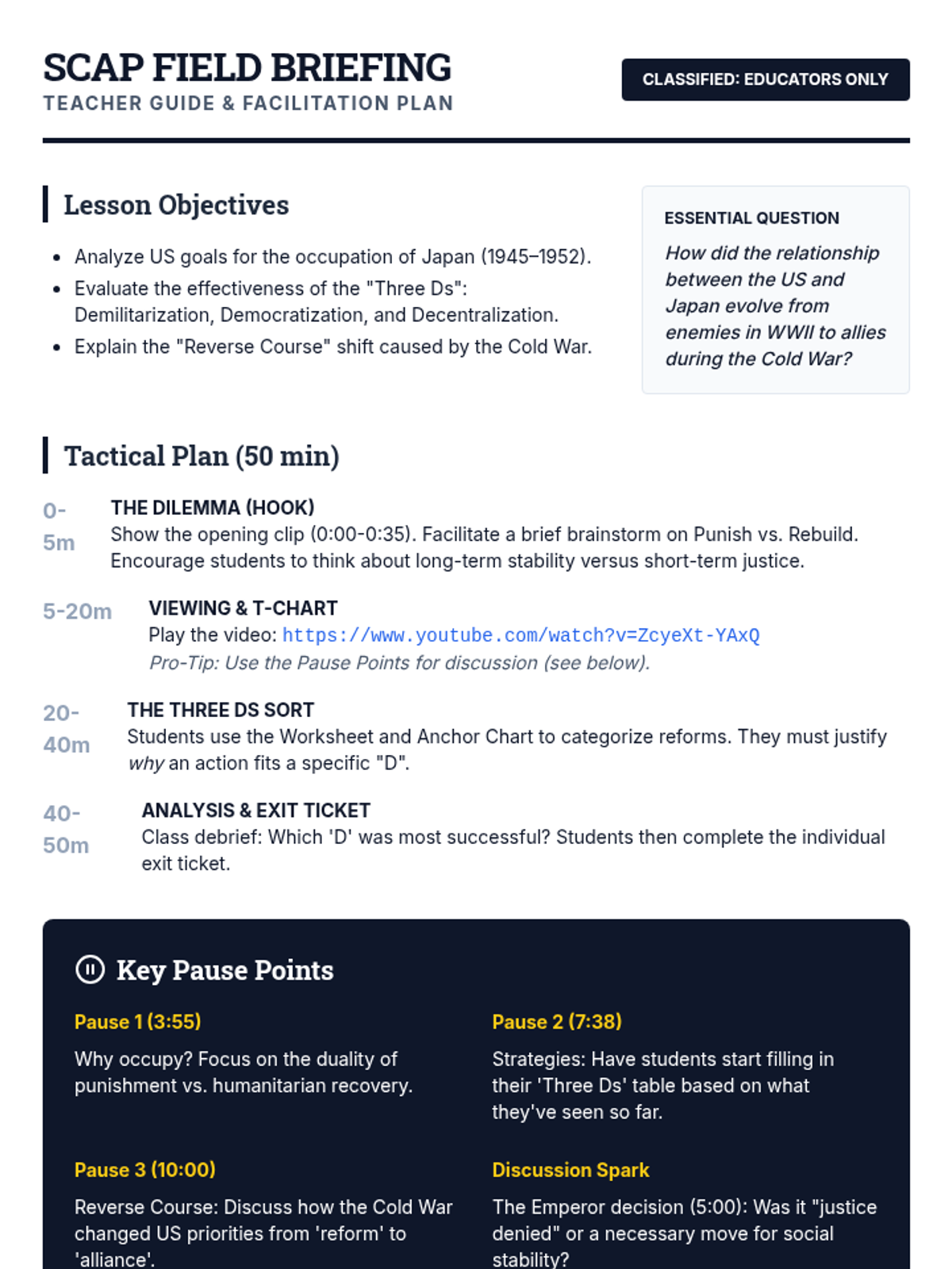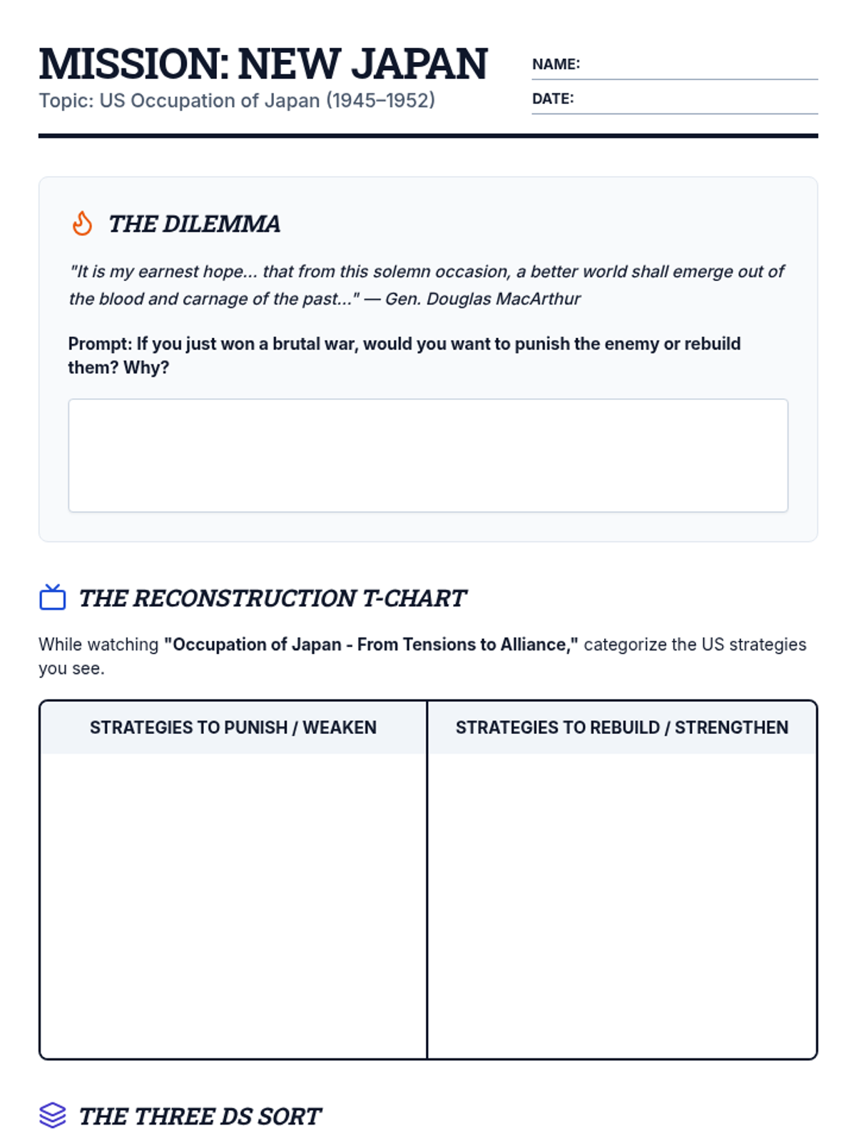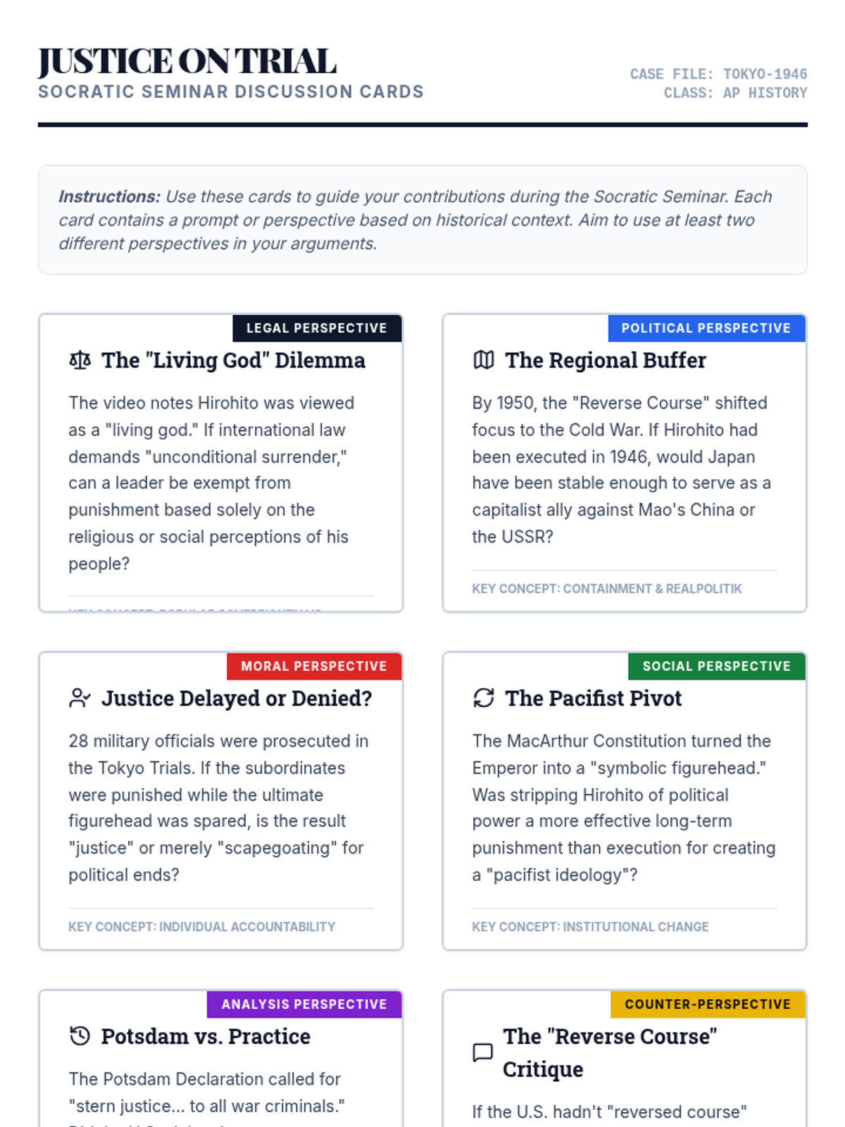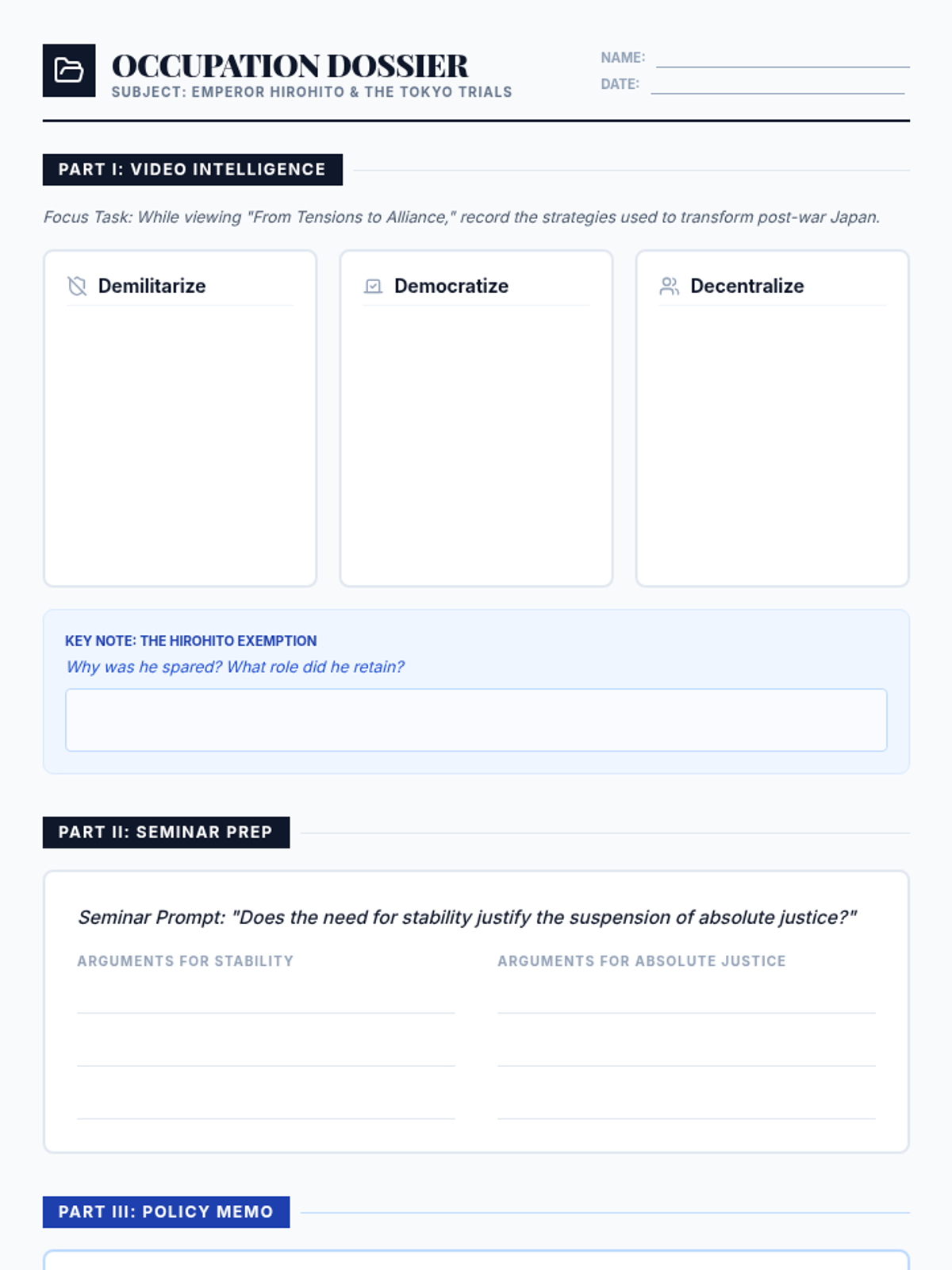 This lesson explores the complex ethical and political decisions surrounding the U.S. occupation of Japan, focusing specifically on the decision to exempt Emperor Hirohito from the Tokyo War Crimes Trials. Students will analyze the tension between pursuing absolute justice and ensuring regional stability during the early Cold War.