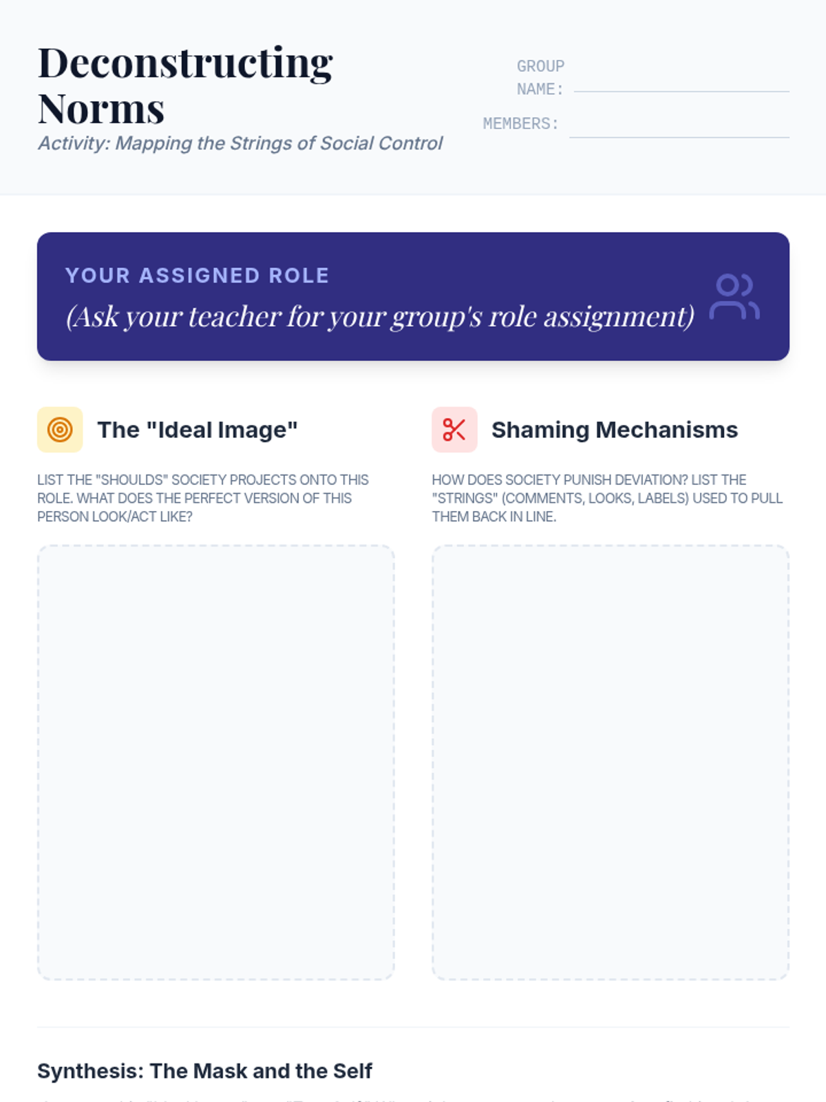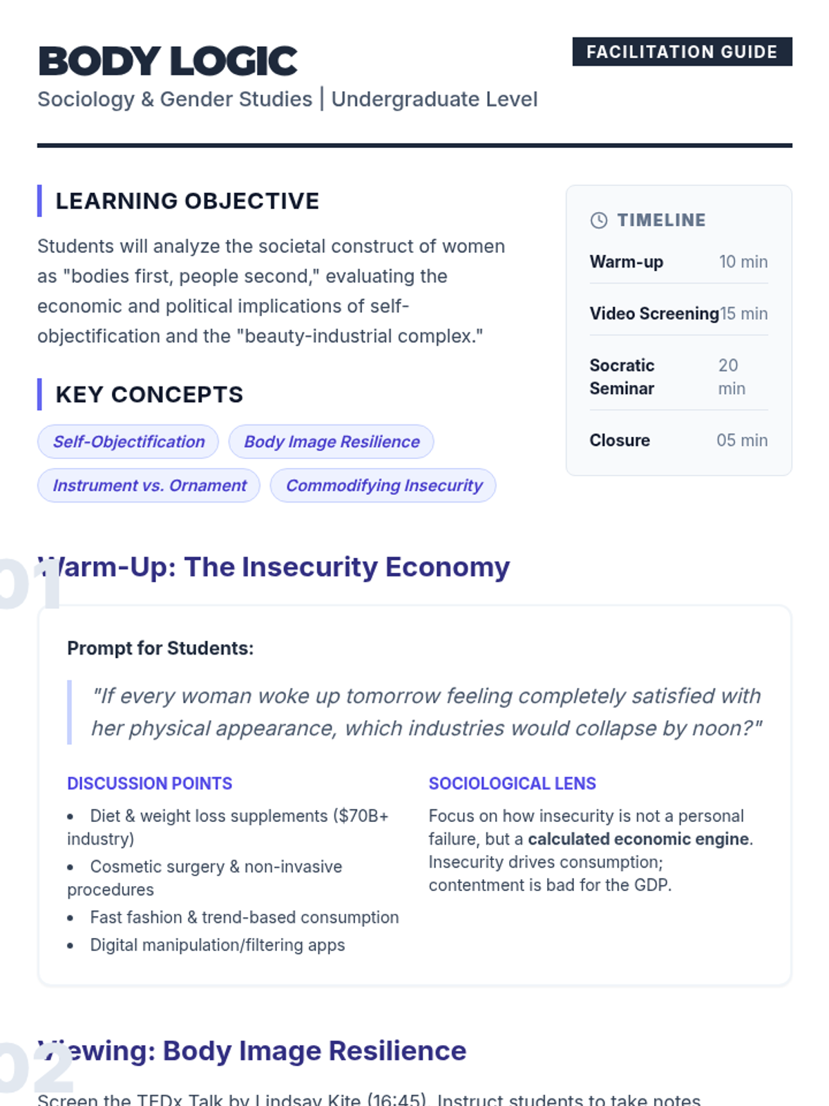 A sociology-focused lesson examining the objectification of women's bodies through the lens of 'Body Image Resilience.' Students analyze how economic systems benefit from self-objectification and explore structural alternatives to beauty-centric social values.