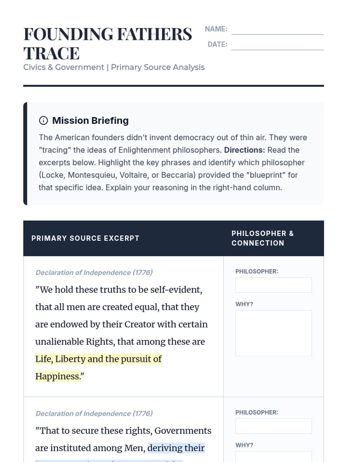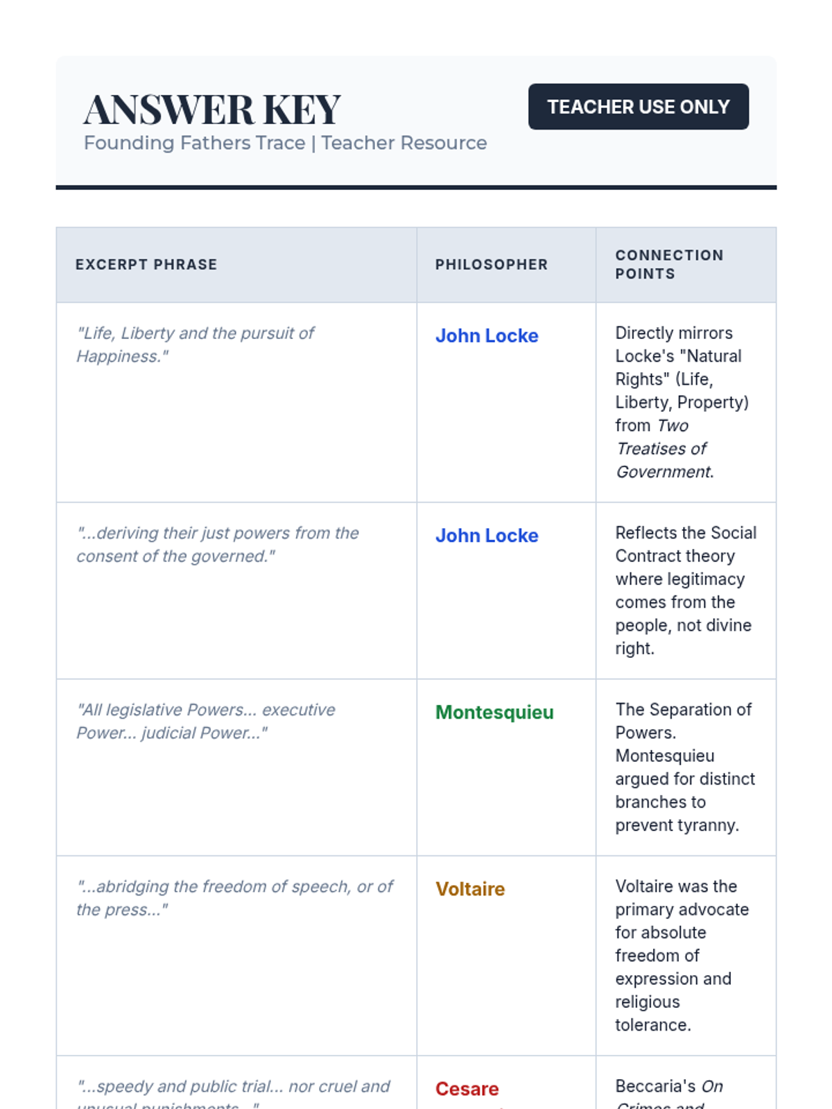 Students will investigate the philosophical origins of the American government by tracing Enlightenment ideas from Locke, Montesquieu, Voltaire, and Beccaria through the Declaration of Independence and the Bill of Rights.