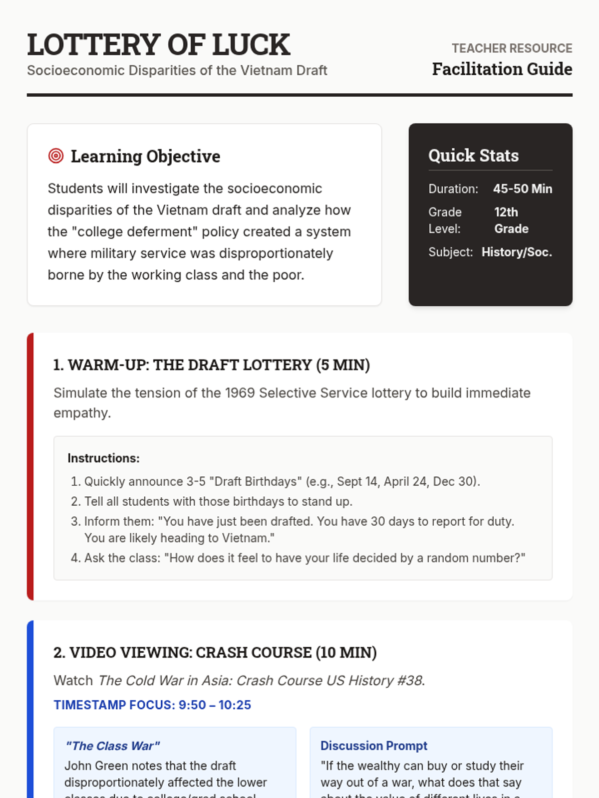 This lesson explores the socioeconomic inequalities of the Vietnam War draft, specifically focusing on how college deferments created a 'class war' dynamic and the ethical implications of wartime privilege.