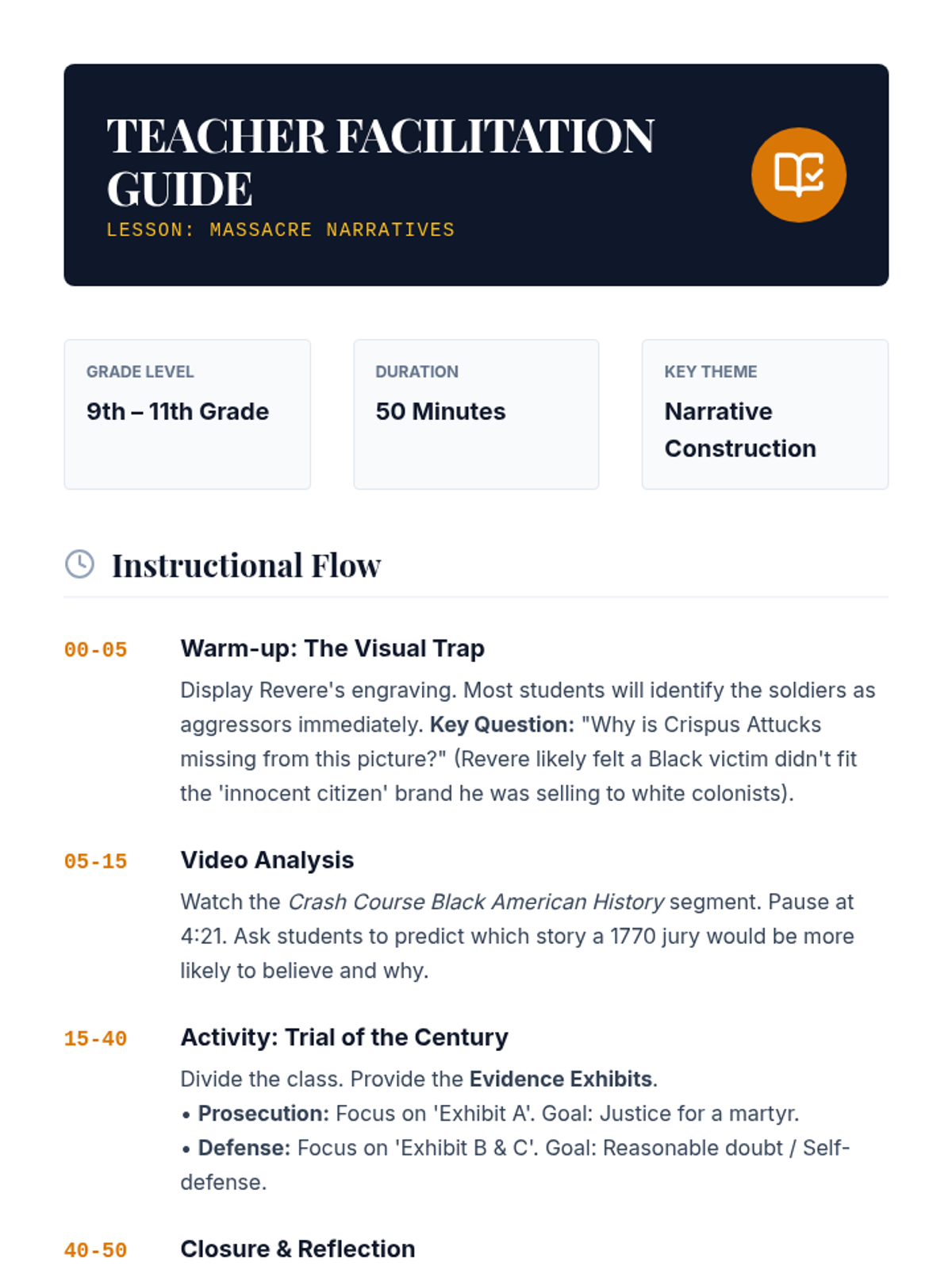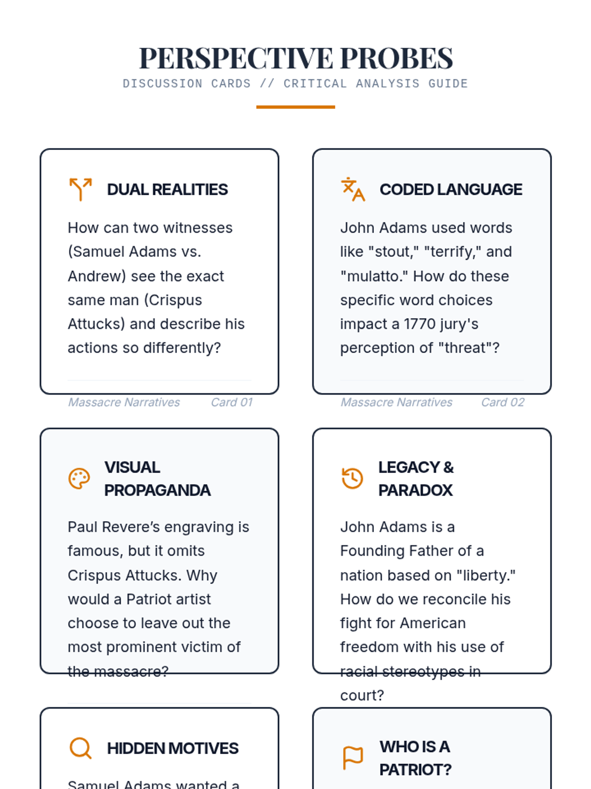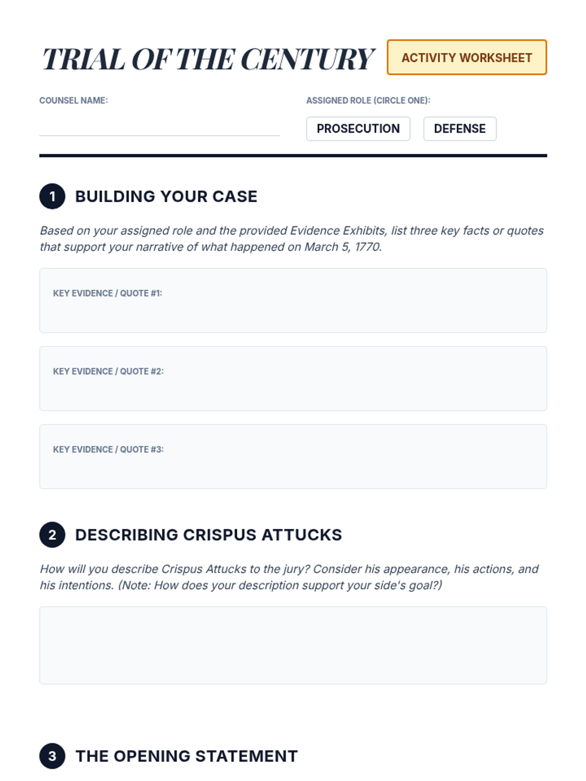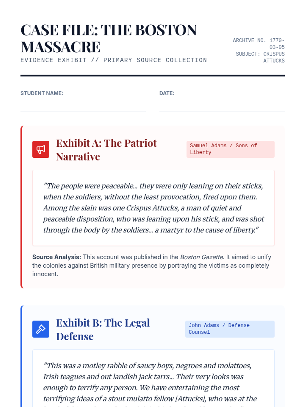 In this lesson, students analyze the conflicting primary source accounts of the Boston Massacre, focusing on the role of Crispus Attucks and how John Adams used racial stereotypes to construct a defense for the British soldiers. Students participate in a 'Trial of the Century' activity to evaluate how historical narratives are built and manipulated.