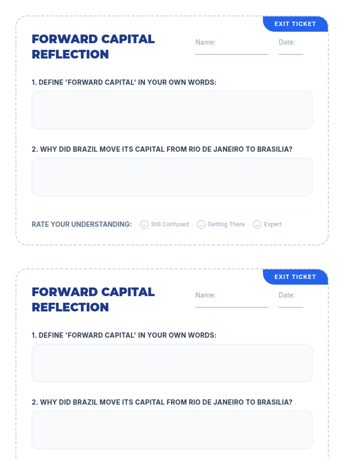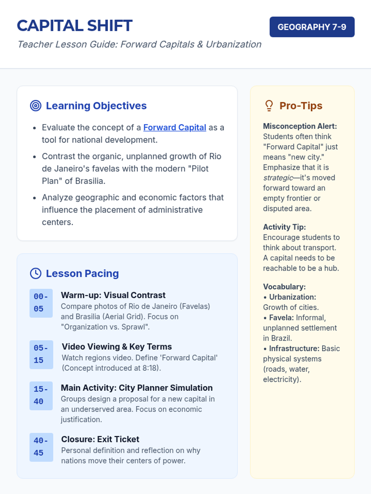 This lesson explores the concept of a 'Forward Capital' through the lens of Brazil's urbanization. Students will contrast the crowded favelas of Rio de Janeiro with the planned city of Brasilia and participate in a simulation to design their own forward capital to stimulate regional growth.