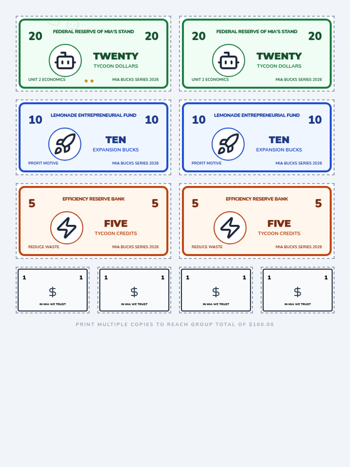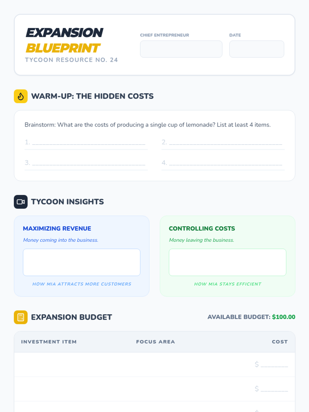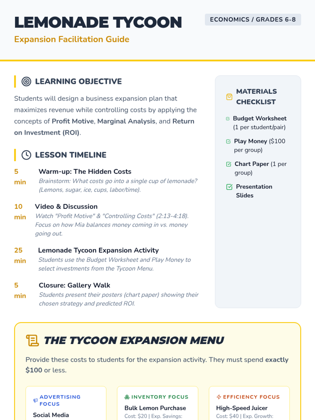 Students step into the role of an entrepreneur to expand Mia the Robot's lemonade business. They will analyze the profit motive, control costs, and make strategic investment decisions using a $100 budget to maximize their return on investment.